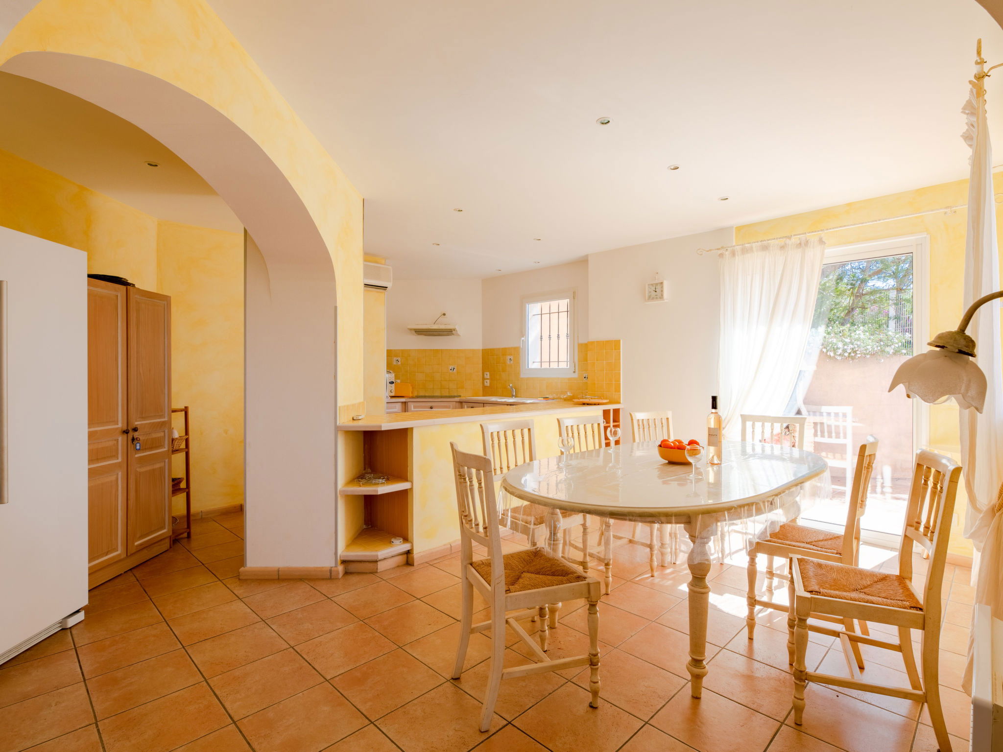 "La Figuière", 5-room house 180 m2 on 3 levels. Bright, tasteful furnishings: living/dining room with dining table, satellite TV, DVD and air conditioning. Exit to the terrace. 1 room with 1 french bed (160 cm), bath/WC. Open kitchen (oven, dishwasher, 3 induction hot plates, toaster, microwave, freezer, electric coffee machine). Sep. WC. On the lower ground floor: 1 room with 2 x 2 bunk beds, shower. Upper floor: 1 room with 2 beds, shower/WC and air conditioning. Exit to the balcony. 1 room with 1 french bed (160 cm), shower/WC and air conditioning. Exit to the balcony. Electric heating. Balcony, terrace partly roofed. Terrace furniture, barbecue, deck chairs. Facilities: washing machine, dryer, iron. Internet (WiFi, free). Please note: smoke alarm. When booking at the rate for 6 persons not available: the bedroom with bunk bed and shower. Bed layout is flexible. There are more sleeping options available than the maximum number of people allowed which may, however, not be exceeded. 83115000475DP
