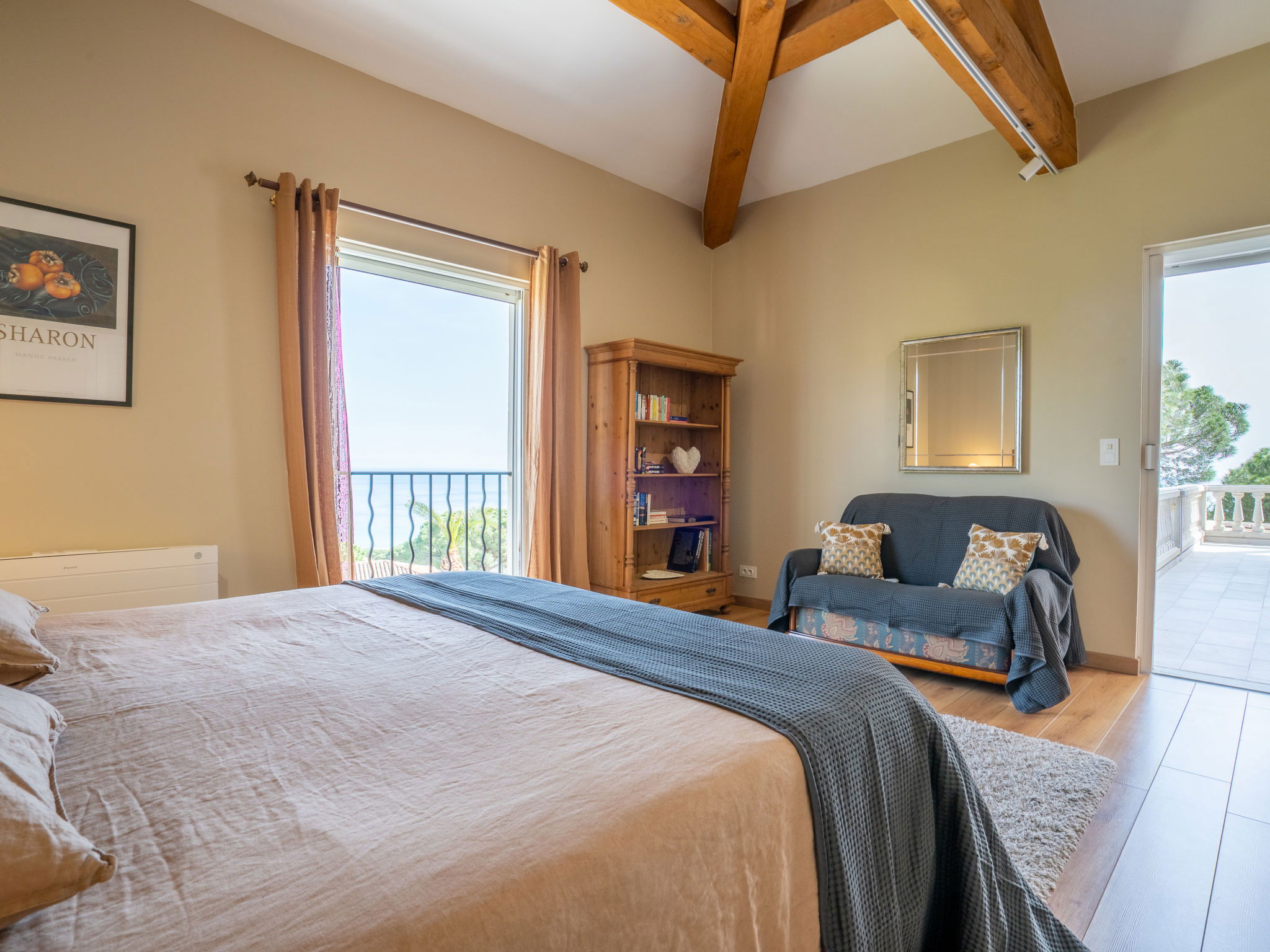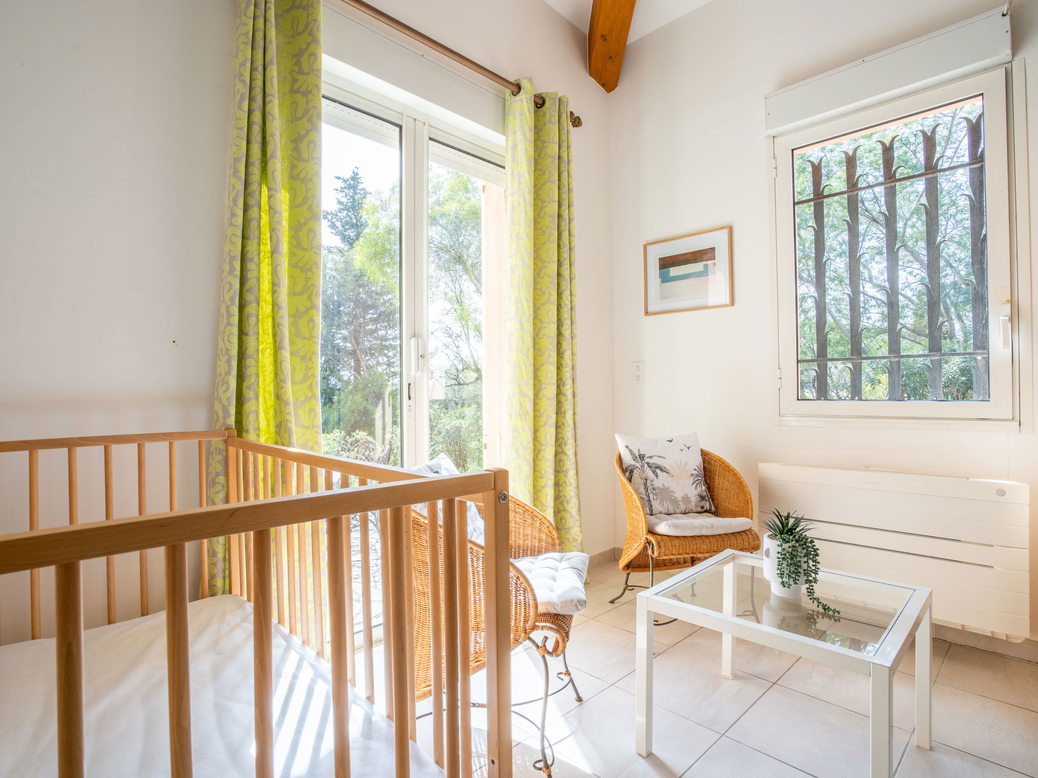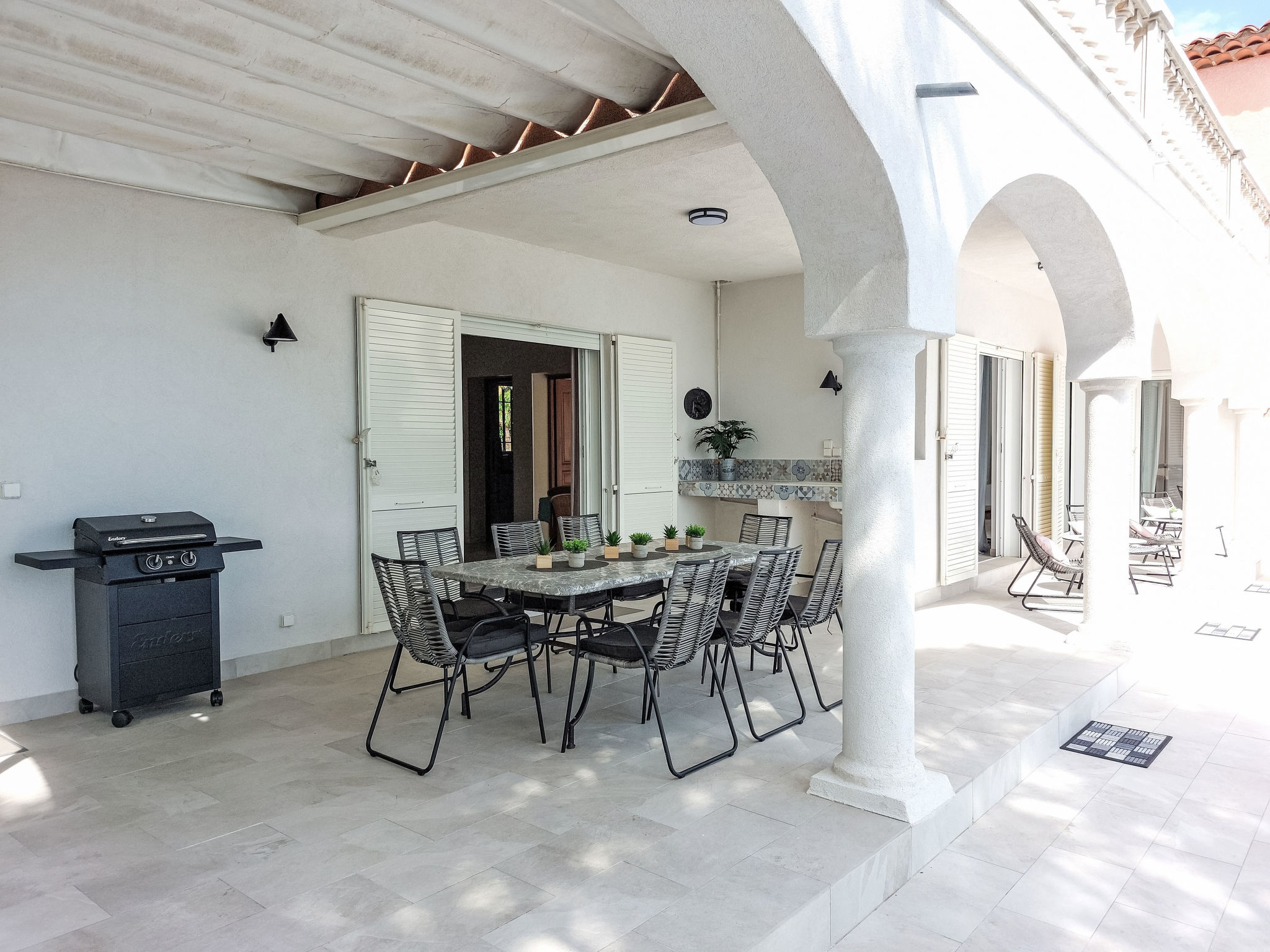 "Cacharel", 5-room house 290 m2 on 2 levels. Modern and tasteful furnishings: large living/dining room with satellite TV and hi-fi system. Exit to the terrace. 1 room with 1 french bed (180 cm). Exit to the terrace. Kitchen (oven, dishwasher, 4 ceramic glass hob hotplates, toaster, kettle, microwave, freezer, electric coffee machine) with small dining table. Exit to the terrace. Sep. WC. Upper floor: 2 rooms, each room with 1 french bed (180 cm). Exit to the balcony. 1 room with 2 beds. Exit to the balcony. Bath/shower, shower/WC, sep. WC, double hand-basin. Heating, air-conditioning. Parquet floors. Large terrace partly roofed, east facing position, small terrace, west facing position. Terrace furniture, electric barbecue, deck chairs. View of the sea. Facilities: washing machine, iron, baby cot. Internet (WiFi, free). Please note: non-smoking house. Smoke alarm. 83115001180SX