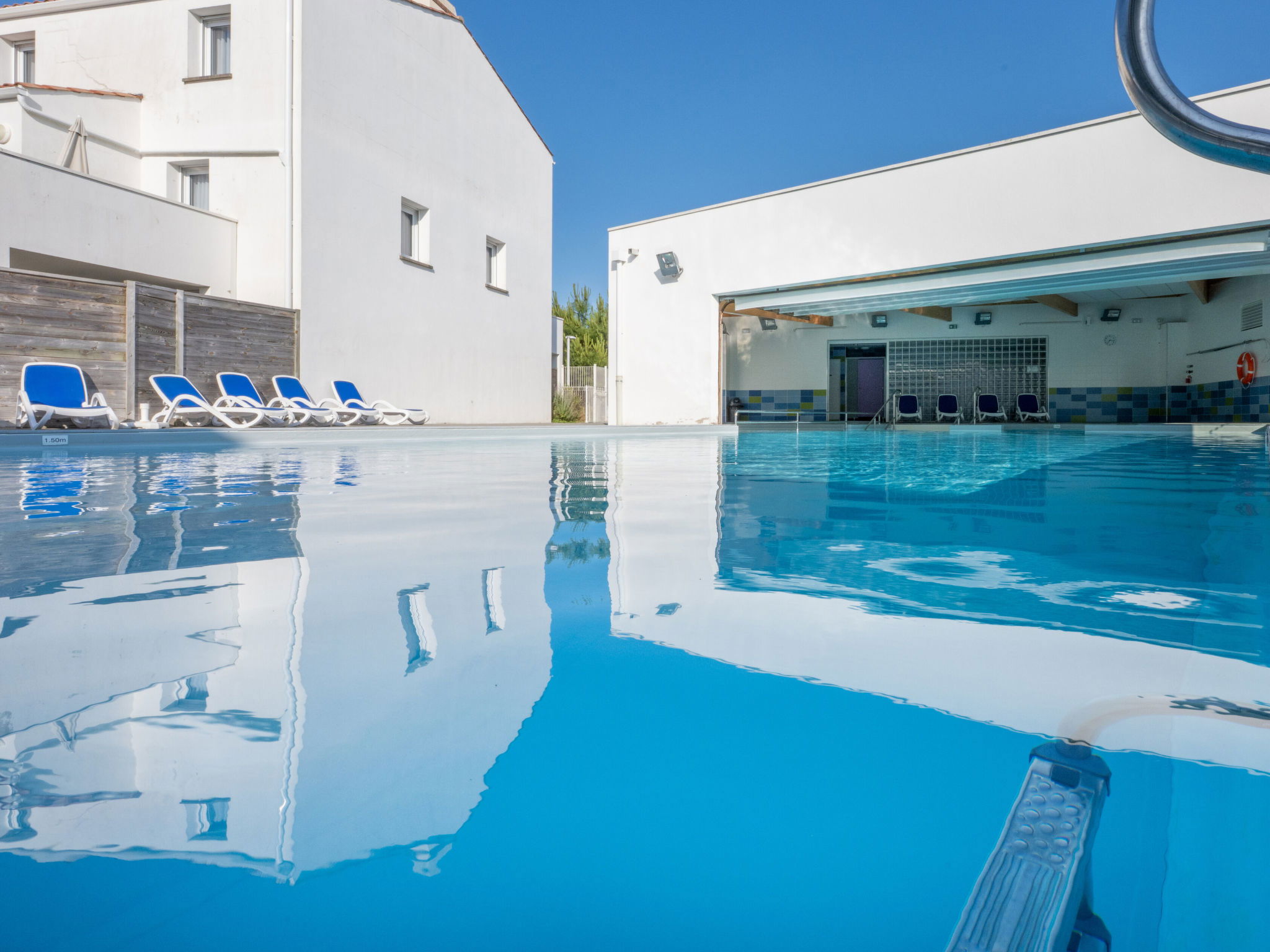 Resort "Le Domaine des Pins", 3 storeys, built in 2016. 87 apartments in the residence. 1.5 km from the centre of Noirmoutier, 44 km from the centre of Challans, 91 km from the centre of Nantes, 400 m from the sea, 700 m from the beach. For shared use: property 10'000 m2 (fenced), indoor pool heated, fenced (15 x 8 m, depth 145 - 155 cm, seasonal availability: 15.Apr. - 31.Oct.) with internal staircase. Children's pool, children's playground. In the complex: reception, fitness room, steam room (extra). Table tennis, washing machine, tumble dryer (for shared use, extra). Parking. Shop 1.5 km, bus stop " Noirmoutier - Gare Routière" 1.9 km, sandy beach 400 m. Nearby attractions: Ecoles de voile au Fort St Pierre, Sports de glisse (paddle, char à voile), Pêche à pied tout autour de l’ile, Pistes cyclables (80 km de piste), Randonnées. Please note: the photograph shows a typical example. The holiday properties may differ in living space, floorplan, equipment and furnishing.