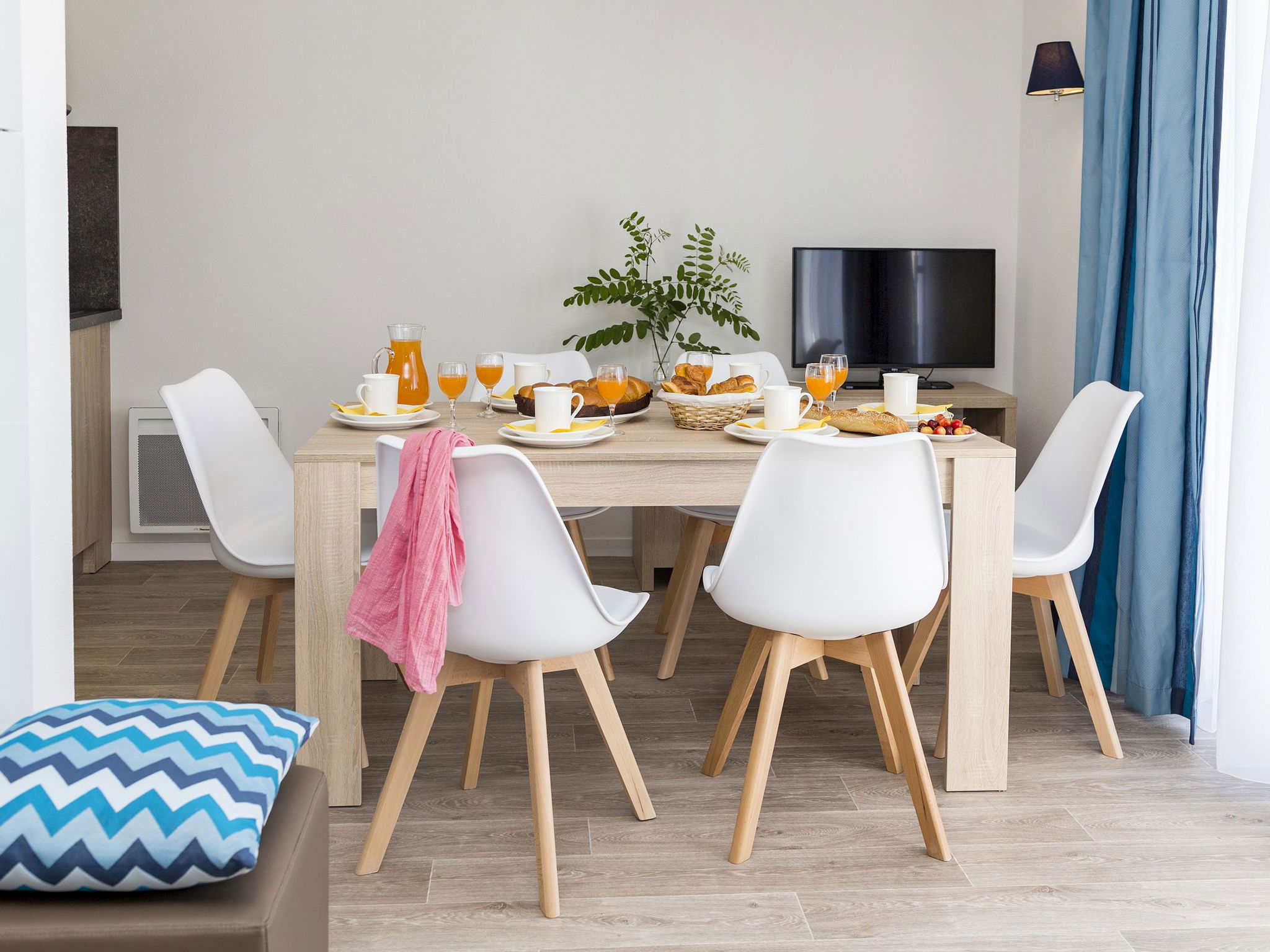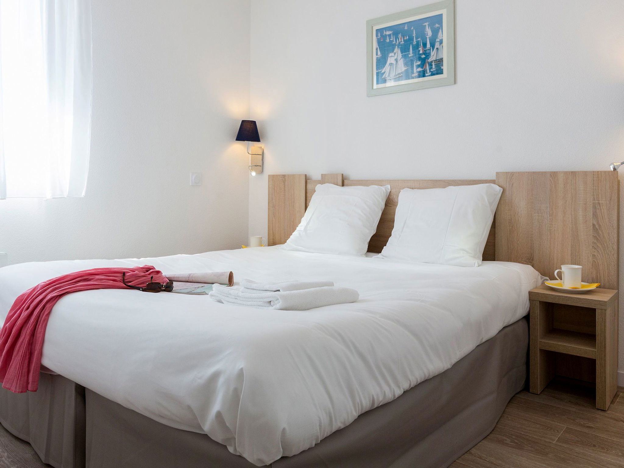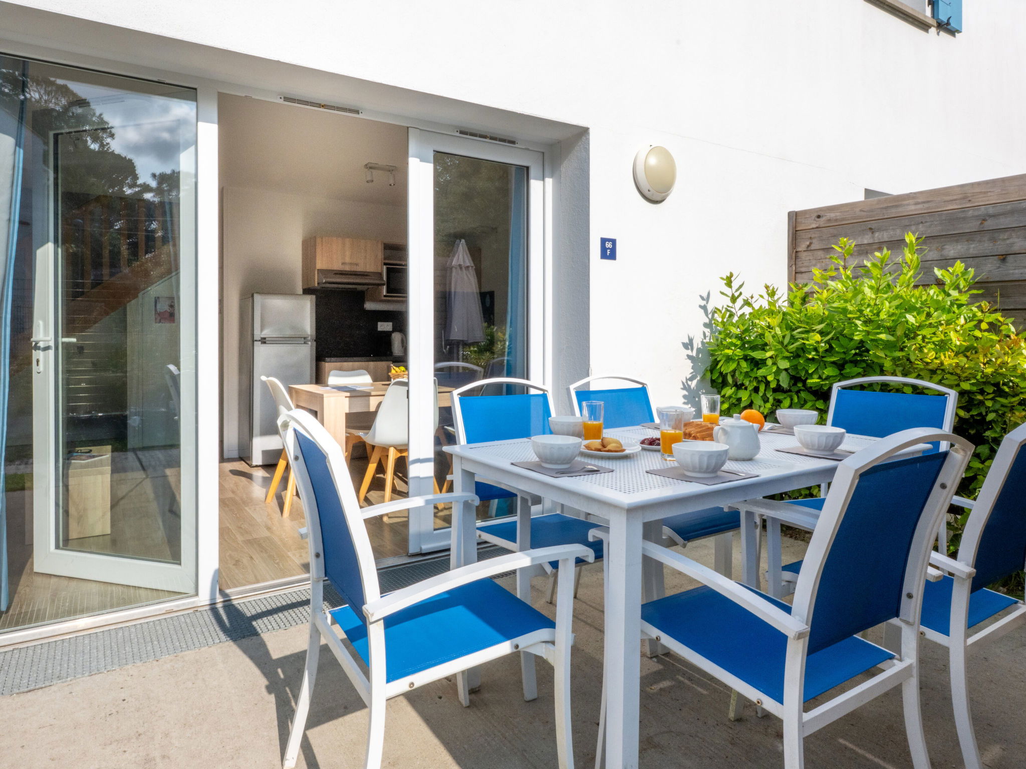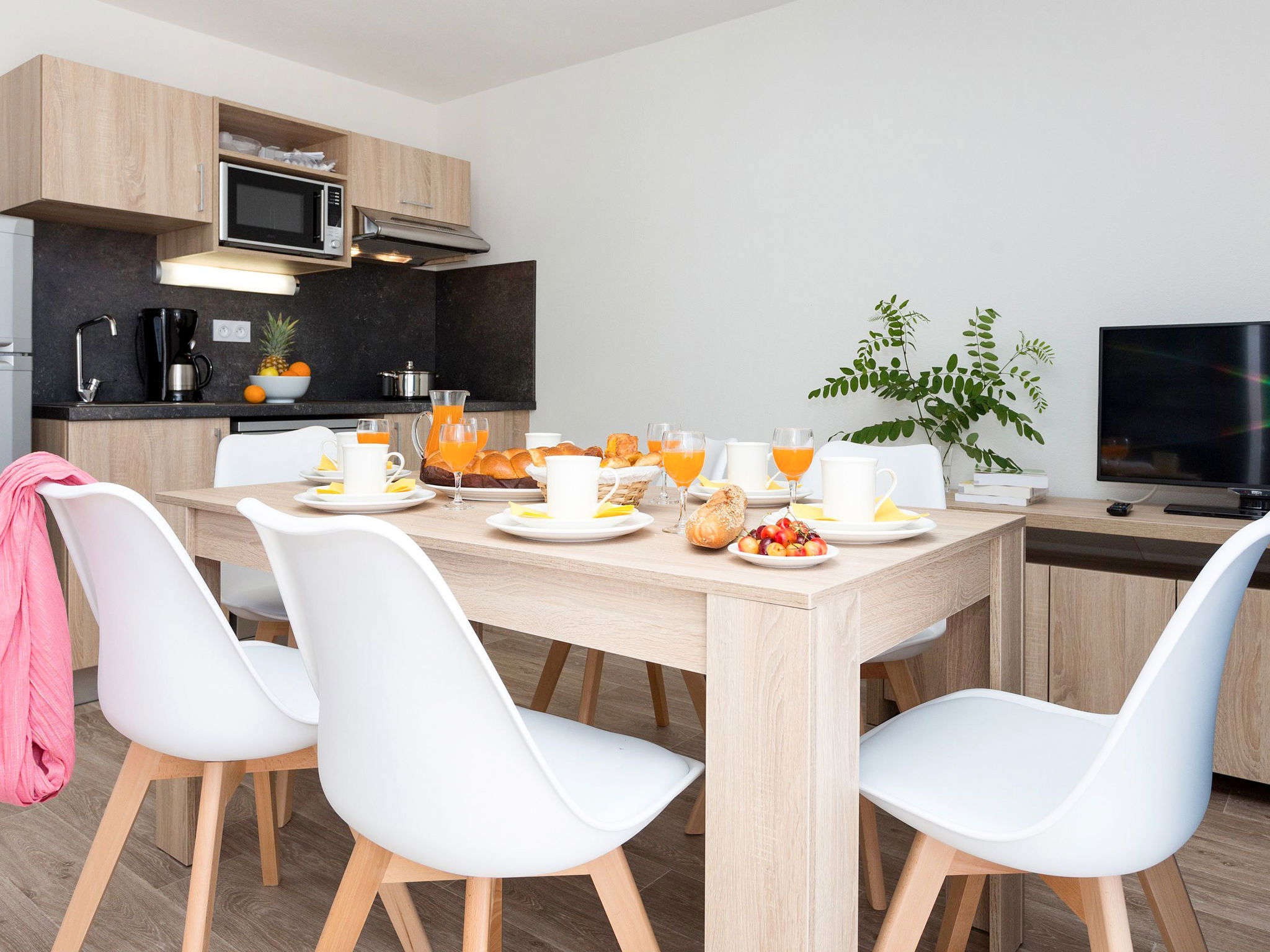 " Odalys Collection Le Domaine des Pins", 3-room apartment 56 m2 on 2 levels. Modern furnishings: living/sleeping room with 1 bed, 1 double sofabed, dining table and satellite TV (flat screen). Open kitchen (dishwasher, 4 ceramic glass hob hotplates, toaster, kettle, electric coffee machine, combination microwave). Upper floor: 1 double bedroom. 1 room with 1 x 2 bunk beds. Bath/WC. Electric heating. Balcony or terrace. Balcony furniture. Facilities: children's high chair, baby cot, hair dryer. Internet (WiFi, free). Parking. Please note: non-smokers only. Maximum 2 pets/ dogs allowed. Smoke alarm, fire extinguisher.