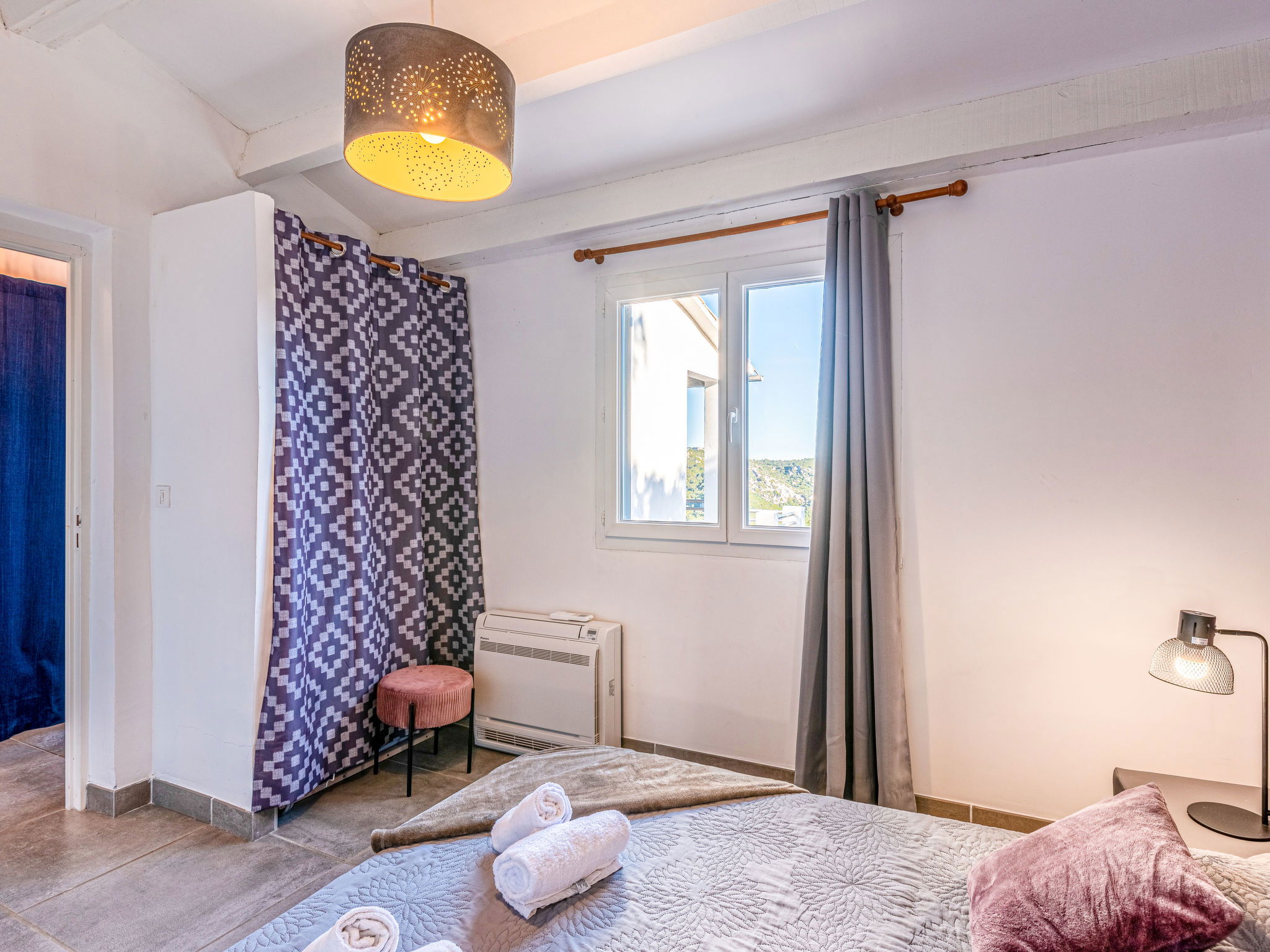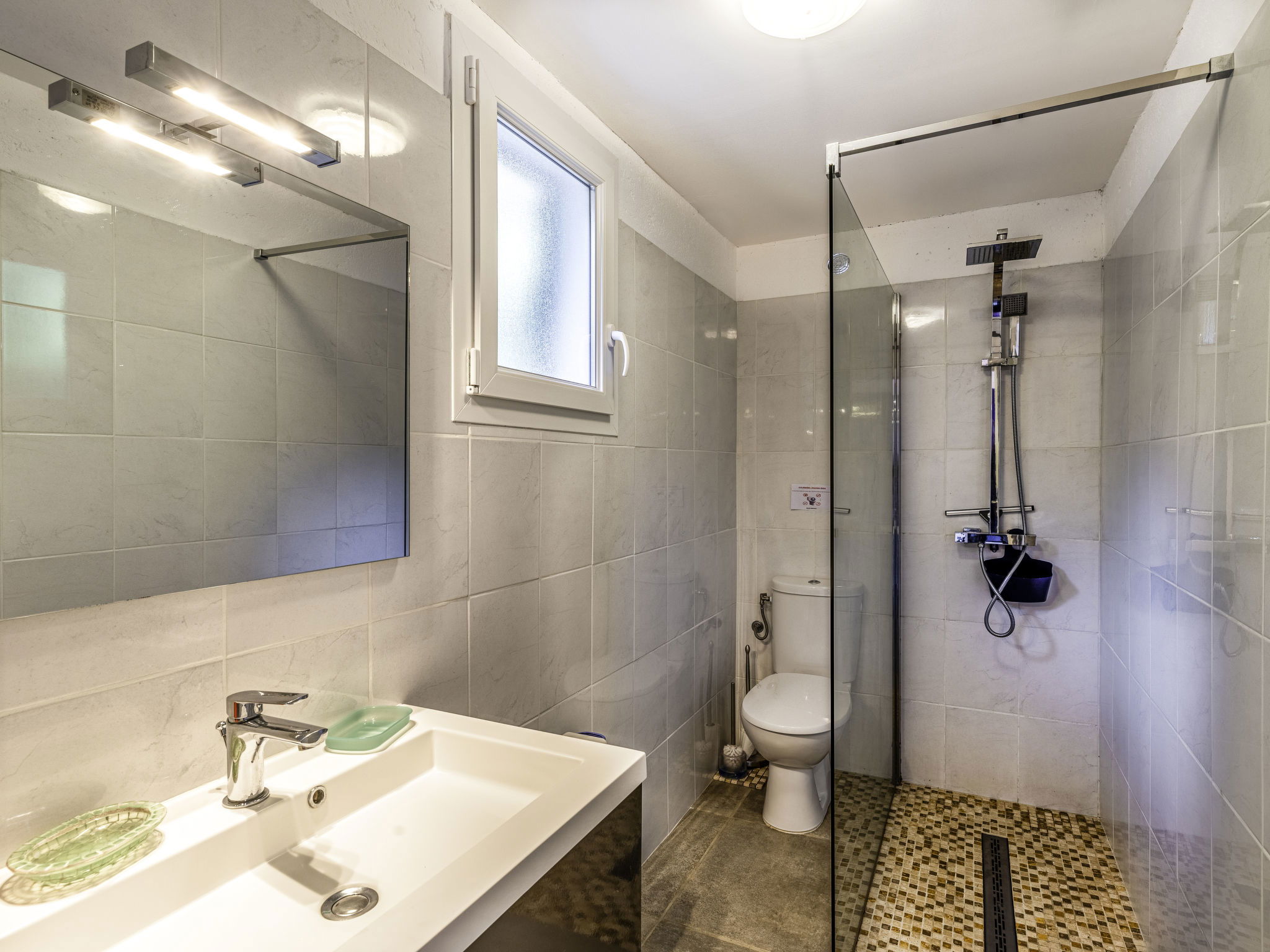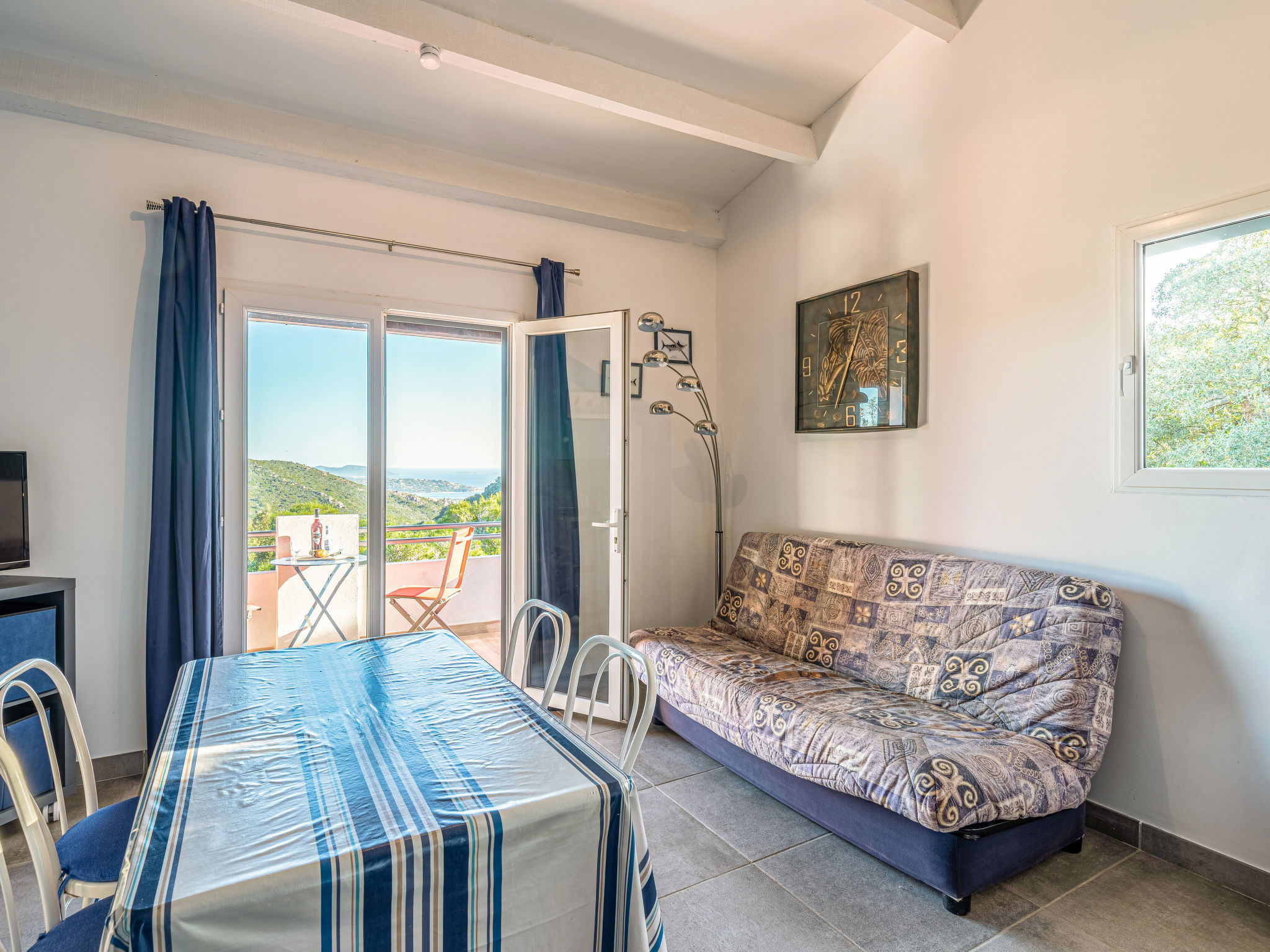 3-room house 82 m2 on 2 levels. Comfortable and beautiful furnishings: living/dining room with 1 sofabed (120 cm, length 190 cm), TV (flat screen). Exit to the terrace. 1 room with 1 french bed (140 cm, length 190 cm). Open kitchen (oven, dishwasher, 3 induction hot plates, toaster, kettle, freezer, electric coffee machine). Exit to the terrace. Shower/WC. Electric heating, air-conditioning. On the lower ground floor: (exterior staircase), 1 room with 1 french bed (140 cm, length 190 cm), shower/WC. Exit to the terrace. Air-conditioning. Beautiful view of the sea. Facilities: washing machine. Internet (WiFi, extra). Parking (2 cars). Please note: non-smoking house. Smoke alarm. No internal connecting door between the floors.