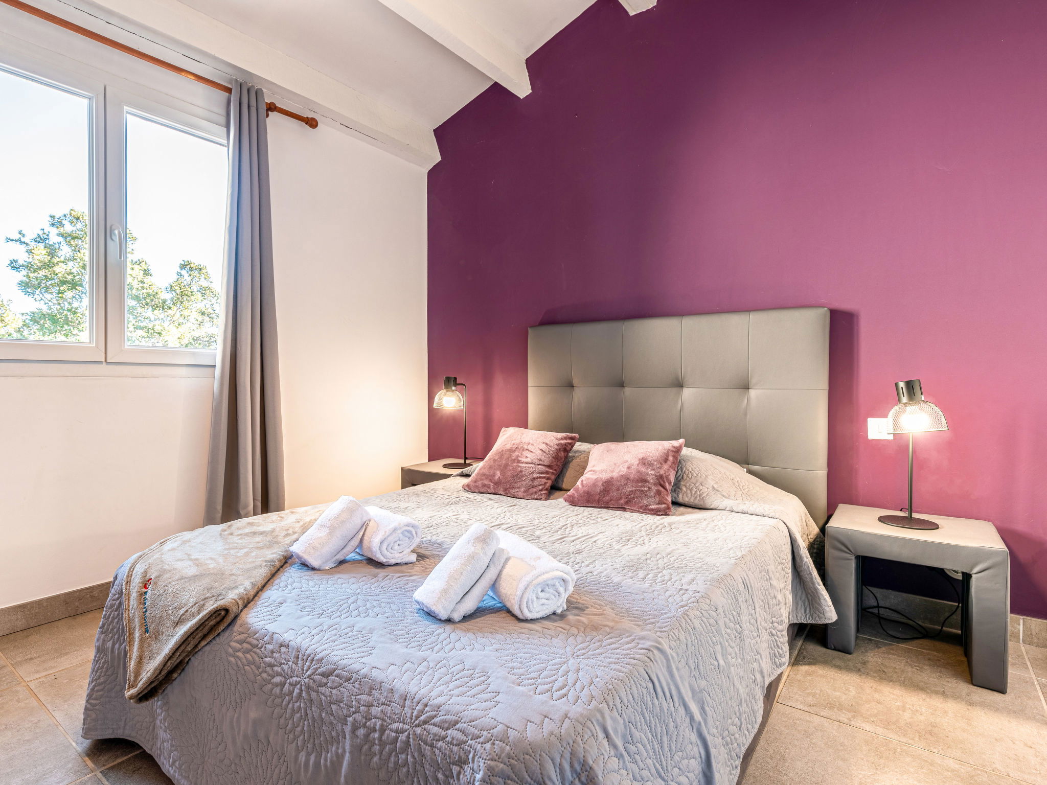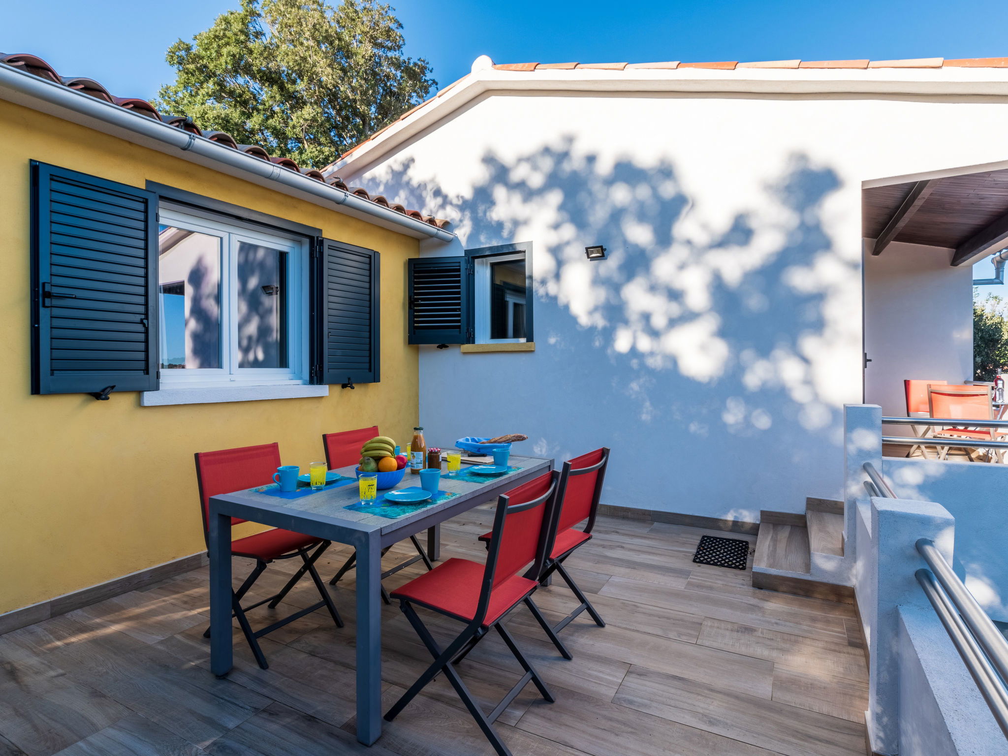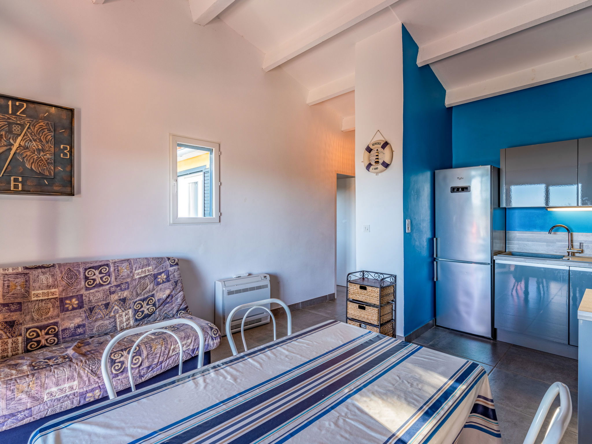 3-room house 82 m2 on 2 levels. Comfortable and beautiful furnishings: living/dining room with 1 sofabed (120 cm, length 190 cm), TV (flat screen). Exit to the terrace. 1 room with 1 french bed (140 cm, length 190 cm). Open kitchen (oven, dishwasher, 3 induction hot plates, toaster, kettle, freezer, electric coffee machine). Exit to the terrace. Shower/WC. Electric heating, air-conditioning. On the lower ground floor: (exterior staircase), 1 room with 1 french bed (140 cm, length 190 cm), shower/WC. Exit to the terrace. Air-conditioning. Beautiful view of the sea. Facilities: washing machine. Internet (WiFi, extra). Parking (2 cars). Please note: non-smoking house. Smoke alarm. No internal connecting door between the floors.