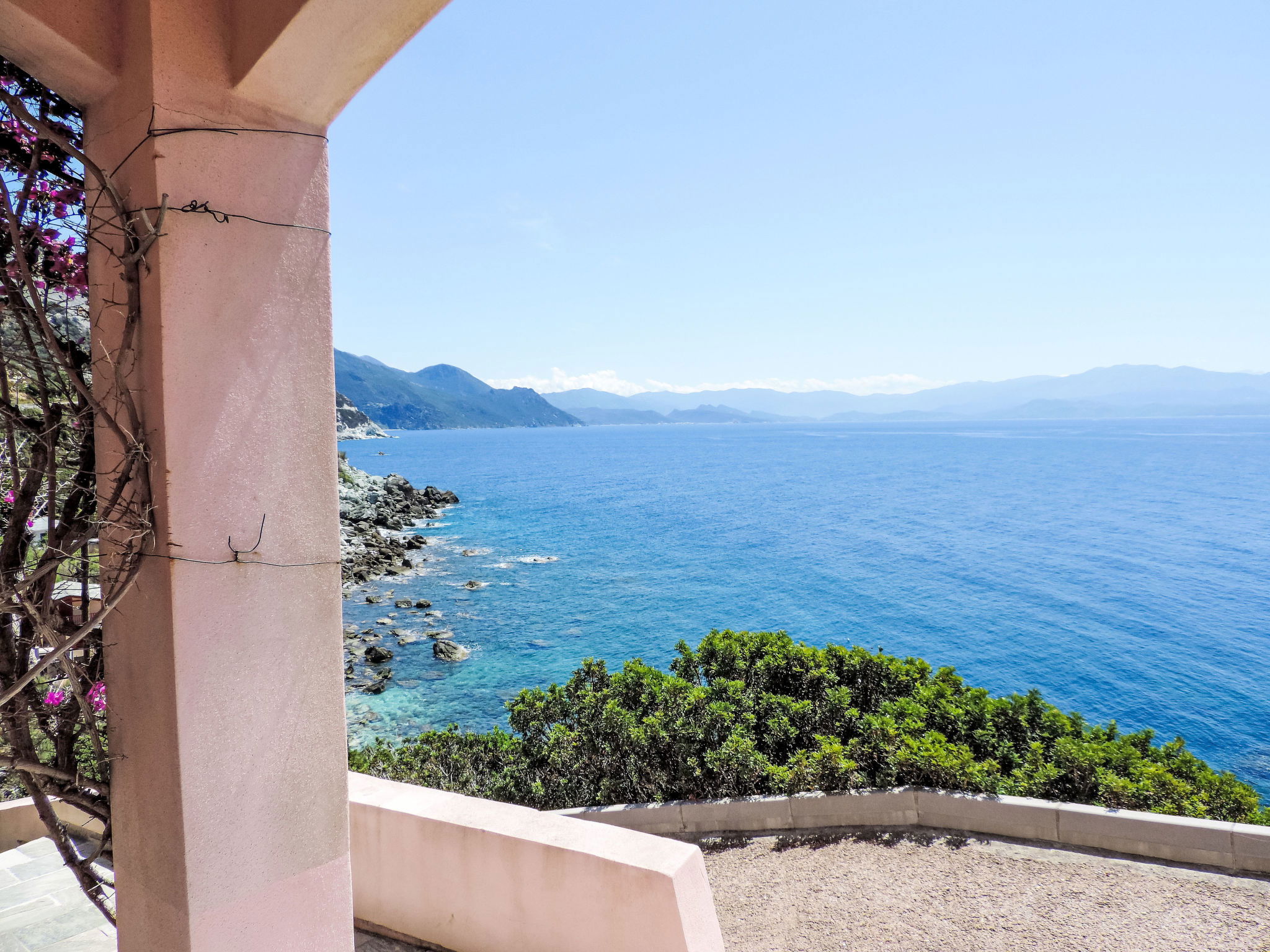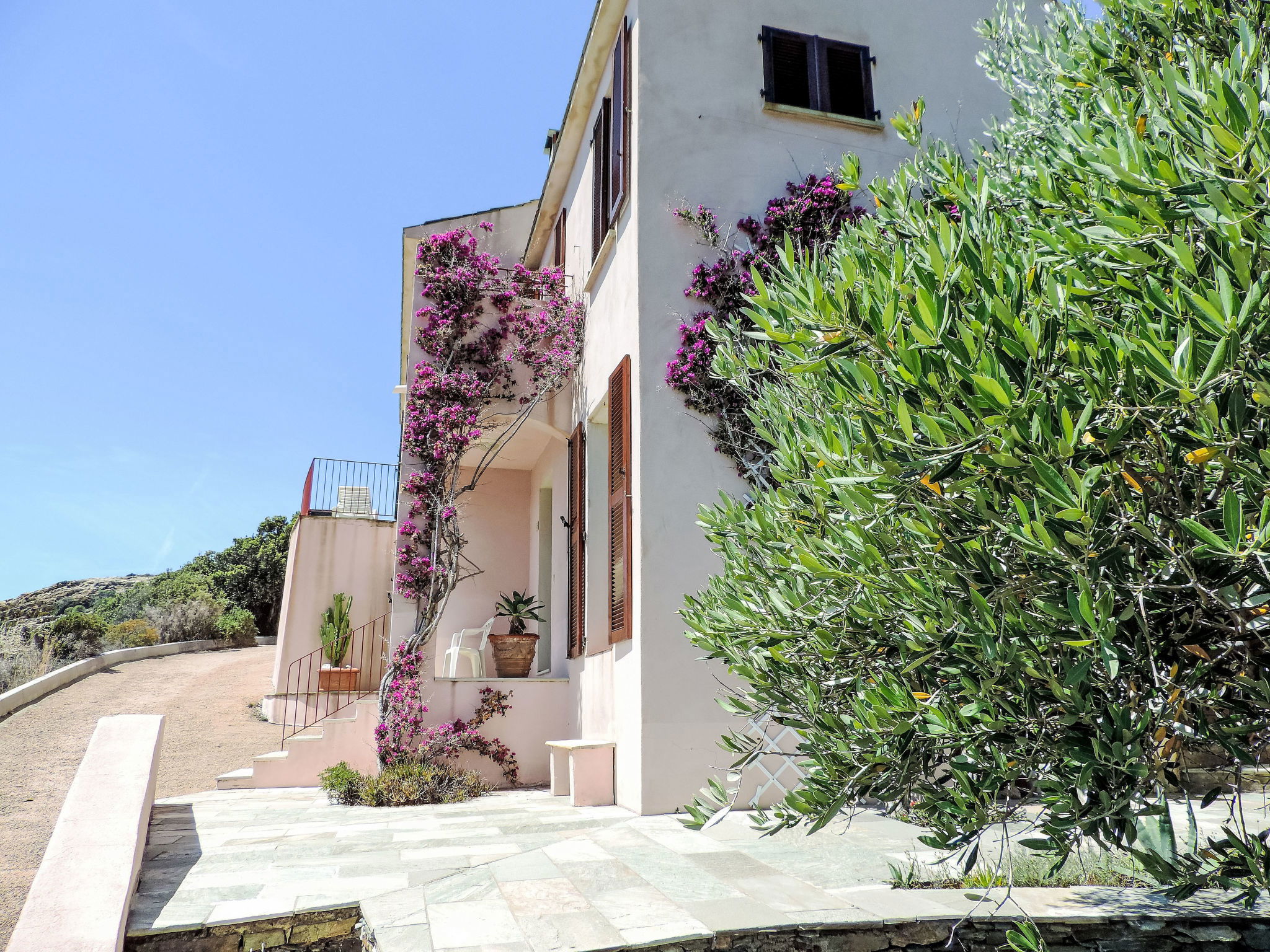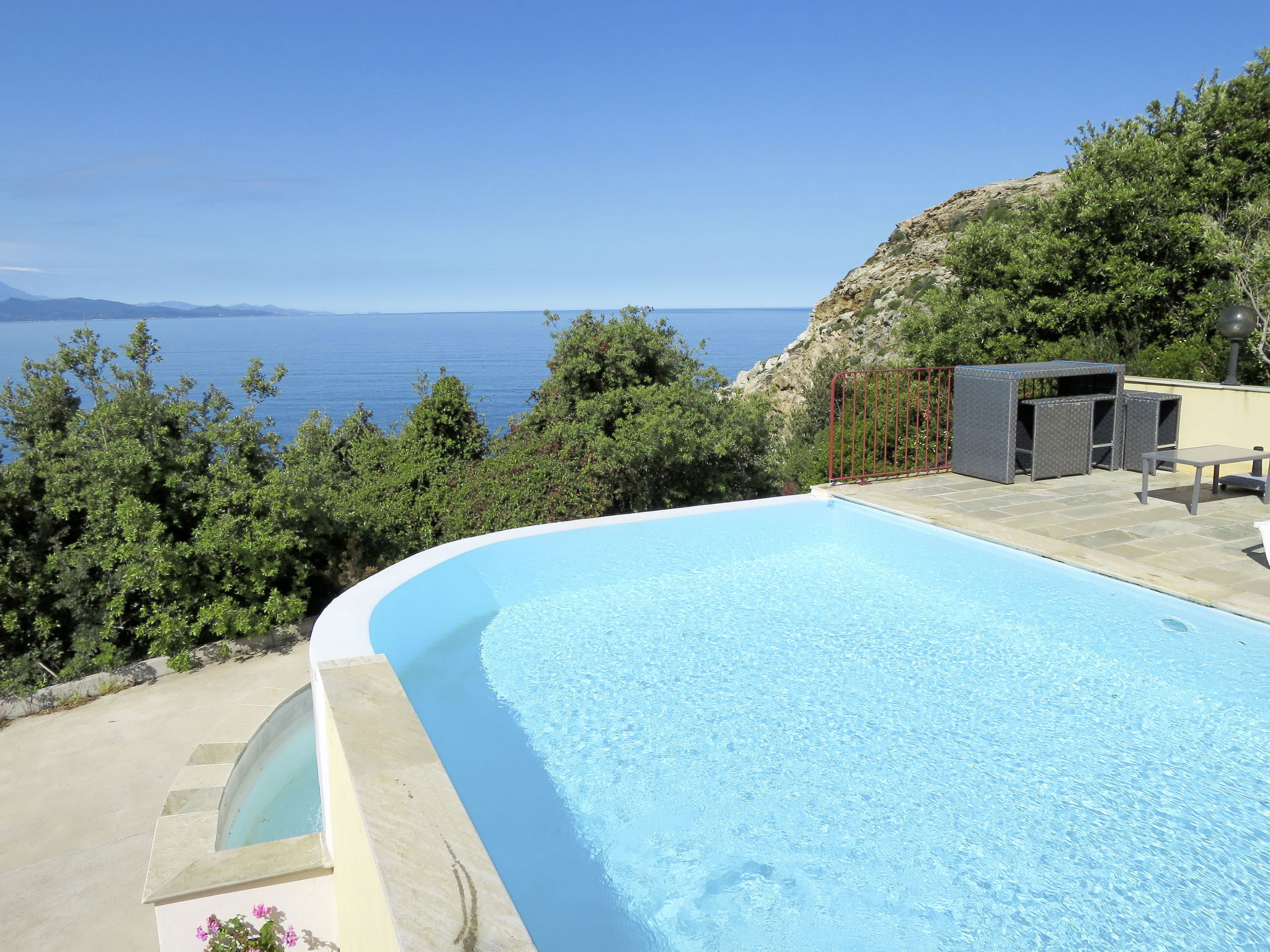 Very beautiful, cosy single-family house "Balbi". In the hamlet Cannelle 6 km from the centre of Canari, 32 km from the centre of St. Florent, 46 km from the centre of Bastia, in a secluded, elevated position on a slope, at the seaside, in the countryside. Private: natural state property 1'000 m2, well-kept terraced garden with wildlife garden and trees, swimming pool secured, fenced (6 x 4 m, seasonal availability: 01.Apr. - 31.Oct.). Terrace, garden furniture, pool maintenance by the owner/gardener. 25 m steep footpath to the house. Parking (for 2 cars) at the house at 25 m. Grocery 6 km, restaurant 2 km, bus stop 30 km, sandy beach "Plage Albo" 6 km, rocky beach 100 m (small). Walking paths from the house 100 m. Please note: car recommended.