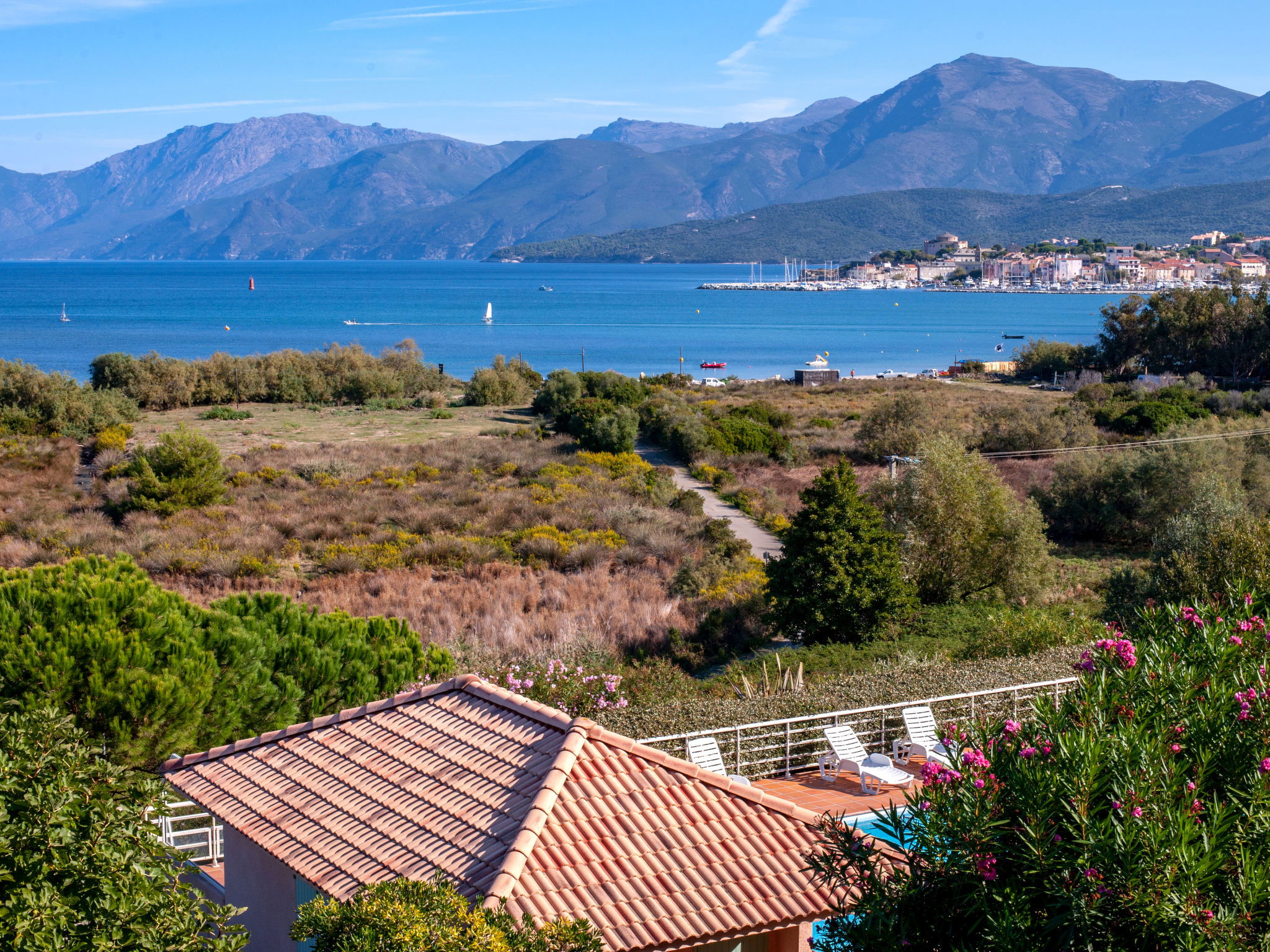 Cosy resort "Suarella". 3 houses in the residence. 68 apartments in the residence. In the district of Fromontica 2.5 km from the centre of St. Florent, 68 km from the centre of Calvi, 23 km from the centre of Bastia, in a sunny, elevated position on a slope, 300 m from the sea, 300 m from the beach, in the countryside. For shared use: property with plants and trees, swimming pool fenced (15 x 8 m, seasonal availability: 01.May. - 30.Sep.). Terrace, children's playground. In the complex: reception, WiFi, washing machine (for shared use, extra). Parking on the premises. Supermarket 2.5 km, bus stop 2.7 km, sandy beach 300 m. Surf school, sailing school 300 m. Please note: car recommended. Wifi only at the reception.