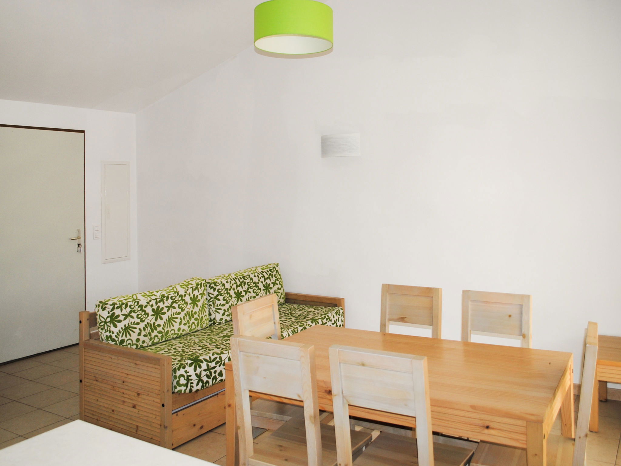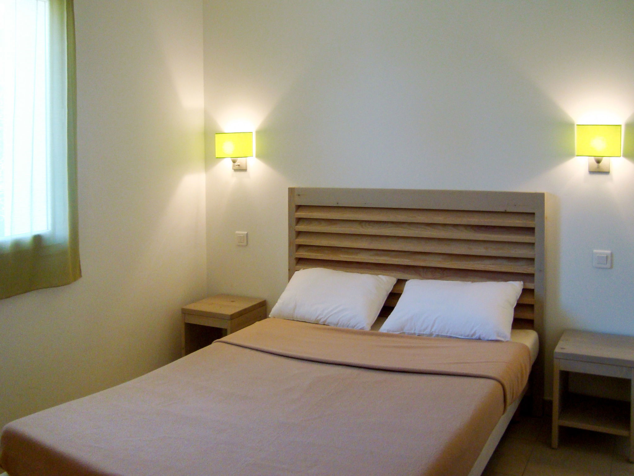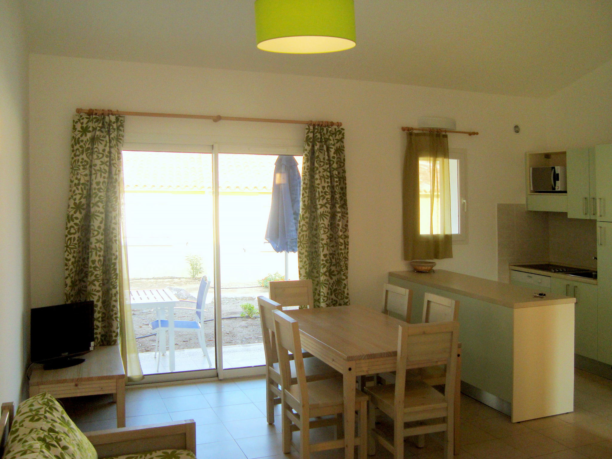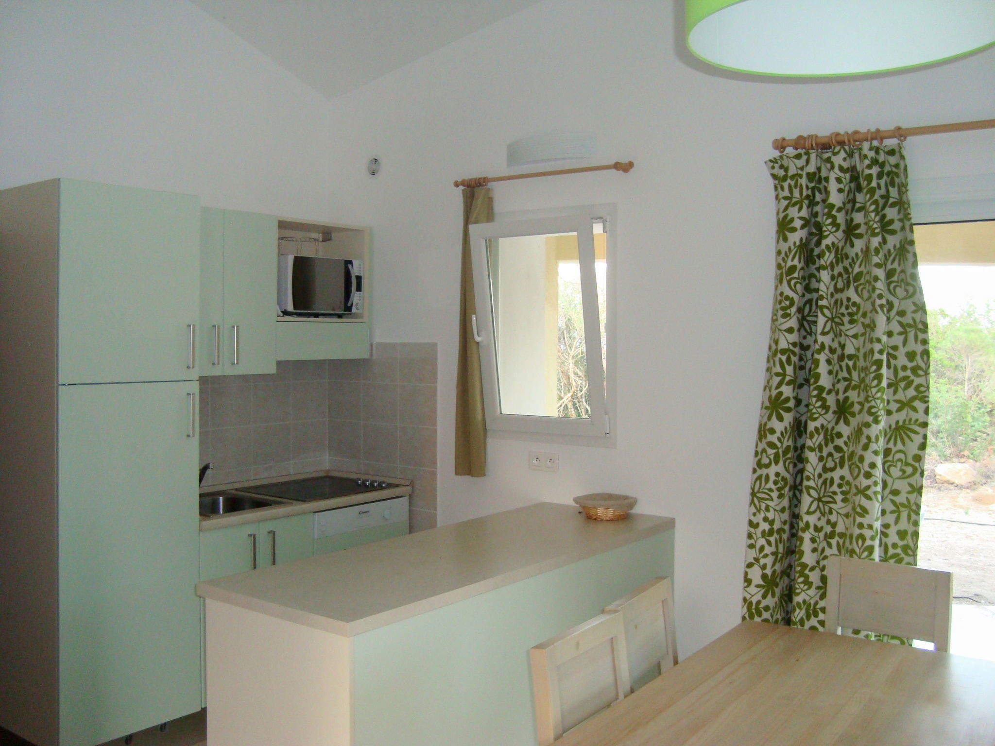 "Résidence Odalys Référence San Martinu", 3-room terraced house 48 m2. Practical furnishings: living/sleeping room with 1 sofabed, 1 pull-out bed, dining table, TV, electric heating and air conditioning. 1 room with 1 french bed. 1 room with 2 beds. Kitchenette (dishwasher, 4 ceramic glass hob hotplates, microwave, electric coffee machine). Shower/WC. Terrace. Terrace furniture. Facilities: children's high chair, baby cot. Please note: non-smoking house. Smoke alarm, fire extinguisher.