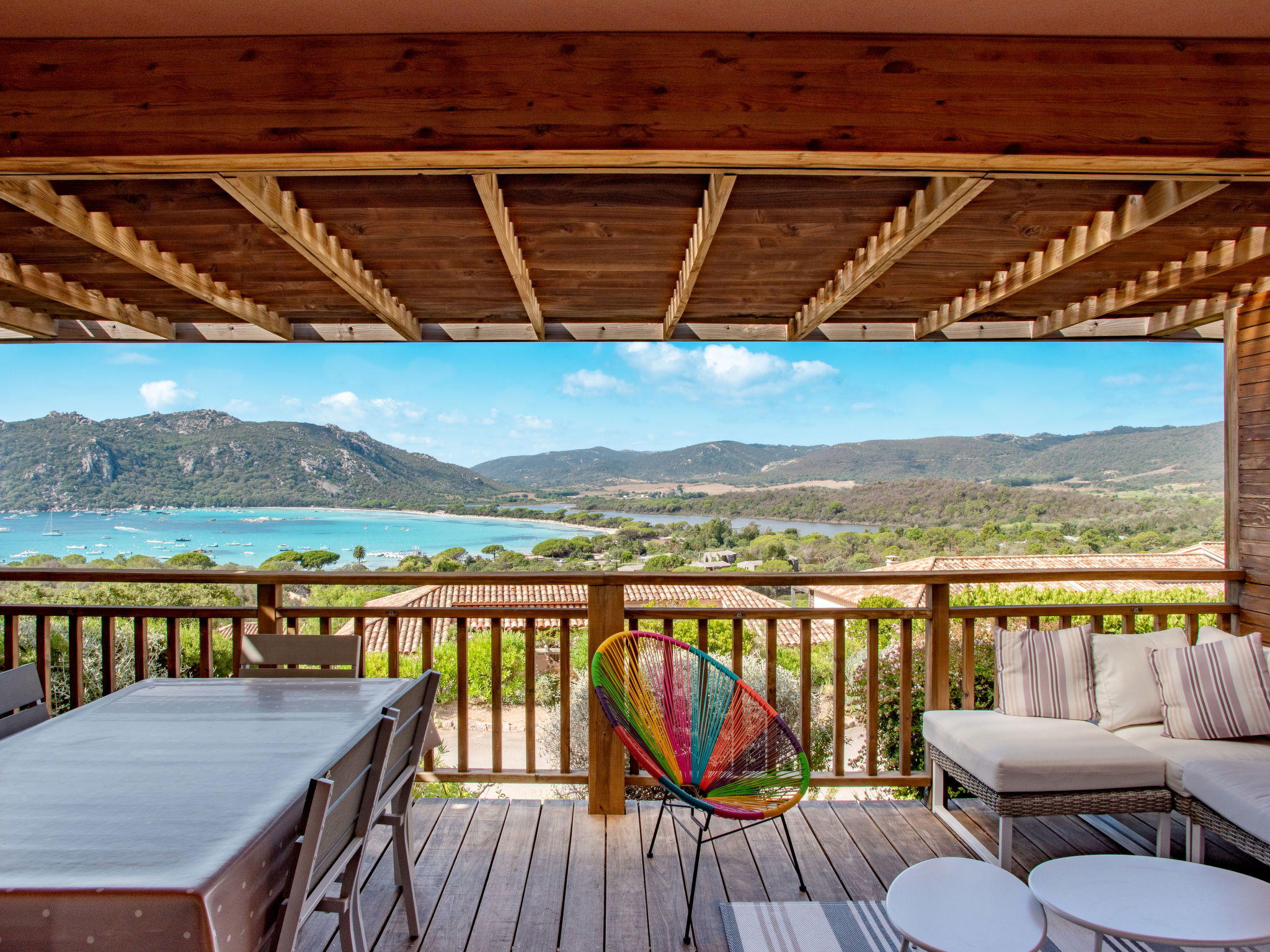 "Les Hameaux de Santa Giulia", 3-room terraced house 60 m2 on 2 levels, south facing position. Bright, comfortable and beautiful furnishings: living/sleeping room with panoramic window with 1 double sofabed, dining table and TV. Exit to the balcony. 1 room with 2 beds. Open kitchen (4 hot plates, dishwasher, microwave, freezer, electric coffee machine). Shower/WC. Upper floor: 1 room with 1 french bed (160 cm). Bathroom, sep. WC. Electric heating, air-conditioning. Balcony 18 m2, south facing position, terrace 8 m2 partly roofed. Terrace furniture, balcony furniture, barbecue. Very beautiful panoramic view of the sea, the mountains and Golfe de Santa Giulia, Bavella. Facilities: washing machine. Please note: non-smokers only. Smoke alarm. Offer by a commercial proprietor according to Art. 155, IV, CGI