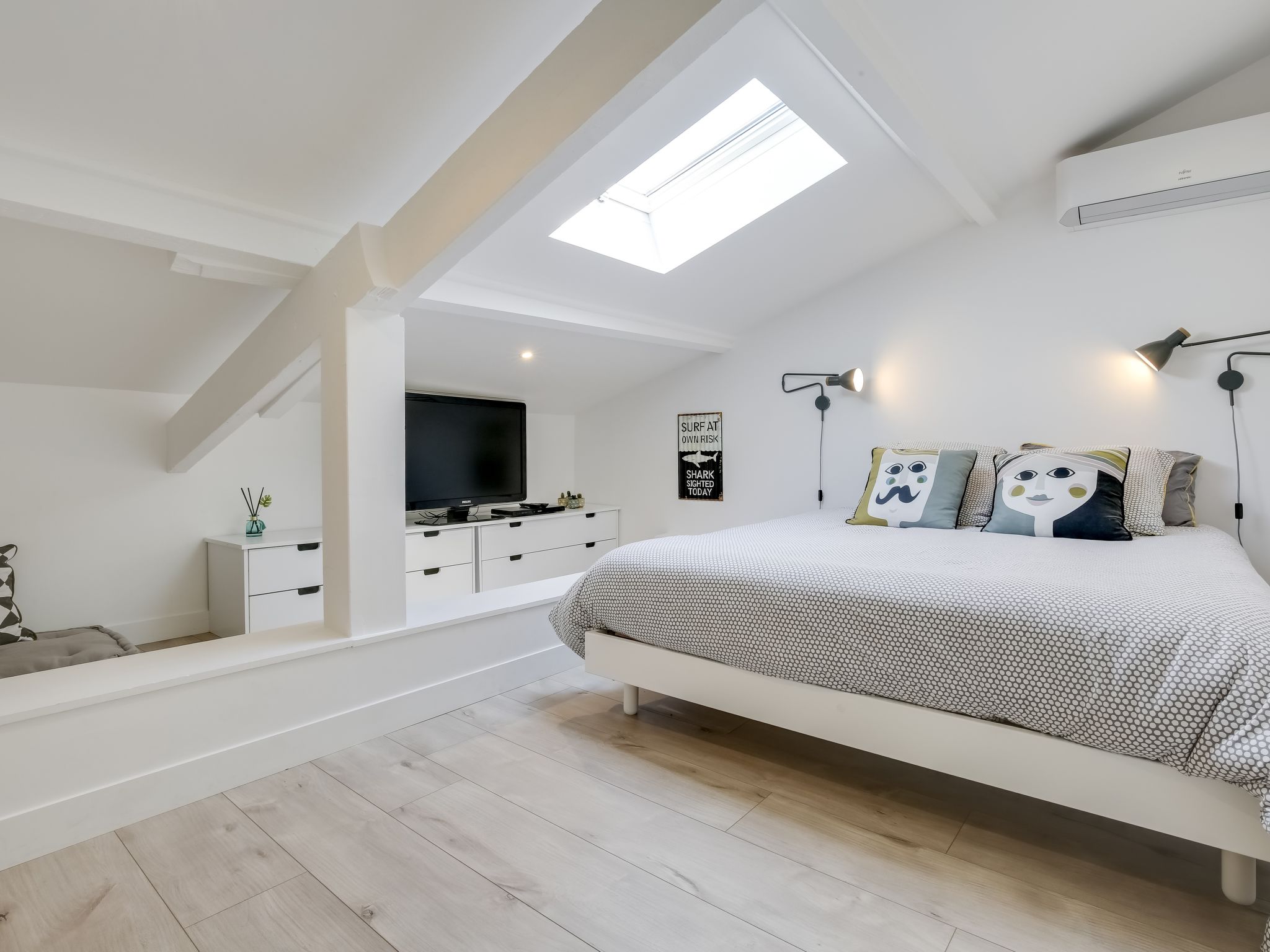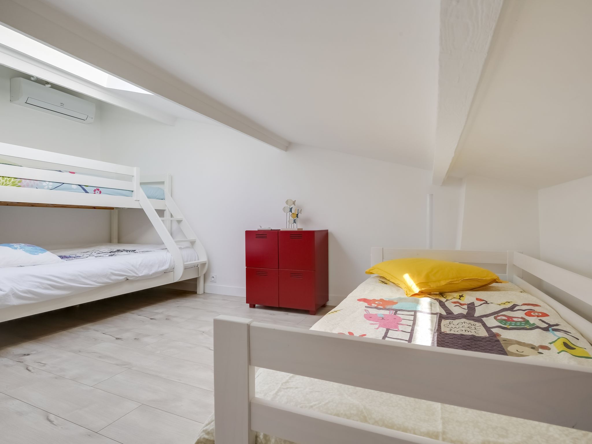 4-room house 90 m2 on 2 levels. Object suitable for 4 adults + 4 children. Tasteful and wooden furniture furnishings: living/dining room with panoramic window with TV, flat screen and DVD. Exit to the terrace. 1 room, window onto the courtyard with 1 french bed (1 x 160 cm, length 190 cm). Open kitchen (oven, dishwasher, 4 induction hot plates, toaster, kettle, microwave, freezer, electric coffee machine) with bar. Shower, sep. WC, double hand-basin. Upper floor: (spiral staircase), 1 room with sloping ceilings with 1 french bed (1 x 160 cm, length 190 cm), TV (flat screen). (spiral staircase), 1 children's room with sloping ceilings with 1 bed (90 cm, length 190 cm), 1 x 1 bunk beds (90 cm, length 190 cm), 1 double bed (1 x 140 cm, length 190 cm). Electric heating, air-conditioning. Terrace 40 m2. Terrace furniture, barbecue, deck chairs (2). Facilities: washing machine, dryer, iron, baby cot, hair dryer. Internet (WiFi, free). Please note: smoke alarm. 3352900106142