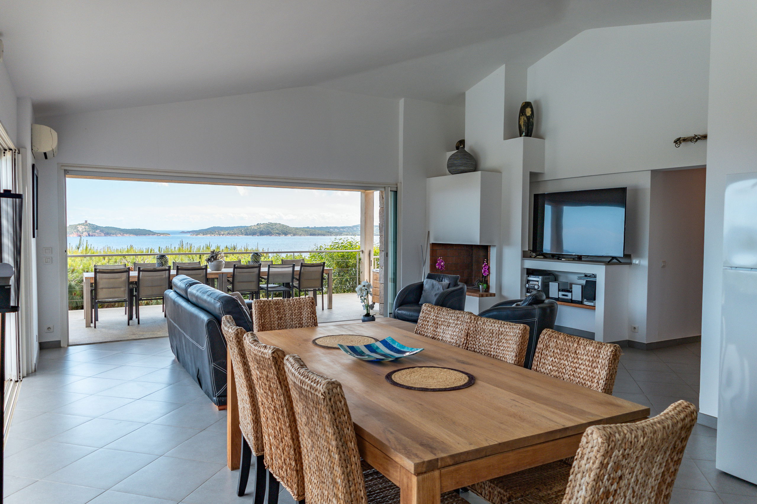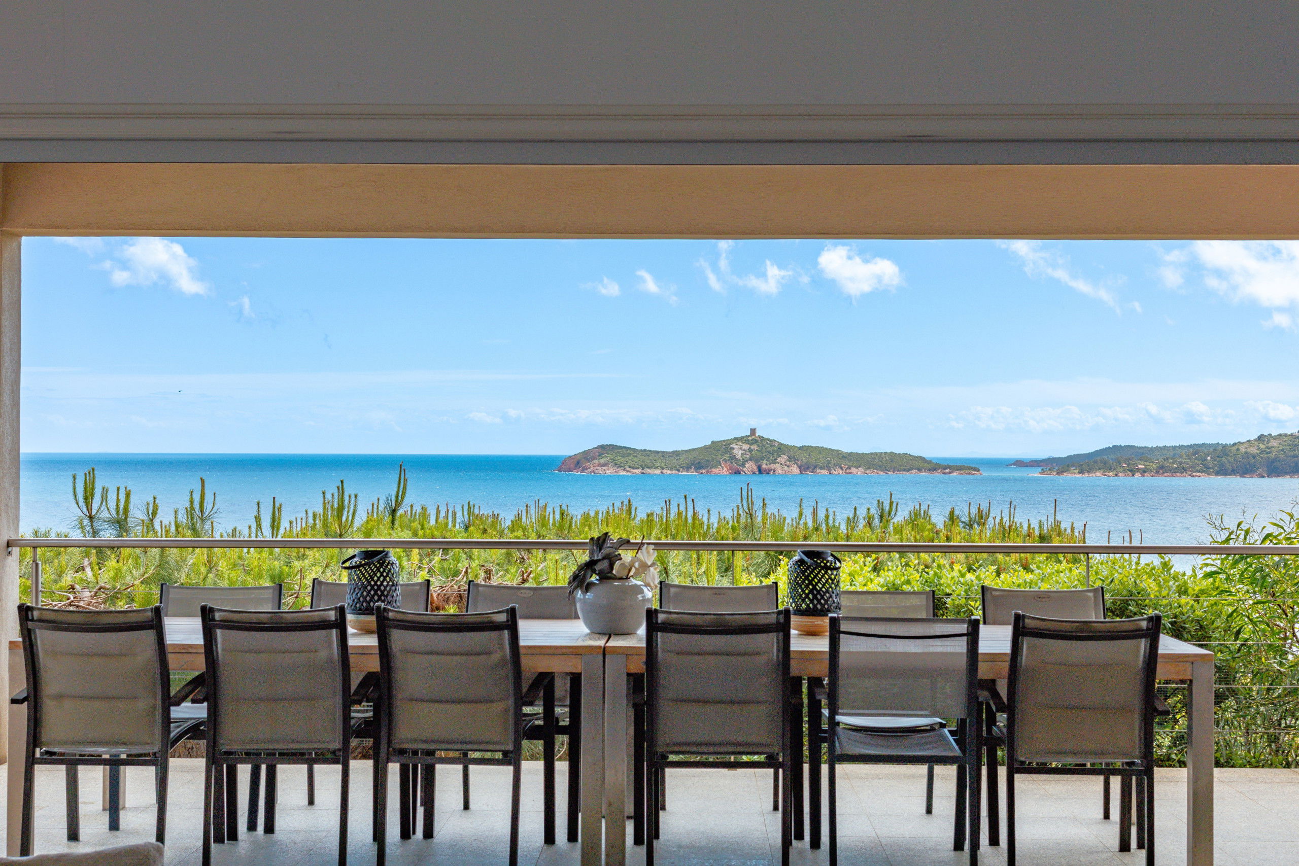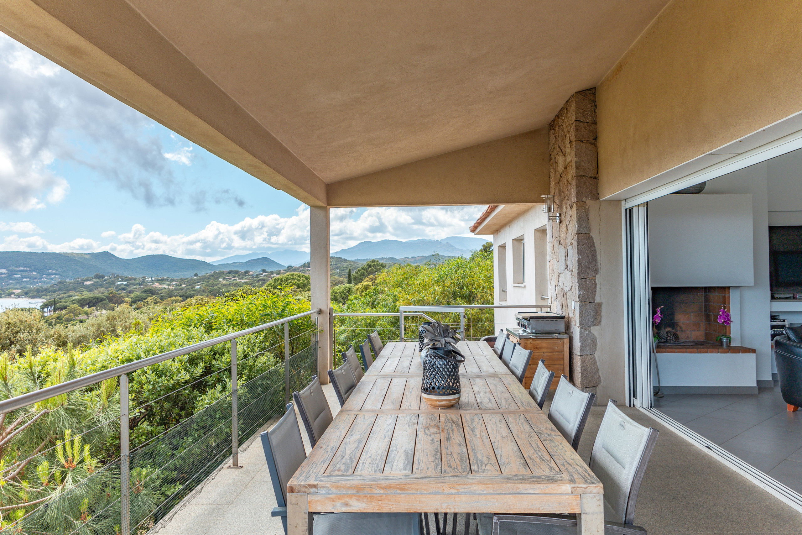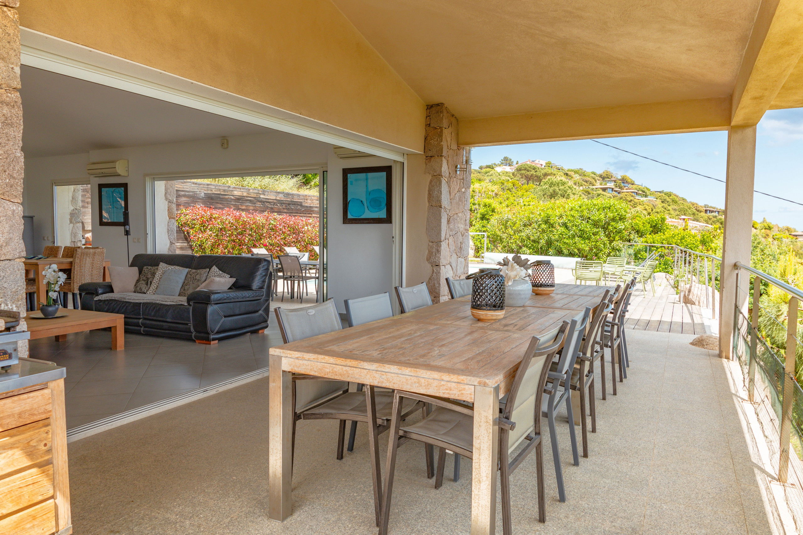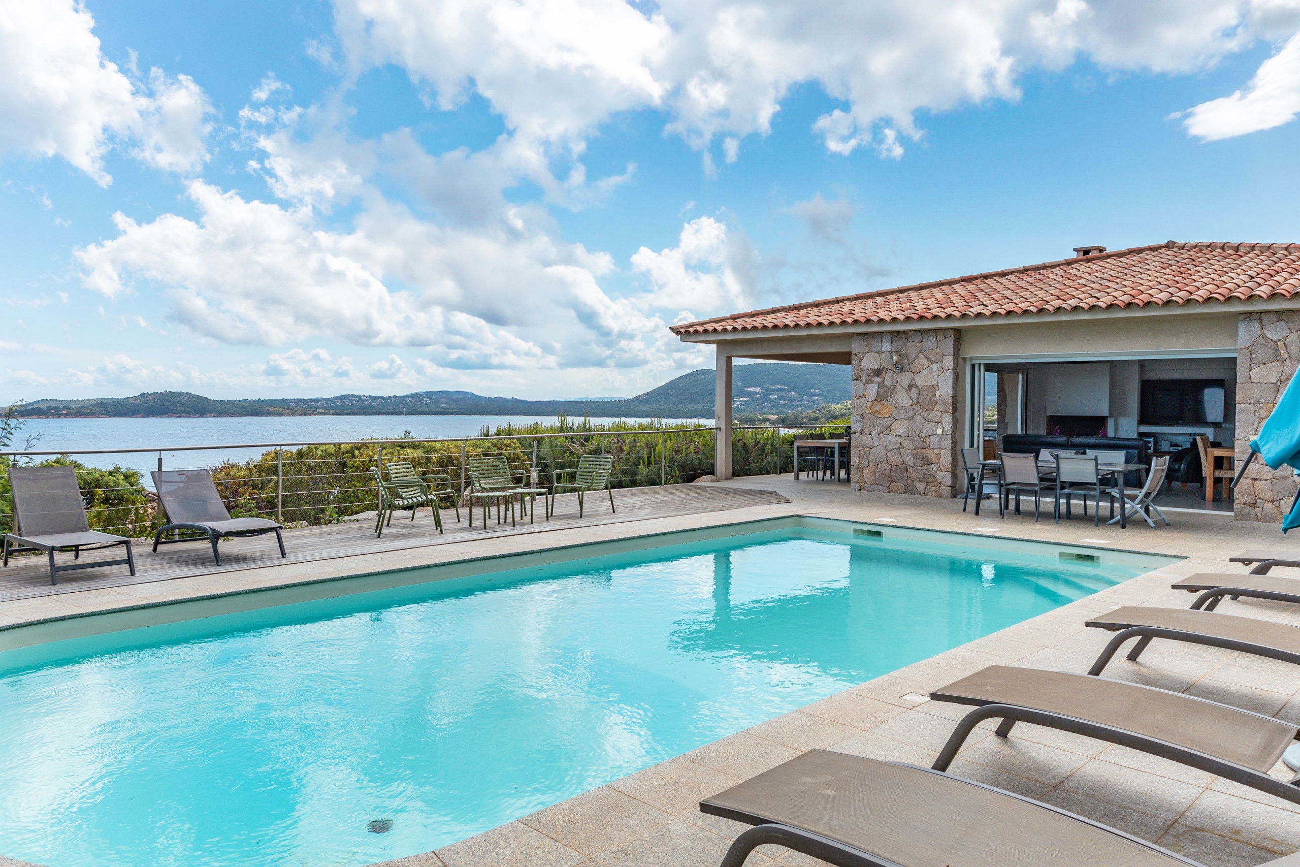 Large sea view terrace with outdoor kitchen, outdoor living room and sun loungers.