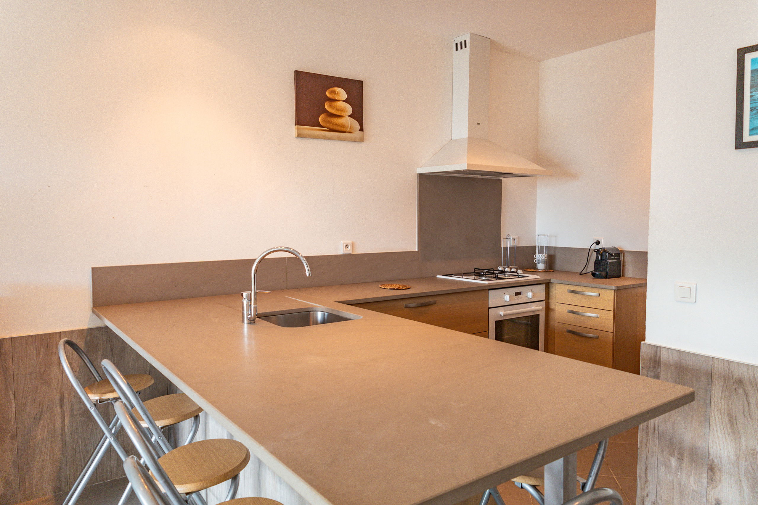 Fully equipped open kitchen and a living room.