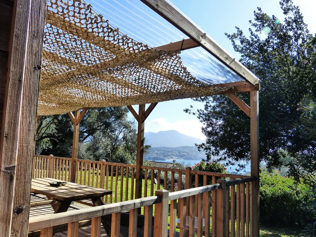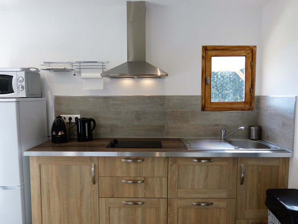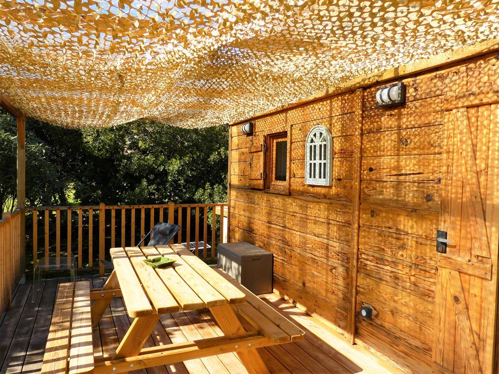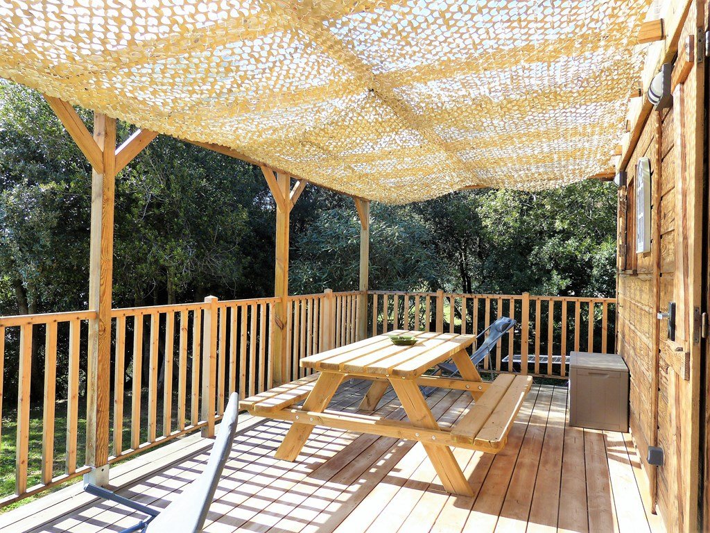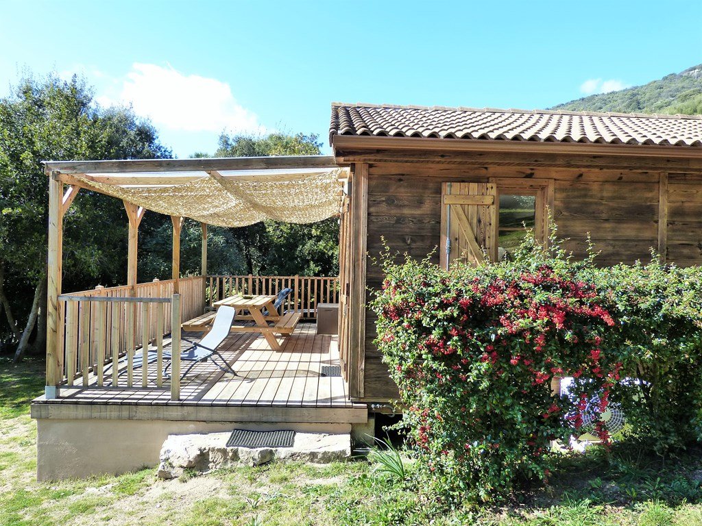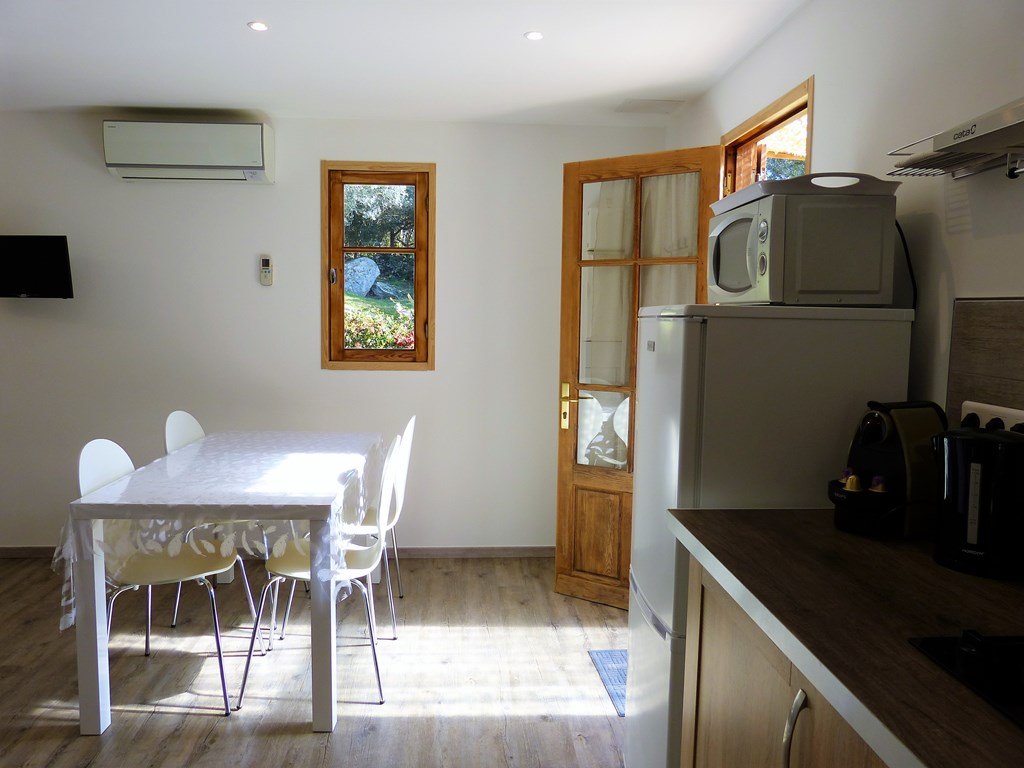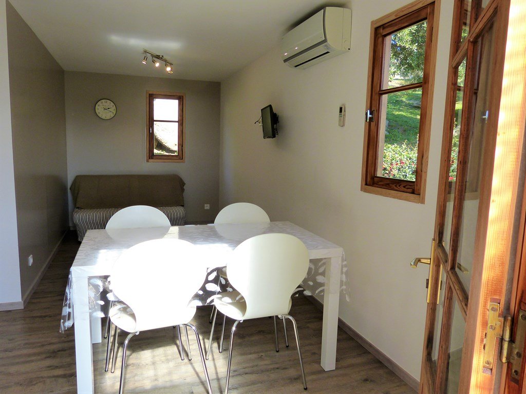 It features a fully equipped kitchen open onto a living room with dining area and lounge area with convertible sofa, a bedroom with double bed, a bathroom with shower and toilet and a shaded terrace.
