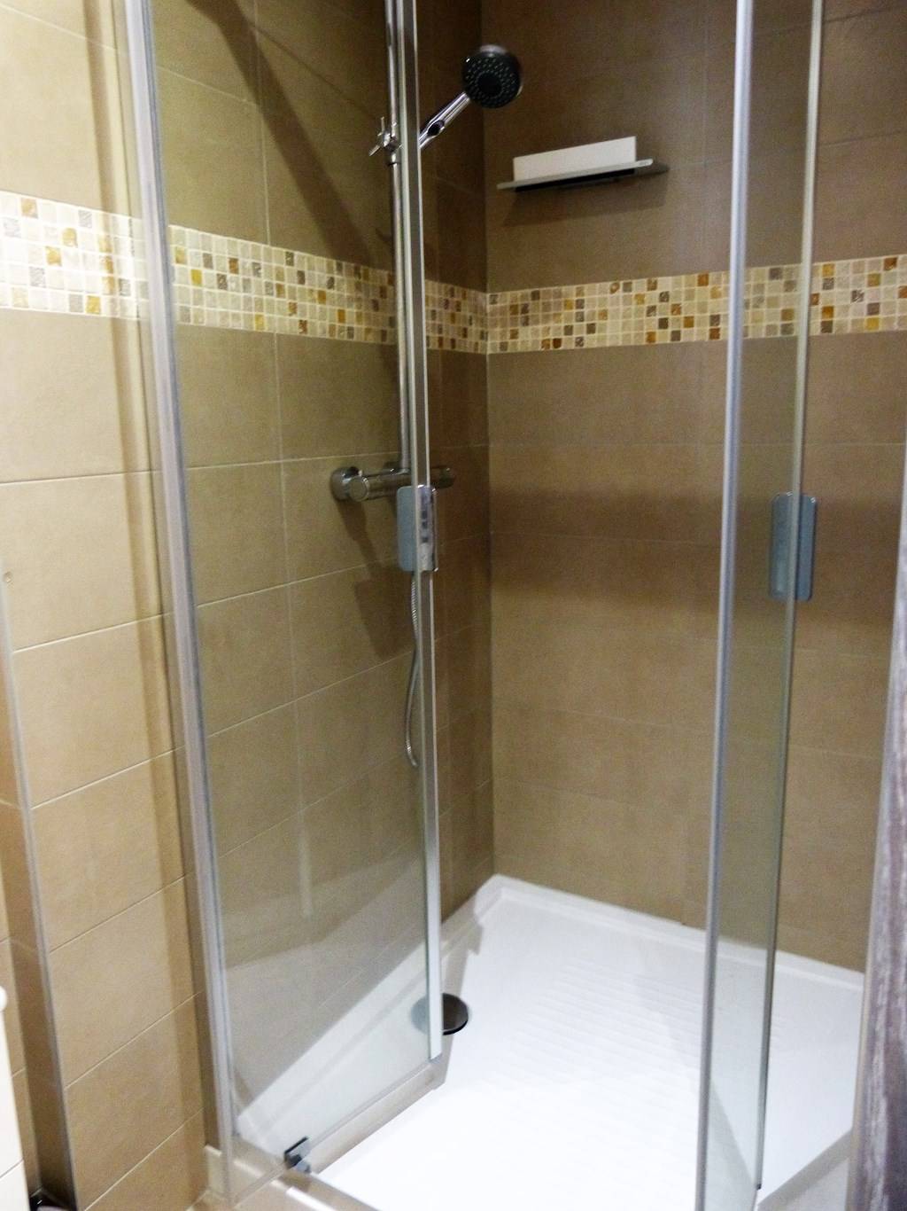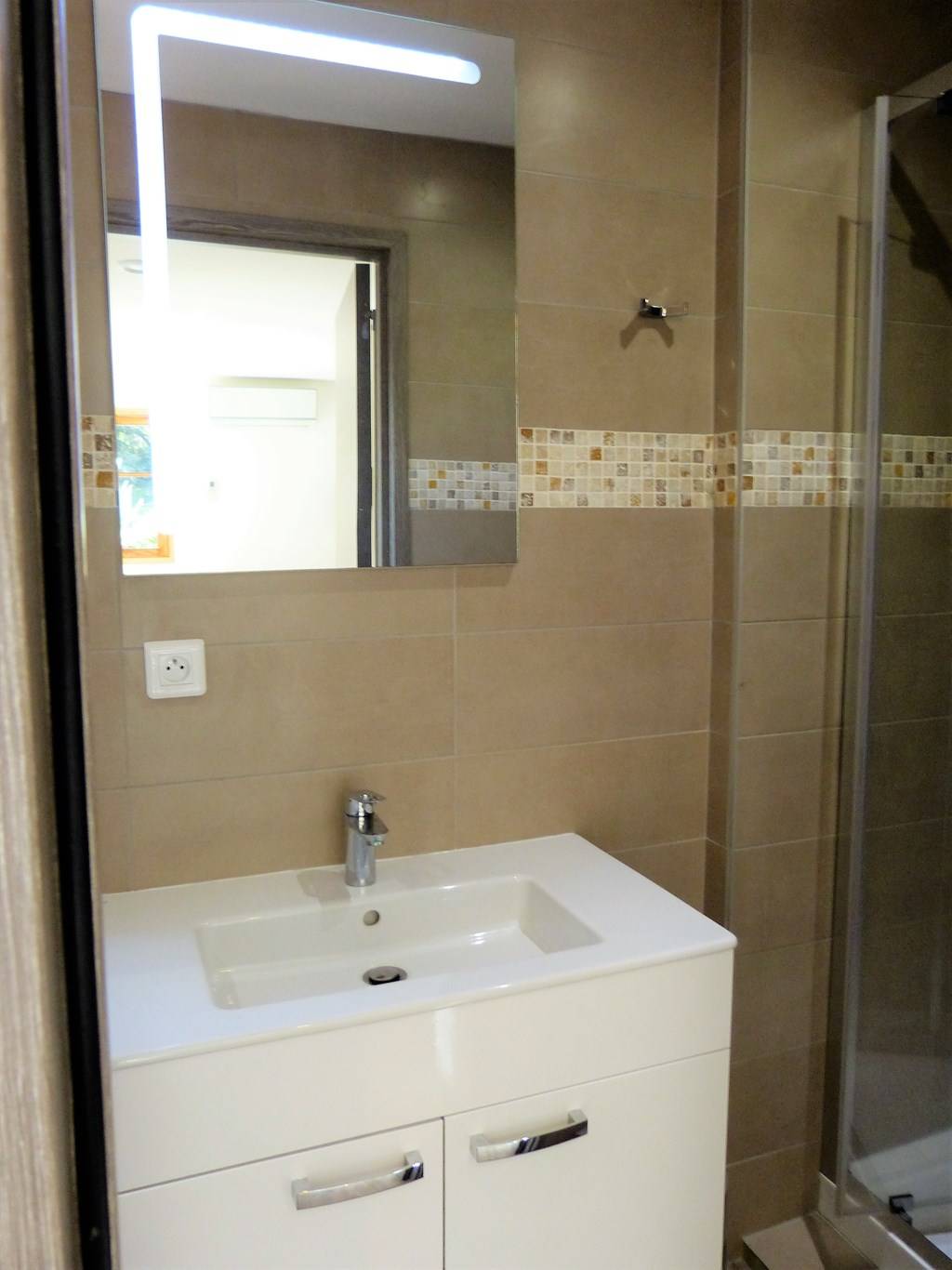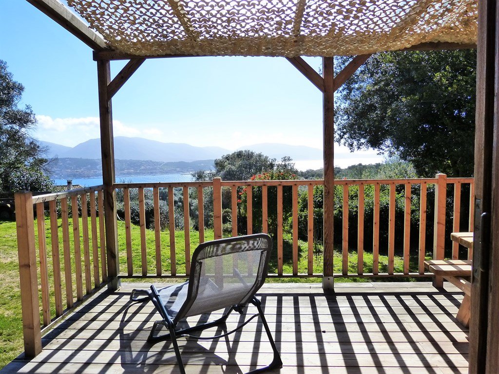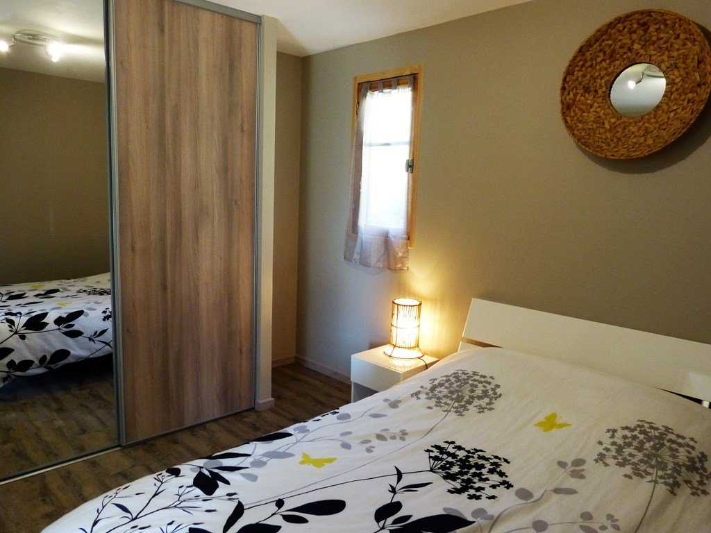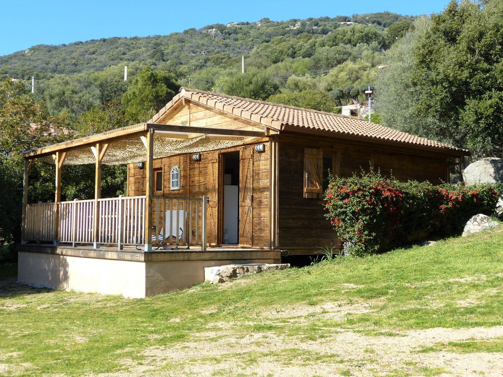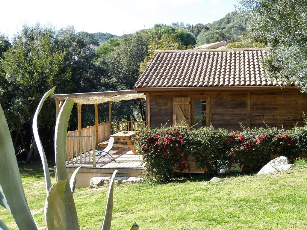 It features a fully equipped kitchen open onto a living room with dining area and lounge area with convertible sofa, a bedroom with double bed, a bathroom with shower and toilet and a shaded terrace.