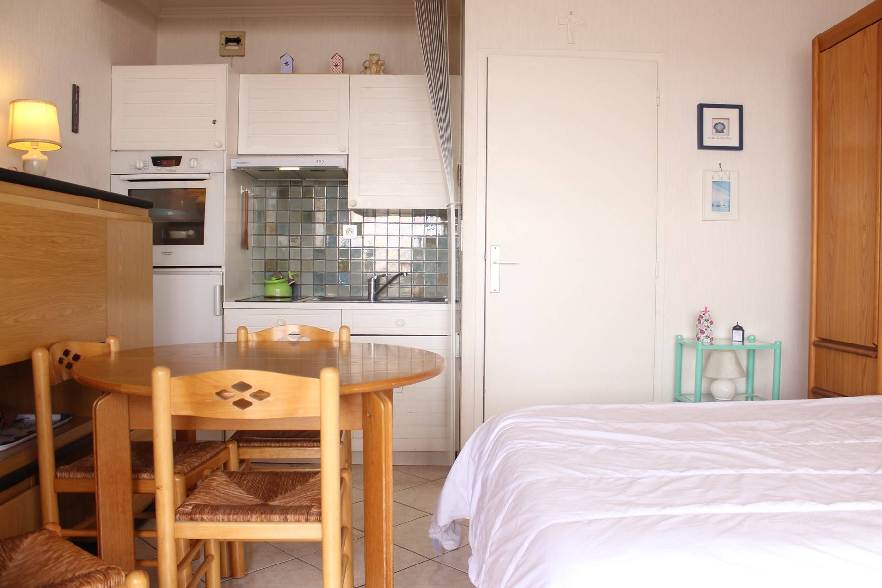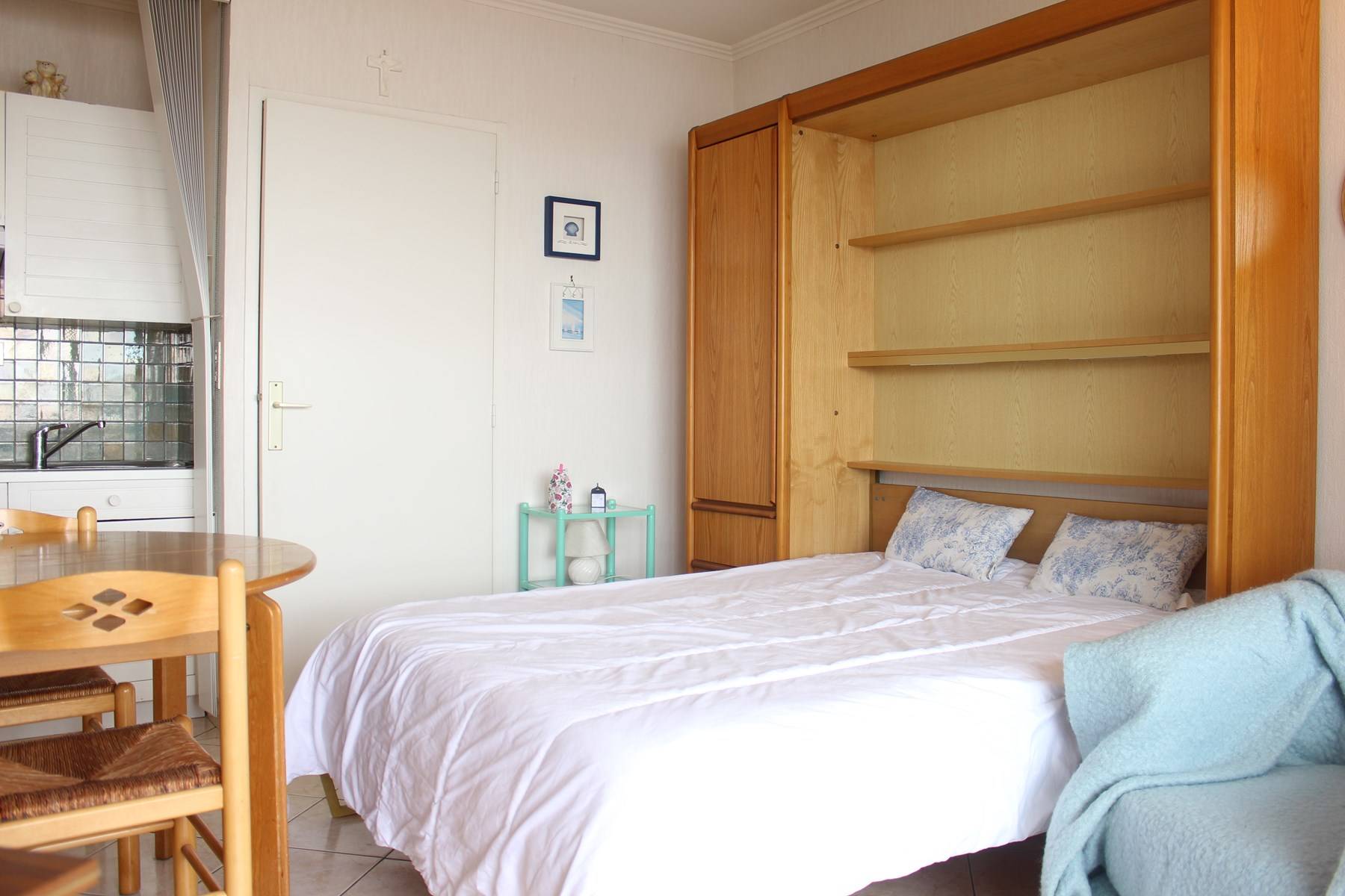 Accommodation: This pleasant studio located between avenue du Général de Gaulle and Aquabaule is equipped with an entrance with cabin area (bunk beds) and storage, a bright living room with a small kitchen with all the essentials for 4 people , a table and 4 chairs, and a folding bed very easily which allows you to have room during the day, a terrace facing the sea with garden furniture and awning, and a bathroom. Private numbered parking space at the rear of the building. The advantages of this rental by the sea: This studio enjoys a wide view over the entire bay of La Baule, from pornichet to iguen, and on clear days you will even see the Ile des Evens. Parking by the sea is also convenient in high season.