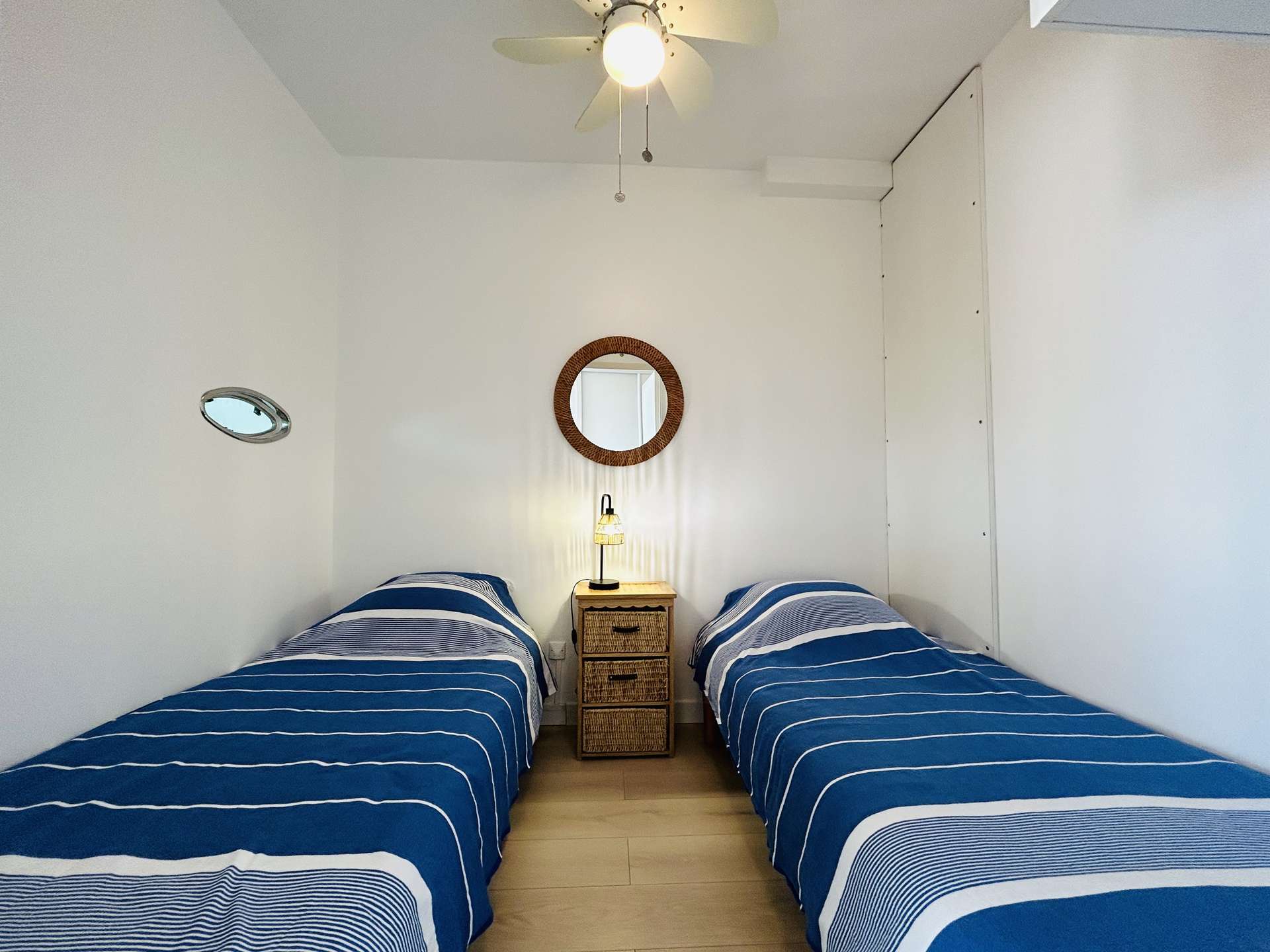 In the heart of the market area, come and discover this spacious Appartement Bis on the 3rd floor with elevator with a view facing the sea. This rental consists of an entrance with cupboard, a bright living room opening onto a beautiful terrace facing the sea, an open fitted kitchen, a cabin bedroom with 2 single 90 cm beds, a rear bedroom with a 160 cm double bed and adjoining bathroom, separate WC and a second bathroom. You will also benefit from a terrace with furniture and a small closed garage for parking.