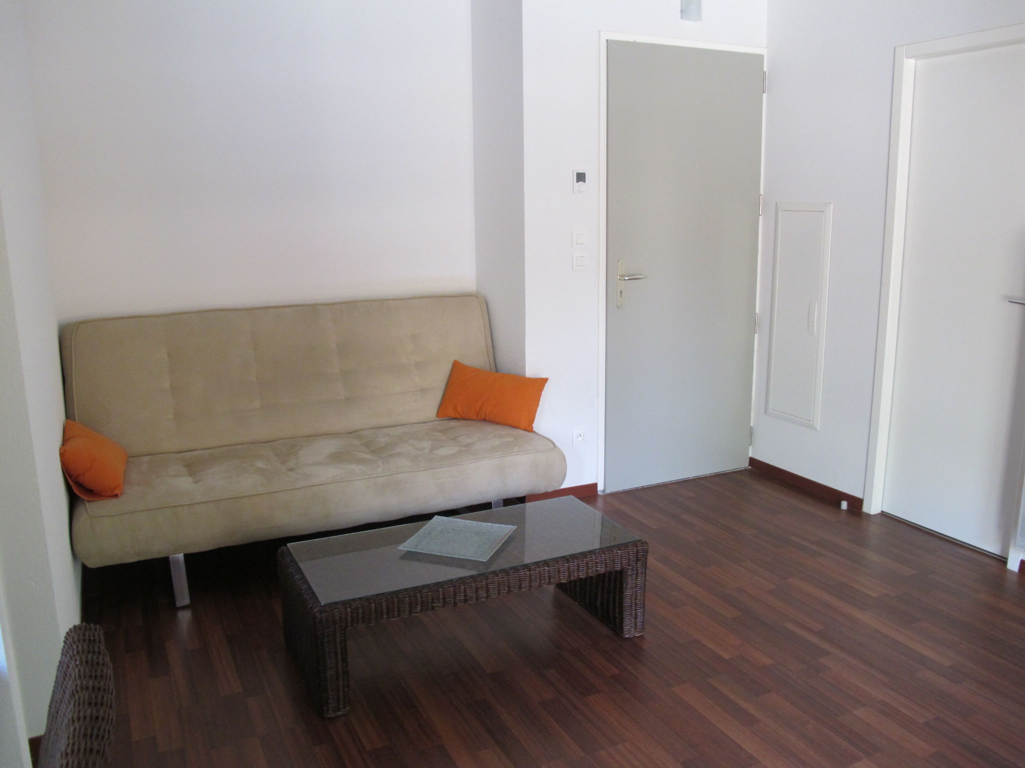 "Les Rives du Lac", 2-room apartment 37 m2. Object suitable for 2 adults. Practical and modern furnishings: living/sleeping room with 1 double sofabed (135 cm), dining table and satellite TV. 1 small room with 1 french bed (160 cm). Small, open kitchen (dishwasher, 2 ceramic glass hob hotplates, toaster, kettle, microwave, electric coffee machine). Bath/WC. Electric heating. Balcony or terrace. Terrace furniture, balcony furniture. Facilities: Internet (WiFi, extra). Please note: non-smokers only. Maximum 1 pet/ dog allowed. Smoke alarm. The flats are located on the ground floor or upper floor (access via external staircase).