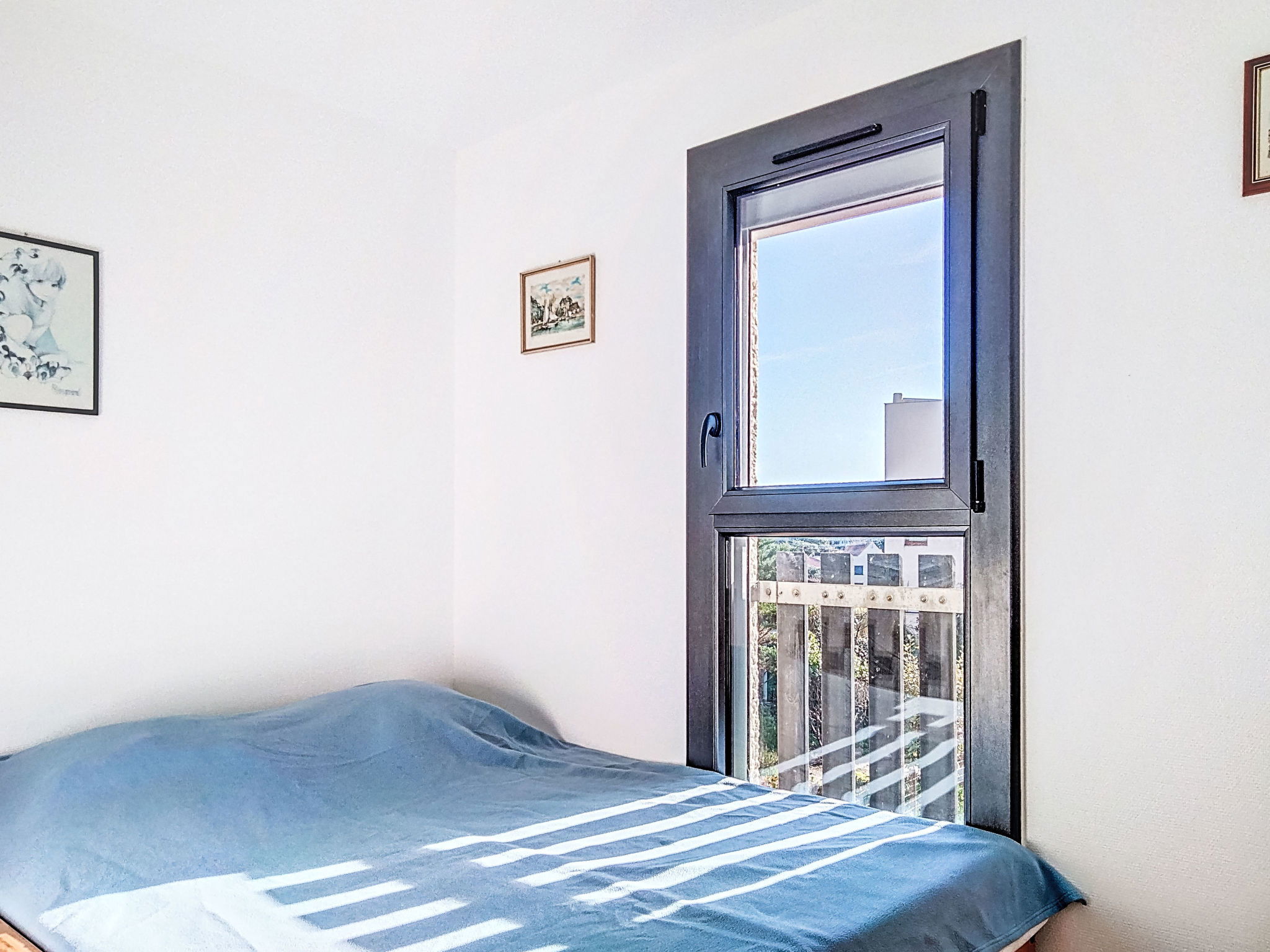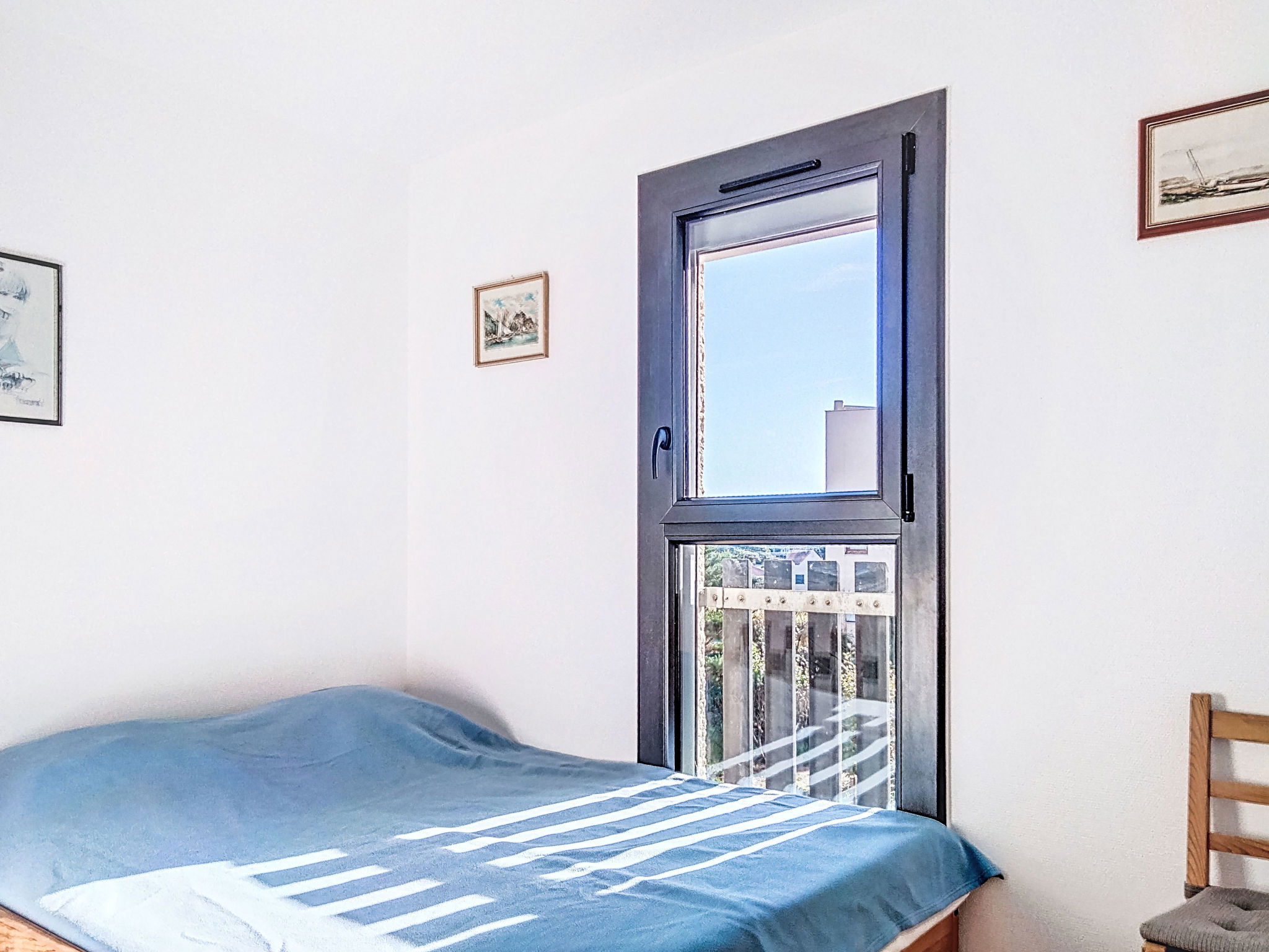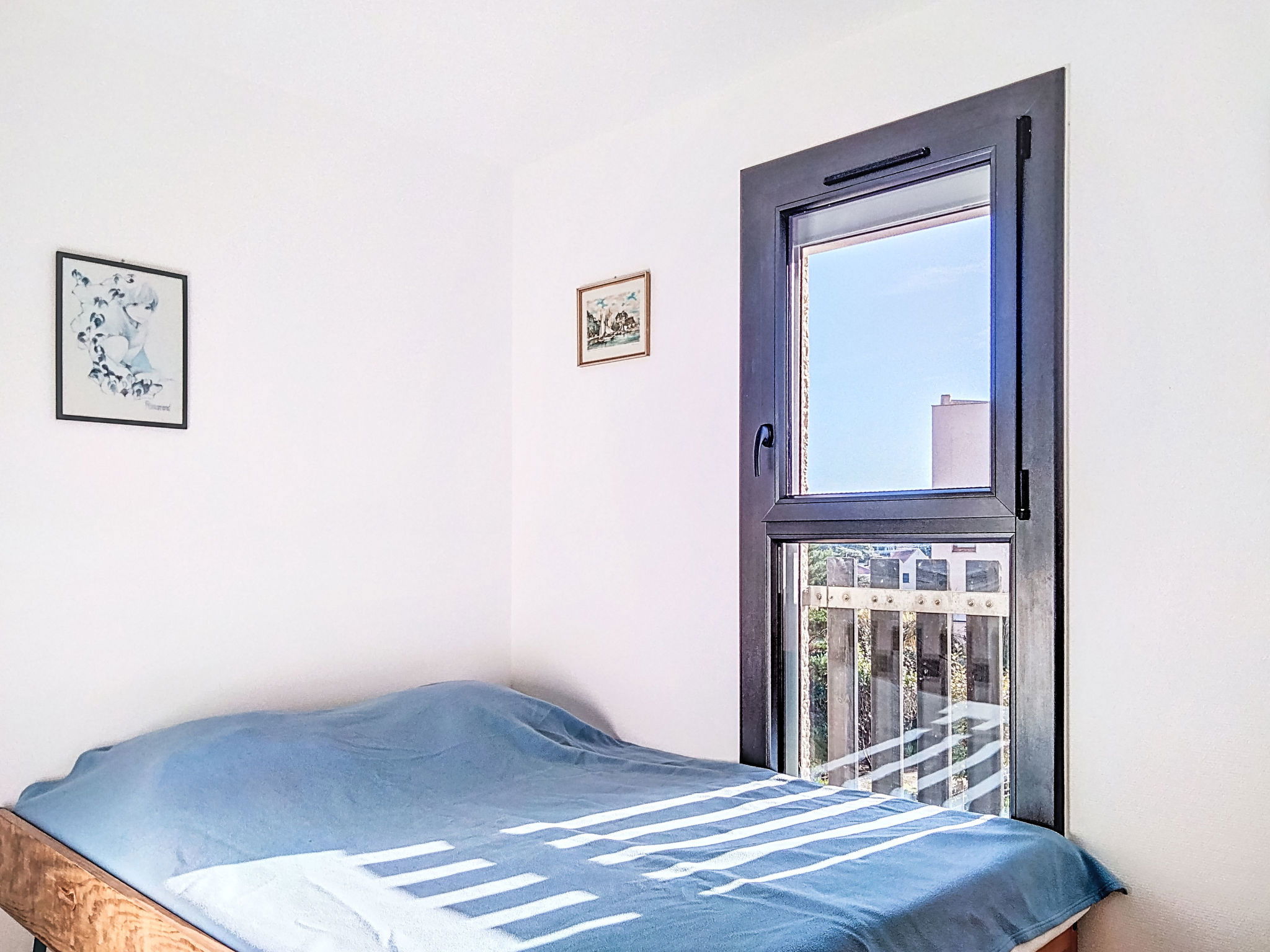 2-room apartment 30 m2 on 1st floor. Living/dining room with 1 double sofabed (140 cm), TV. 1 room with 1 pull-out bed (2 pers.). Kitchenette (oven, 4 ceramic glass hob hotplates, microwave). Bathroom, sep. WC. Heating. Balcony, north-west facing position. Terrace furniture. View of the sea. Facilities: Internet (WiFi, extra). Parking space n 16. Please note: non-smokers only. Maximum 1 pet/ dog allowed. Smoke alarm.