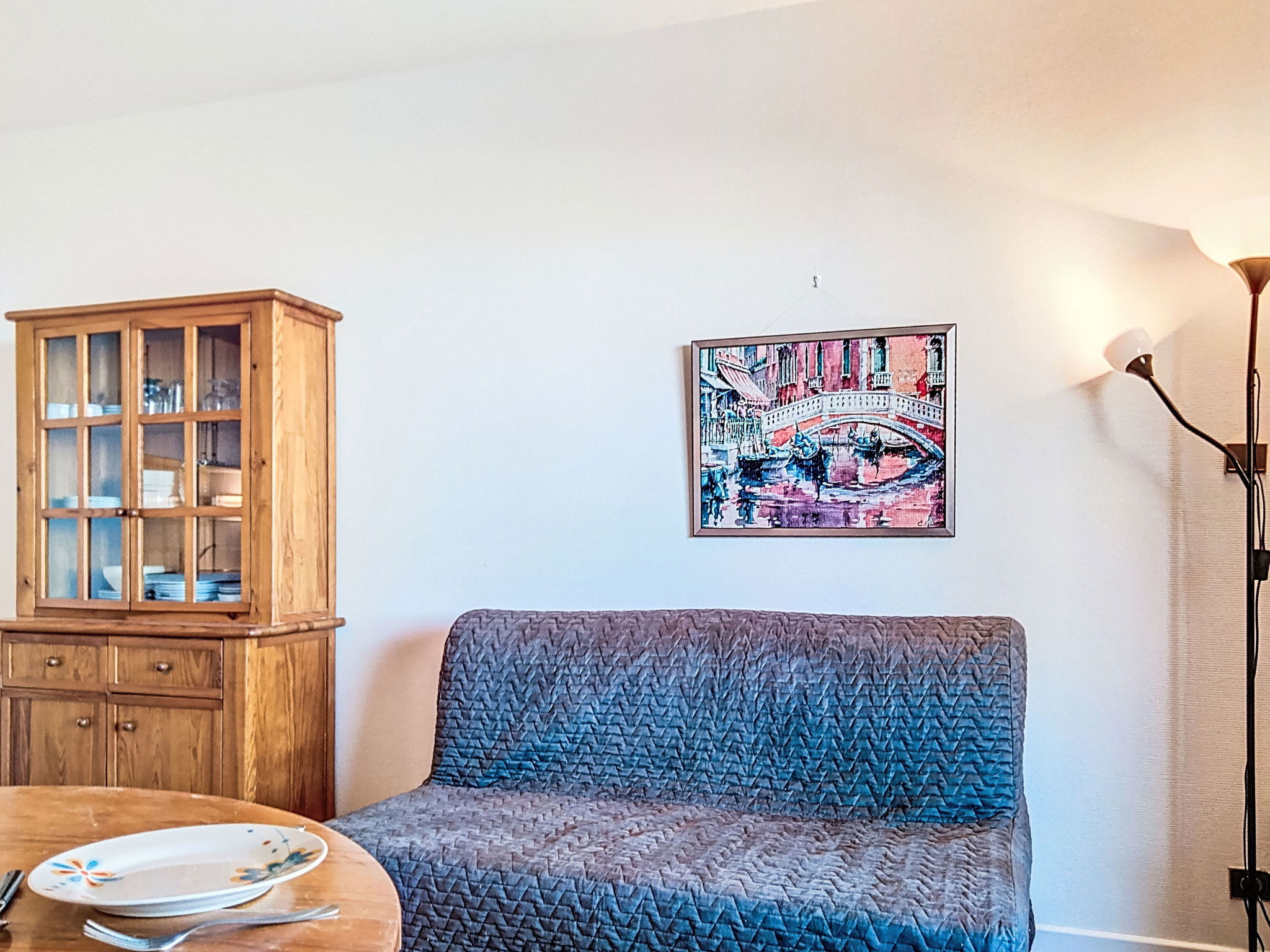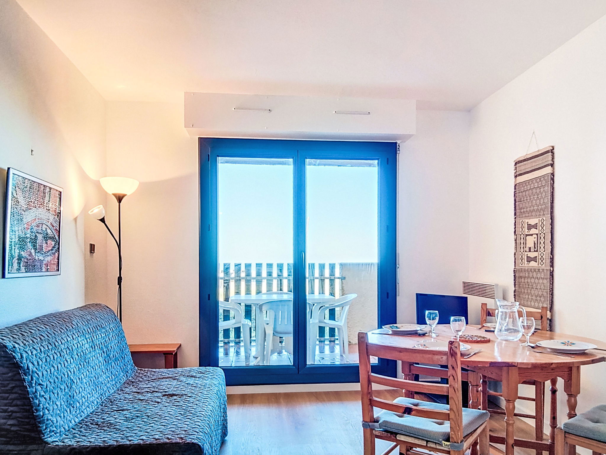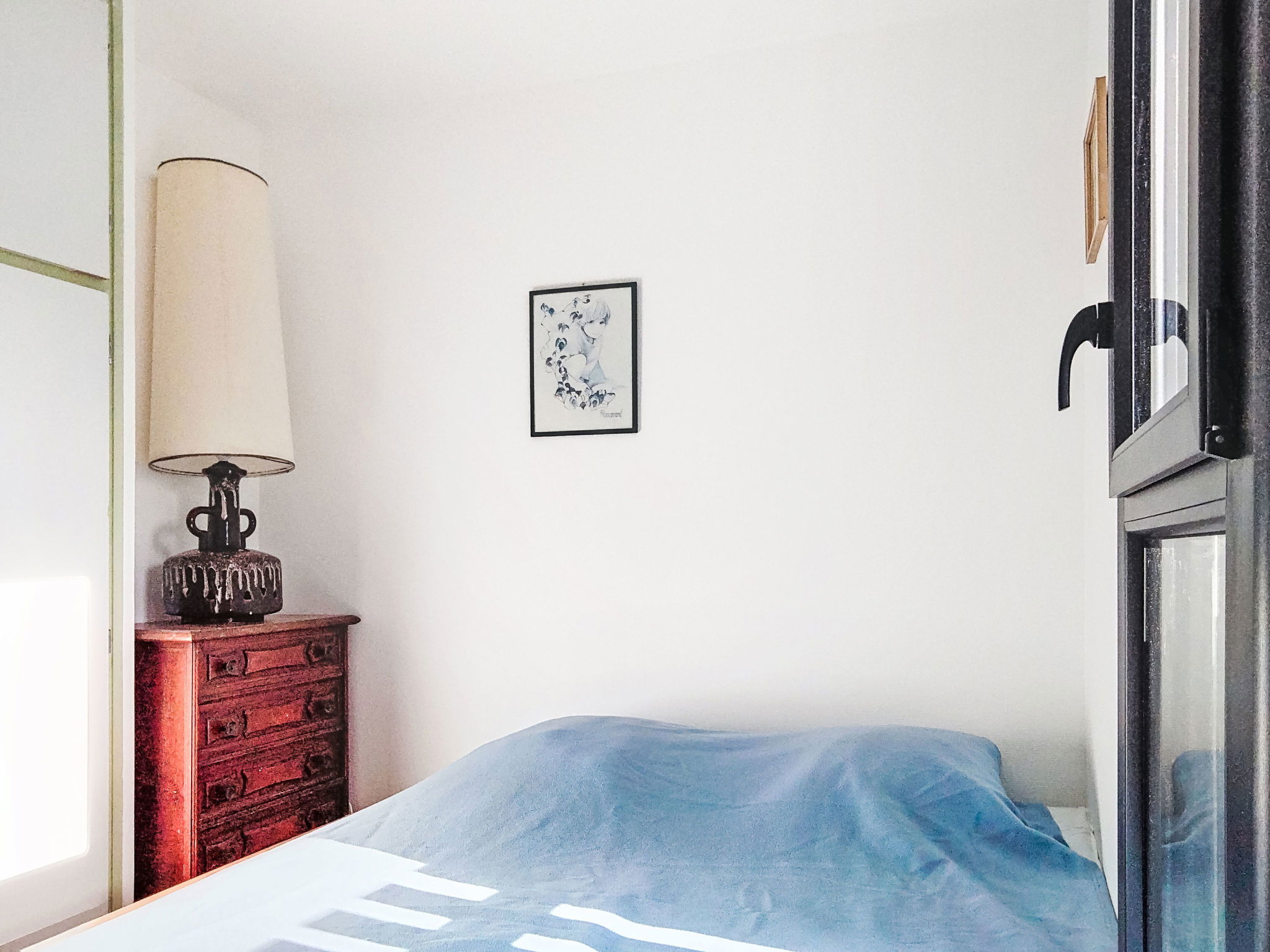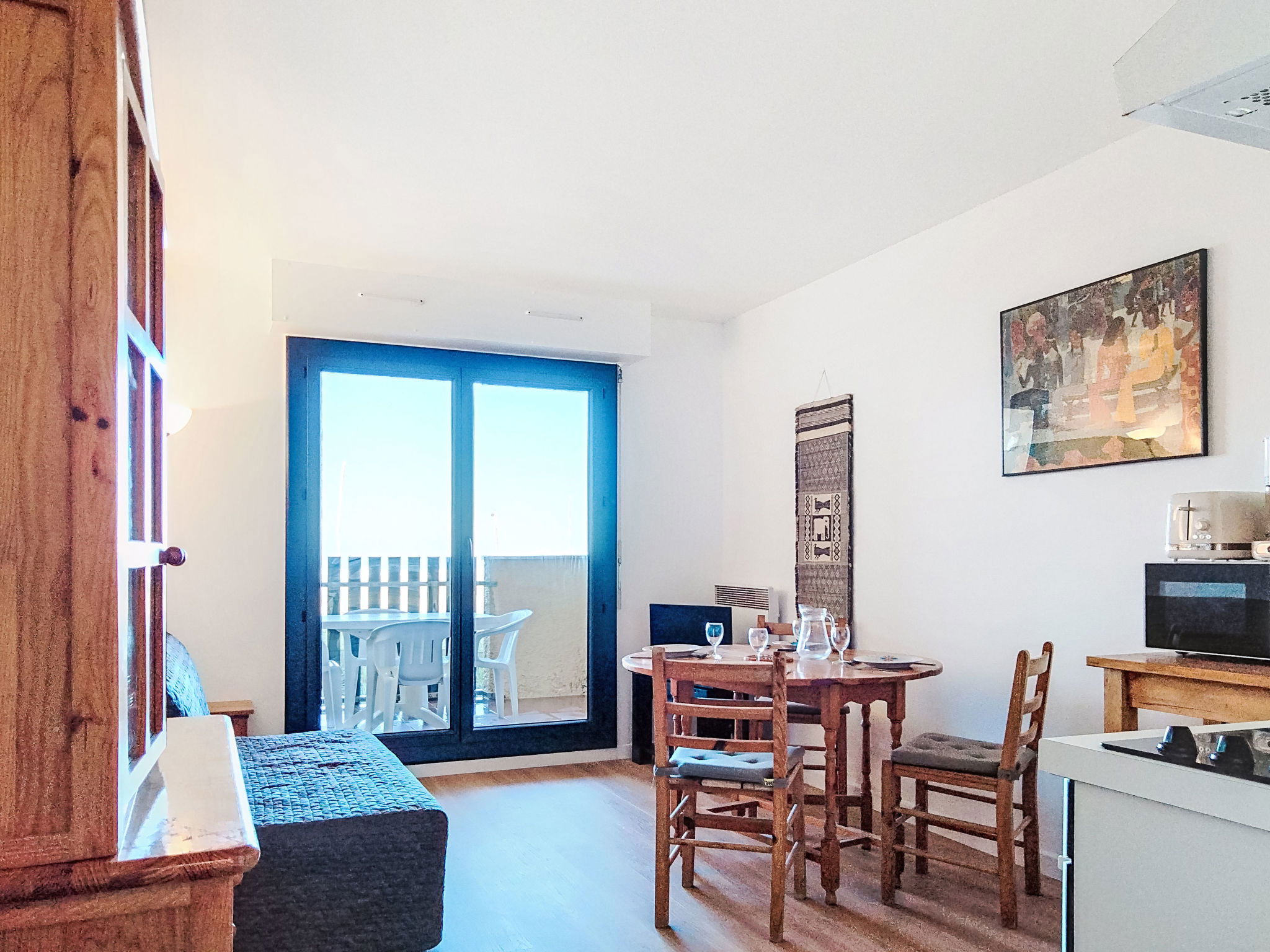 2-room apartment 30 m2 on 1st floor. Living/dining room with 1 double sofabed (140 cm), TV. 1 room with 1 pull-out bed (2 pers.). Kitchenette (oven, 4 ceramic glass hob hotplates, microwave). Bathroom, sep. WC. Heating. Balcony, north-west facing position. Terrace furniture. View of the sea. Facilities: Internet (WiFi, extra). Parking space n 16. Please note: non-smokers only. Maximum 1 pet/ dog allowed. Smoke alarm.