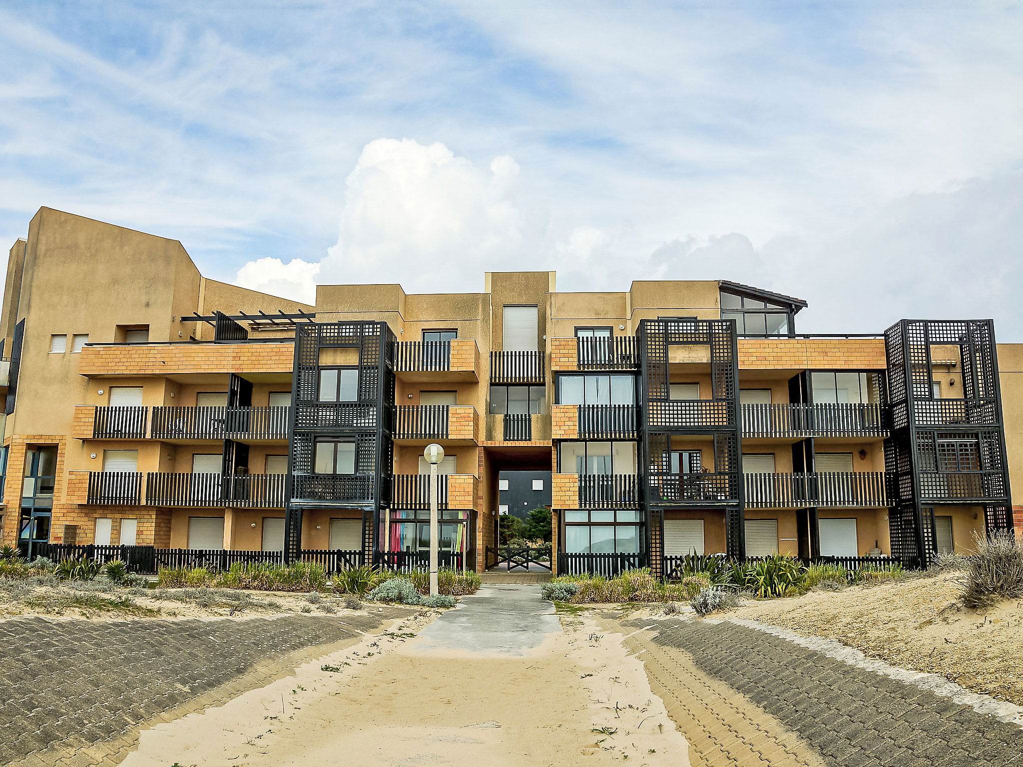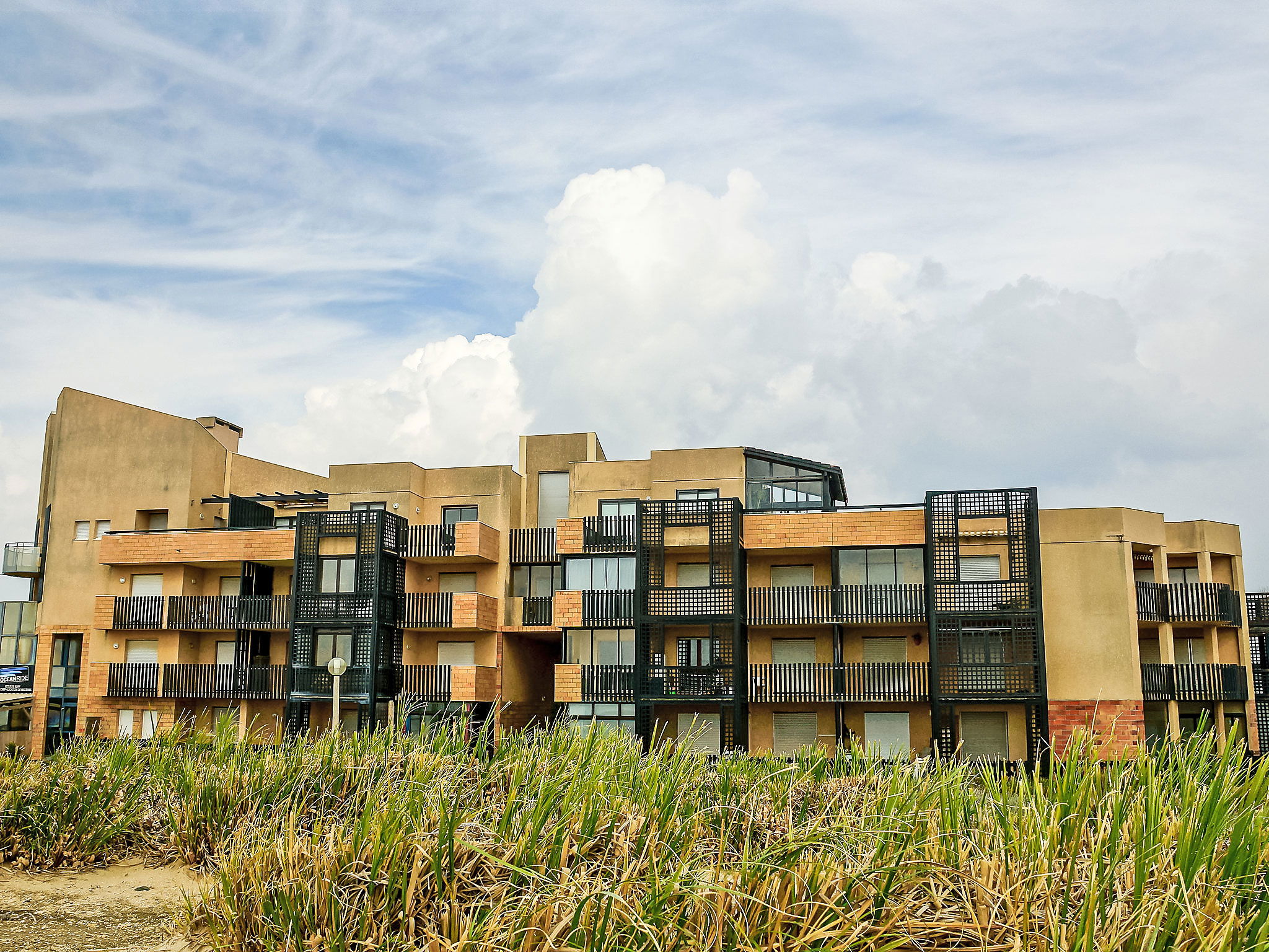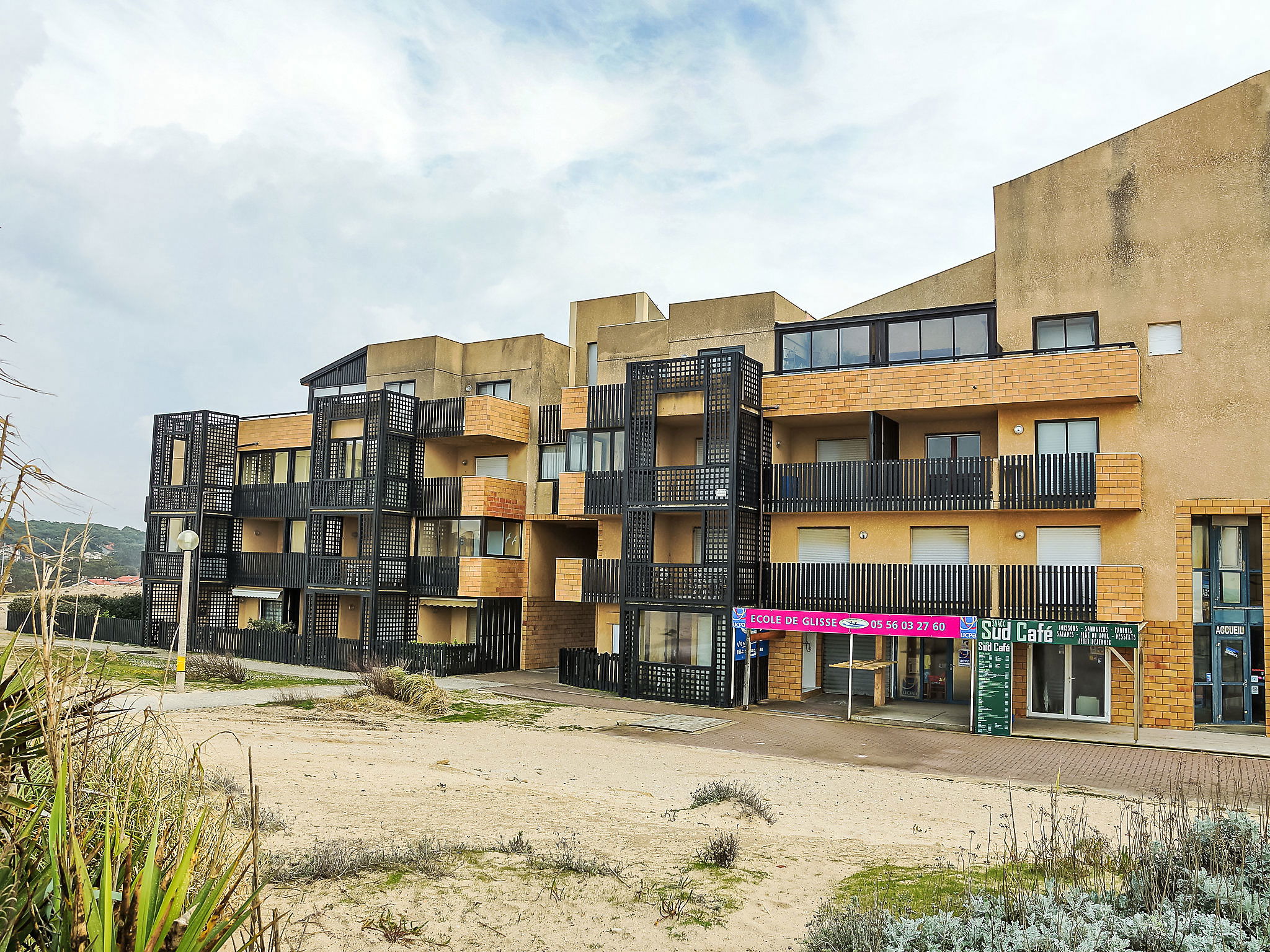 Residence "Horizon Marin", 4 storeys. 400 m from the centre, 45 m from the sea, 6 km from the lake, 45 m from the beach, direct access to the beach. Parking. Shop 400 m, grocery 150 m, supermarket 400 m, restaurant 150 m, bus stop "Salle l'Escoure Océan" 900 m, sandy beach 45 m. Golf course (18 hole) 4 km, tennis 3 km, riding stable 15 km. Please note: Additional accommodations can be booked.