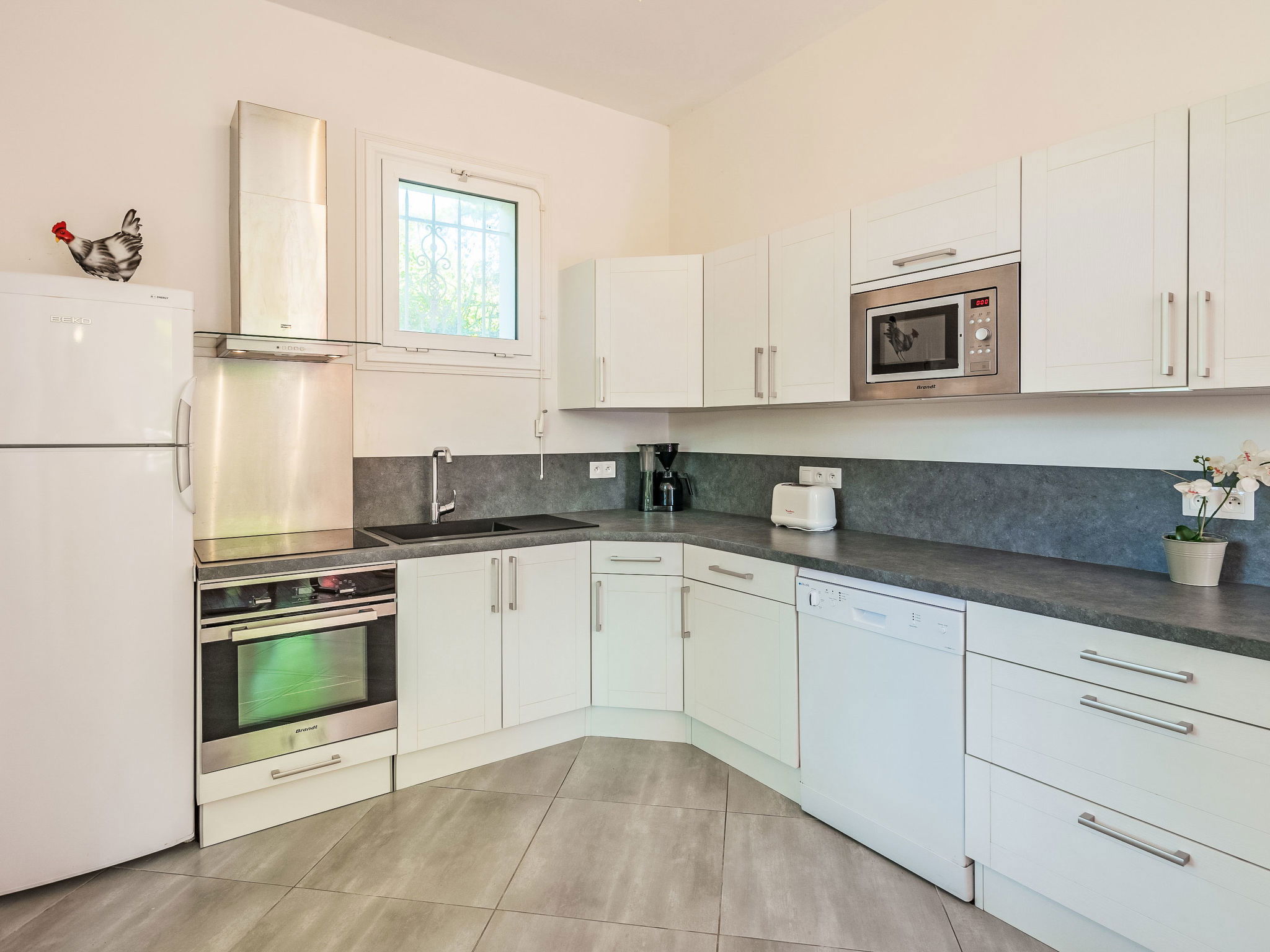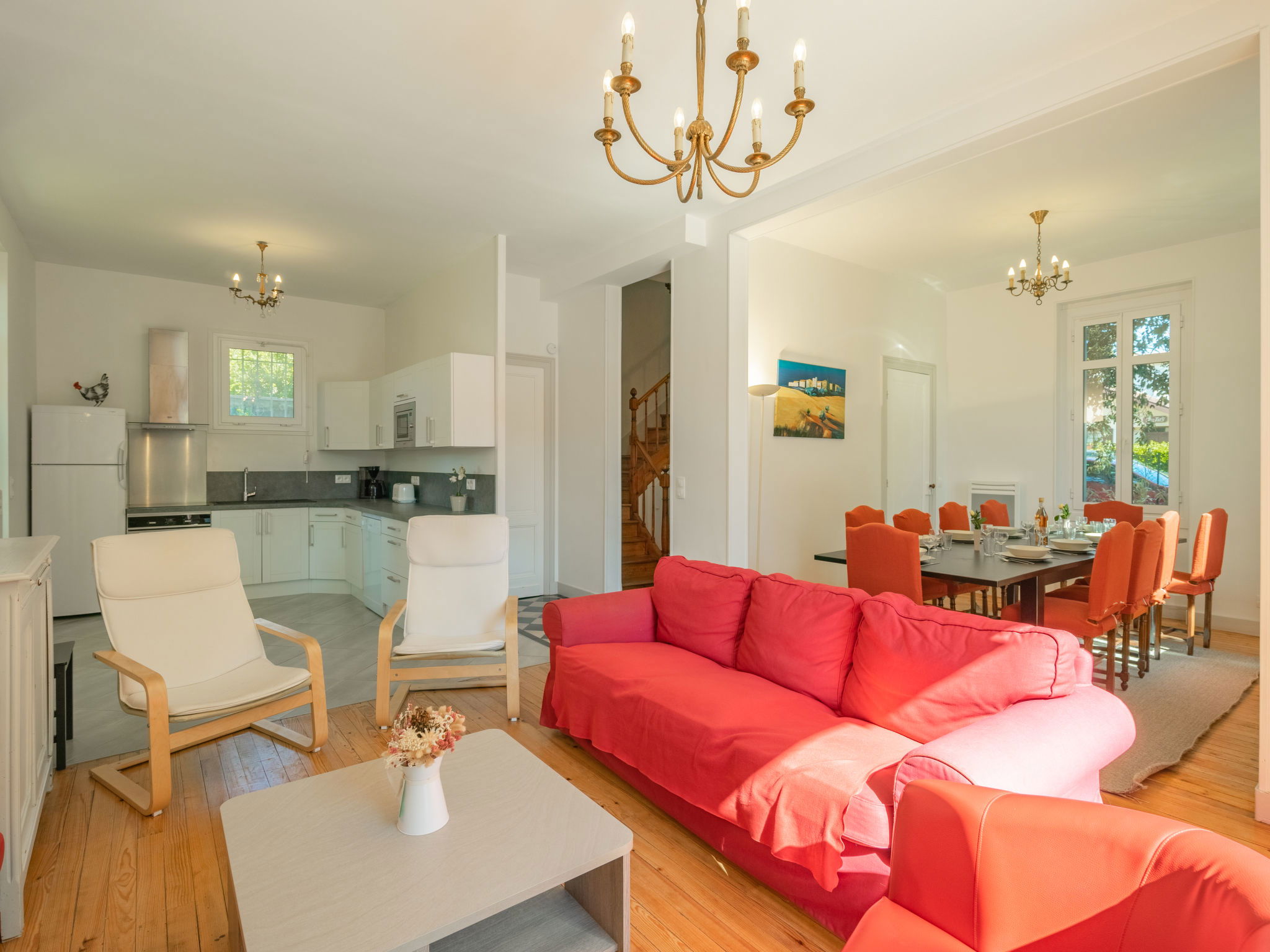 6-room villa 134 m2 on 3 levels, south-west facing position. Fully renovated in 2016, very comfortable and modern furnishings: lounge with TV. Dining room. Exit to the terrace. Open kitchen (oven, dishwasher, 4 ceramic glass hob hotplates, microwave, freezer). Sep. WC. Electric heating. Upper floor: 2 rooms, each room with 1 french bed (1 x 140 cm, length 190 cm). 1 room with 1 french bed (1 x 140 cm, length 190 cm), shower. Shower, sep. WC. 2nd upper floor: 2 rooms, each room with 2 beds (90 cm, length 190 cm). Shower/WC. Large terrace, south facing position and west facing position, garden 500 m2, south facing position and west facing position. Terrace furniture, barbecue. Facilities: washing machine, dryer. Internet (WiFi, free). Parking (2 cars). Please note: smoke alarm.