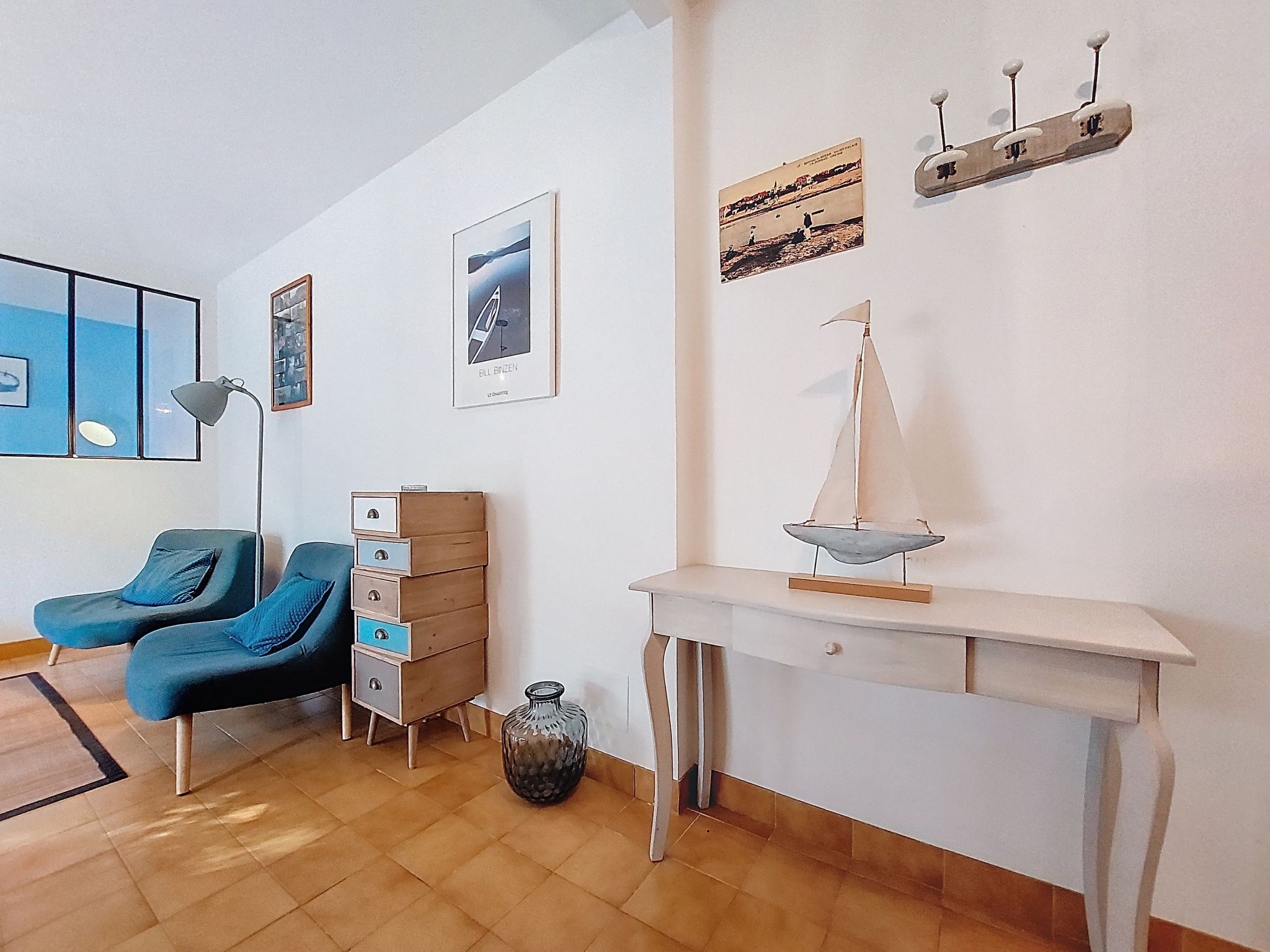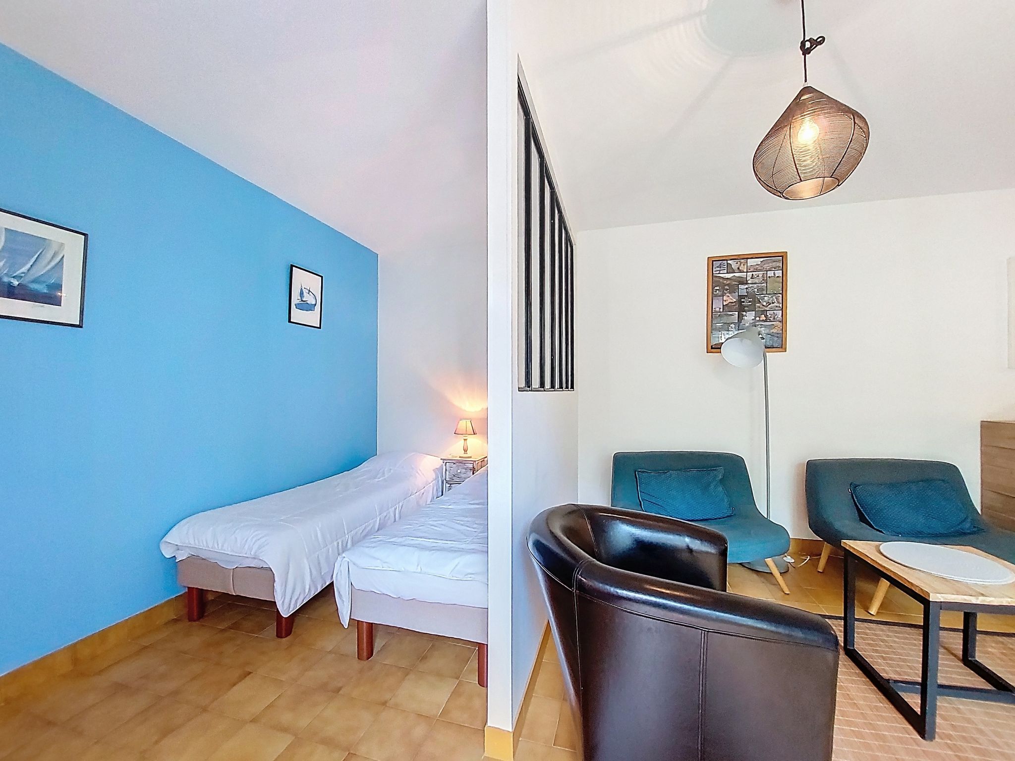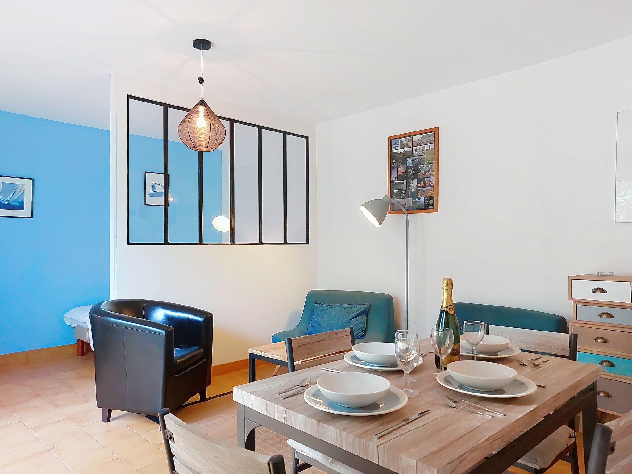 2-room apartment 51 m2 on 1st floor, south facing position. Beautiful furnishings: living/dining room with TV. Exit to the terrace. Alcove with 2 beds (70 cm, length 190 cm). 1 room with 1 french bed (1 x 140 cm, length 190 cm). Kitchen (mini-oven, dishwasher, 3 induction hot plates, microwave, freezer). Shower, sep. WC. Electric heating. Terrace 7 m2, south facing position. Terrace furniture. Facilities: washing machine. Internet (WiFi, free). Parking space n 20. Please note: smoke alarm. Instead of an enclosed bedroom, some sleeping areas are located in an open-plan area (gallery, alcove, etc.).