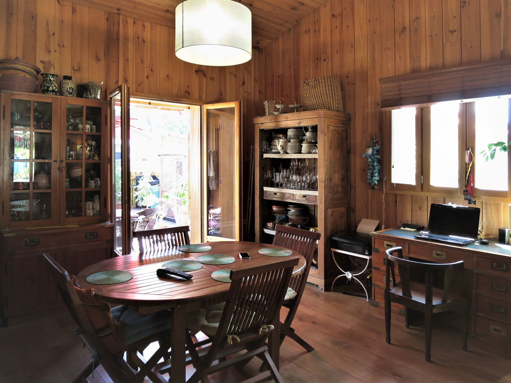 "Ti Kaz Doudou", 4-room house 100 m2. Cosy and wooden furniture furnishings: living/dining room with dining table and TV (flat screen), air conditioning. Exit to the terrace. 1 room with 1 french bed (140 cm, length 190 cm). 1 room with 1 french bed (160 cm, length 200 cm). 1 room with 1 french bed (160 cm, length 200 cm), TV (flat screen). Open kitchen (oven, dishwasher, 2 ceramic glass hob hotplates, 2 gas rings, toaster, kettle, microwave, freezer, electric coffee machine). Bath/shower, sep. WC. Electric heating. Large terrace 160 m2 partly roofed terrace 30 m2. Terrace furniture, barbecue (portable), deck chairs (6). Facilities: washing machine, dryer, iron. Internet (WiFi, free). Please note: non-smoking house. Smoke alarm. Offer by a private individual according to Art. 155, IV of CGI.