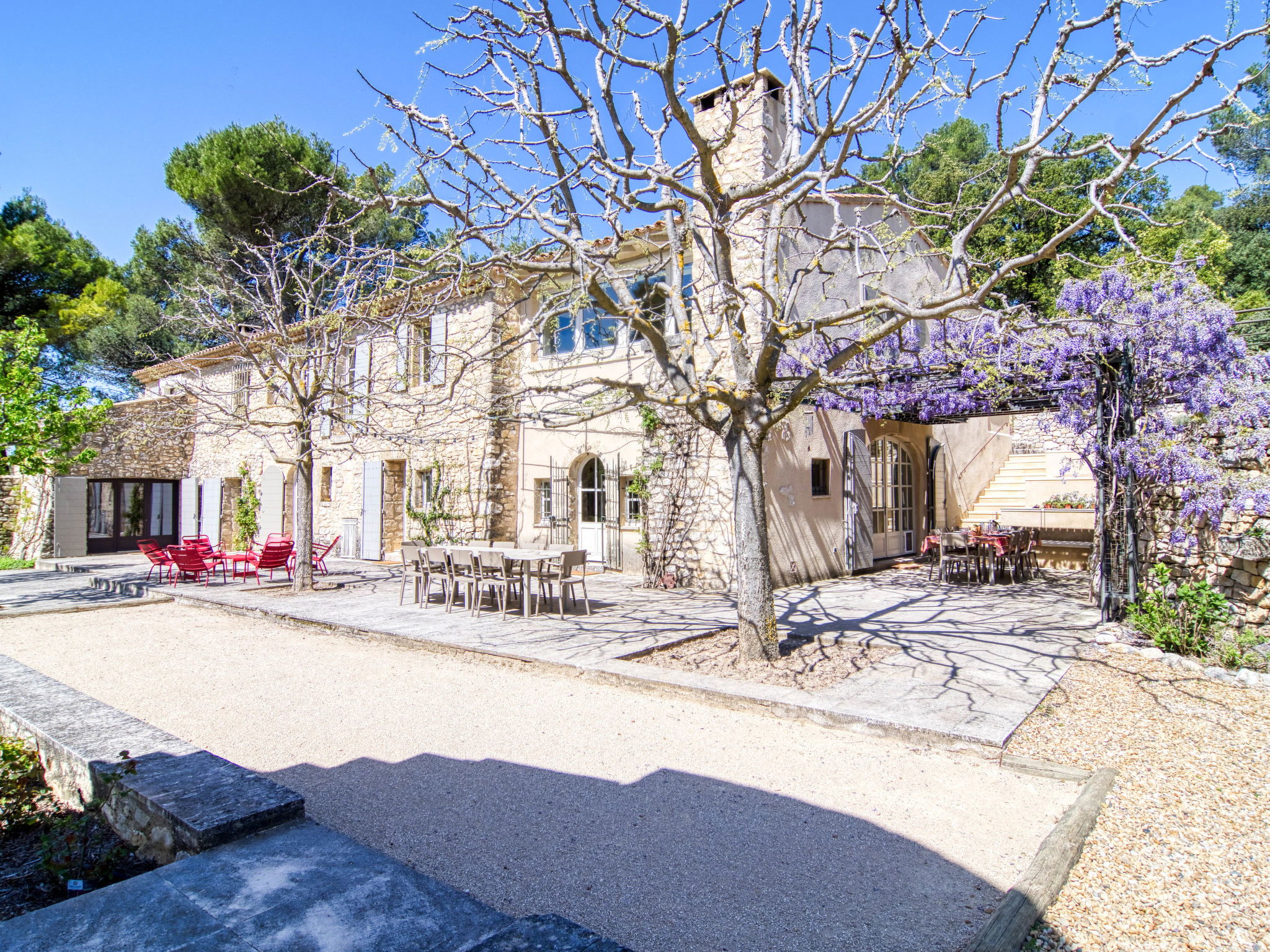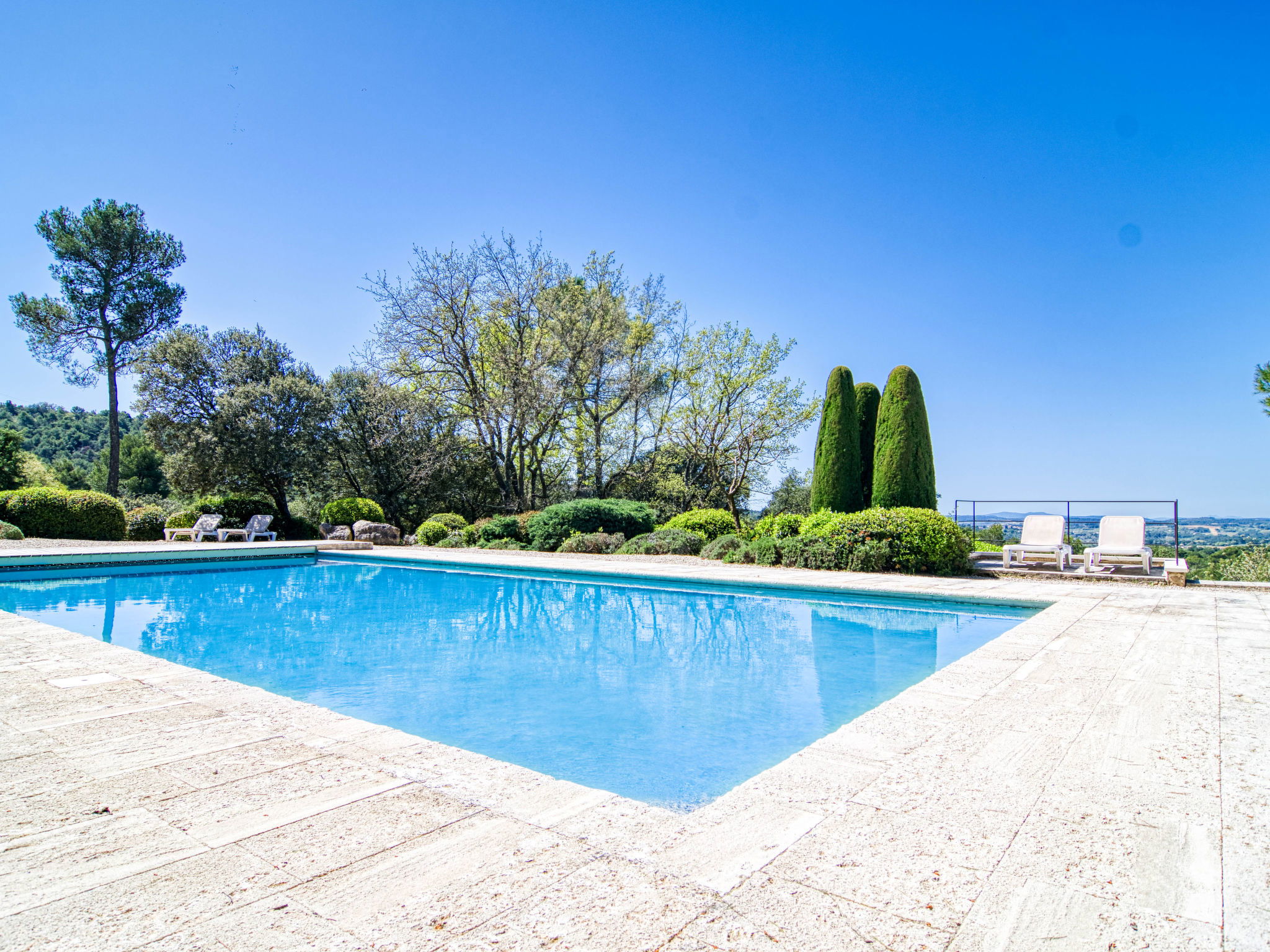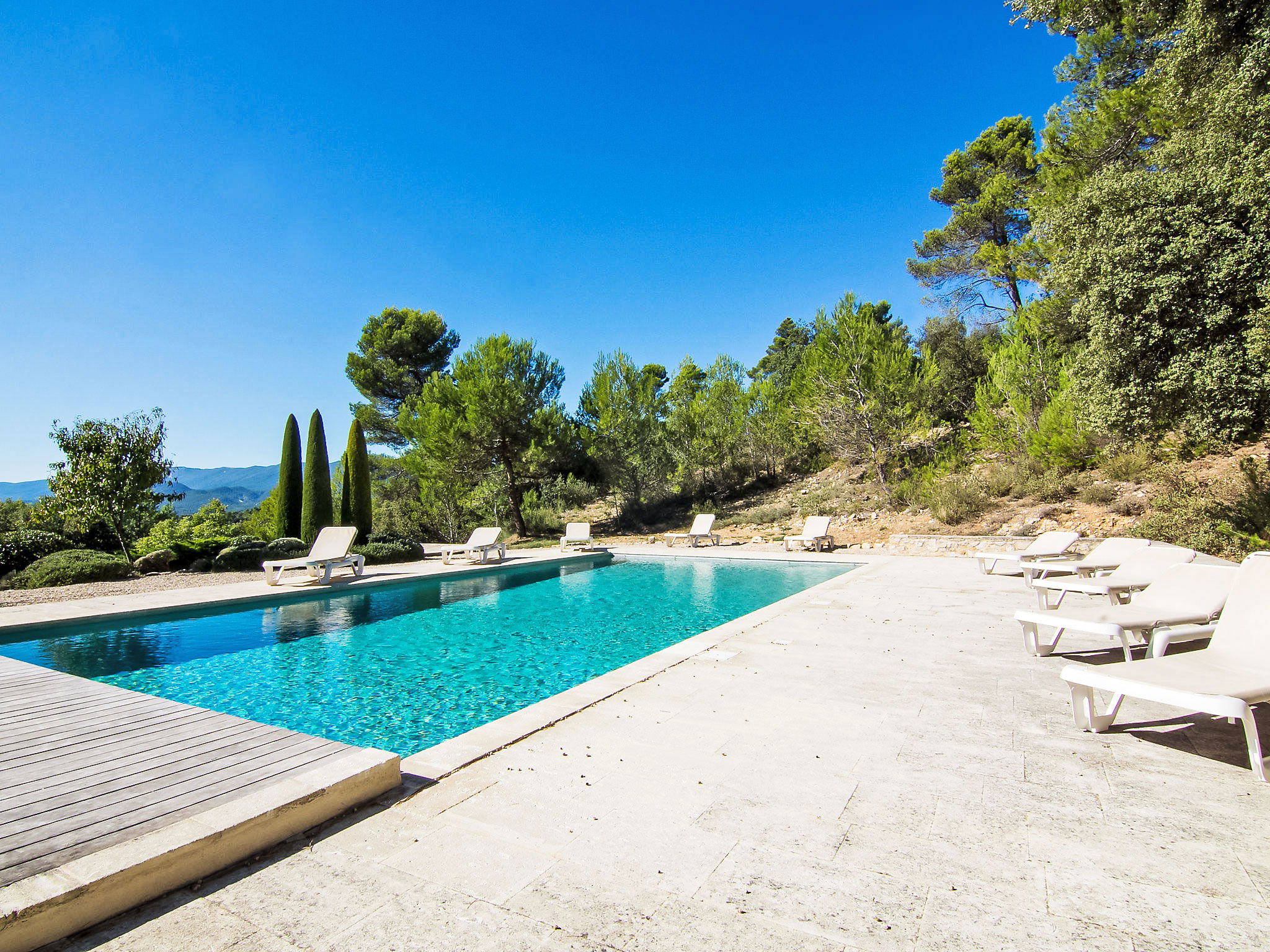 Located on land made up of woods, an olive grove and a lavender field. Available: plancha. Petanque pitch in front of the house. Pond at 150m with pontoon. two fountains on the property. On request, in addition, possibility of securing the services of a caterer or cook. Very beautiful house 2 storeys, surrounded by trees. Outside the resort, in a secluded, quiet, elevated position. Private: park 32 ha with trees, pond, swimming pool (12 x 6 m, depth 100 - 180 cm, seasonal availability: 01.May. - 30.Sep.) with internal staircase and shutter cover. Boules, terrace (20 m2), garden furniture, bathing jetty, pool maintenance by the owner/gardener. In the house: central heating system. Linen change (suppl. charge extra). Towel change (suppl. charge extra). Room cleaning daily on request (extra). Cook on request (extra). 1.7 km long bumpy motor access (via unmade road). Shop 5 km, restaurant 5 km, bus stop "Régusse" 8.5 km. Golf course (18 hole) 15 km, tennis 10 km. Please note: car recommended.