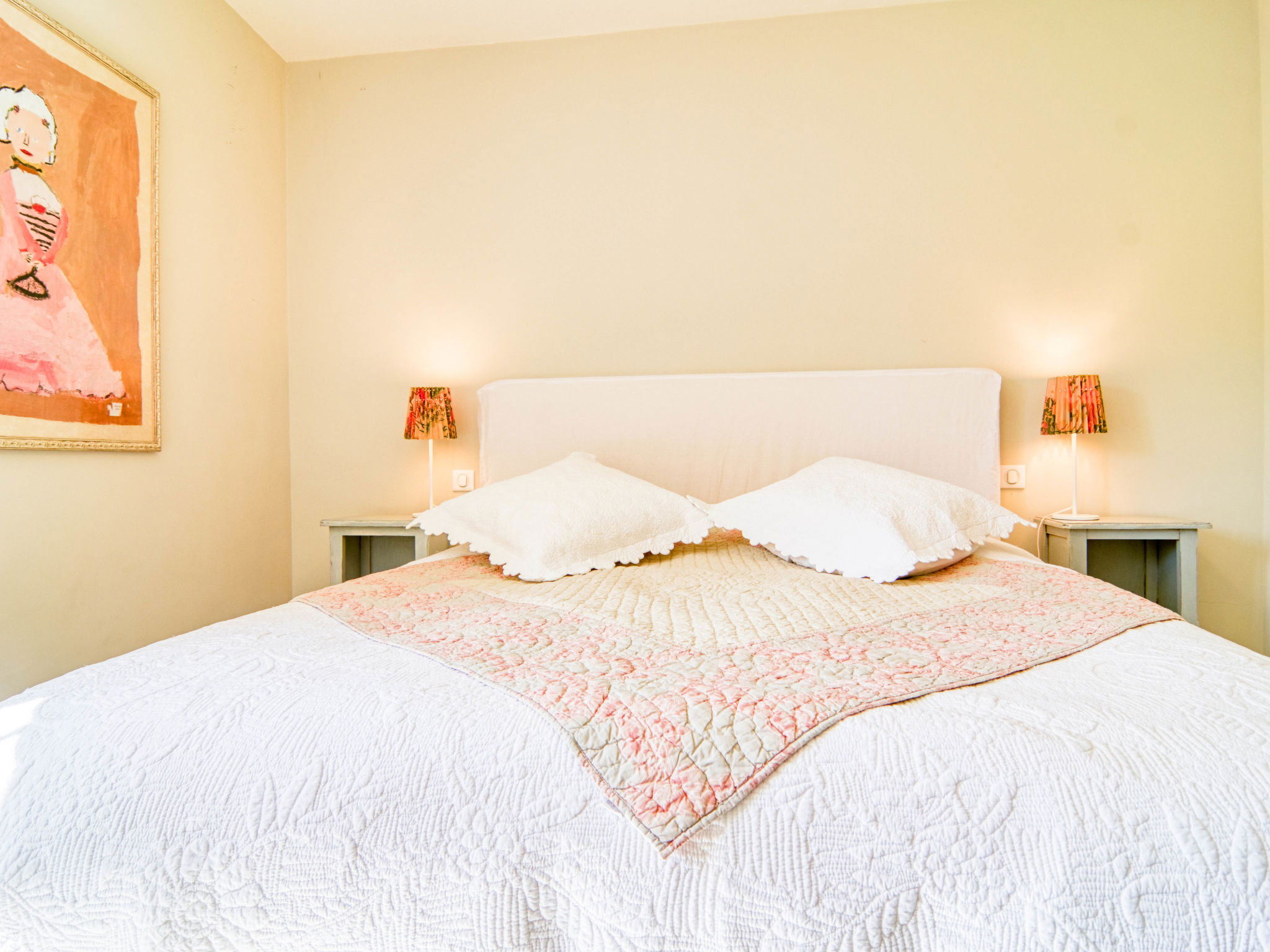9-room house 500 m2 on 2 levels. Fully renovated: large entrance hall. Lounge 100 m2. Exit to the terrace. Lounge 30 m2 with satellite TV. Dining room 30 m2. Exit to the terrace. Kitchen 60 m2 (4 hot plates, oven, dishwasher, microwave) with dining table. Exit to the terrace. Sep. WC. Upper floor: 1 room with 1 french bed (1 x 180 cm, length 200 cm), separate WC and bath/shower. 1 room with 1 french bed (1 x 160 cm, length 200 cm), shower. 1 room with 1 french bed (1 x 180 cm, length 200 cm), shower. 1 room with 1 double bed (2 x 90 cm, length 200 cm), shower. 1 room with 1 double bed (2 x 90 cm, length 200 cm), shower/WC. 1 large room with 1 x 2 bunk beds (90 cm, length 200 cm), 1 french bed (1 x 180 cm, length 200 cm), separate WC and shower. Exit to the terrace. Sep. WC. Facilities: washing machine, dryer, safe, baby cot for up to 2 year olds. Internet (WiFi, free). Please note: non-smoking house. Maximum 1 pet/ dog allowed. Smoke alarm. In two of the bedrooms, it is possible to separate the large double beds into two single beds if you notify us. 84052000035J2