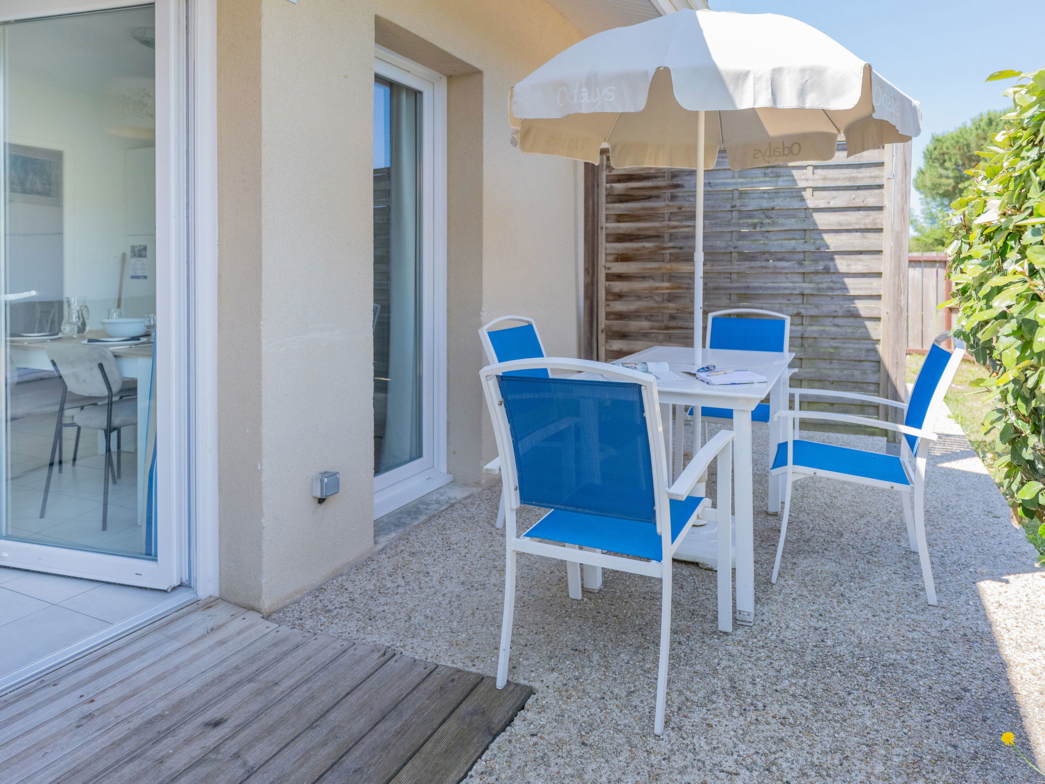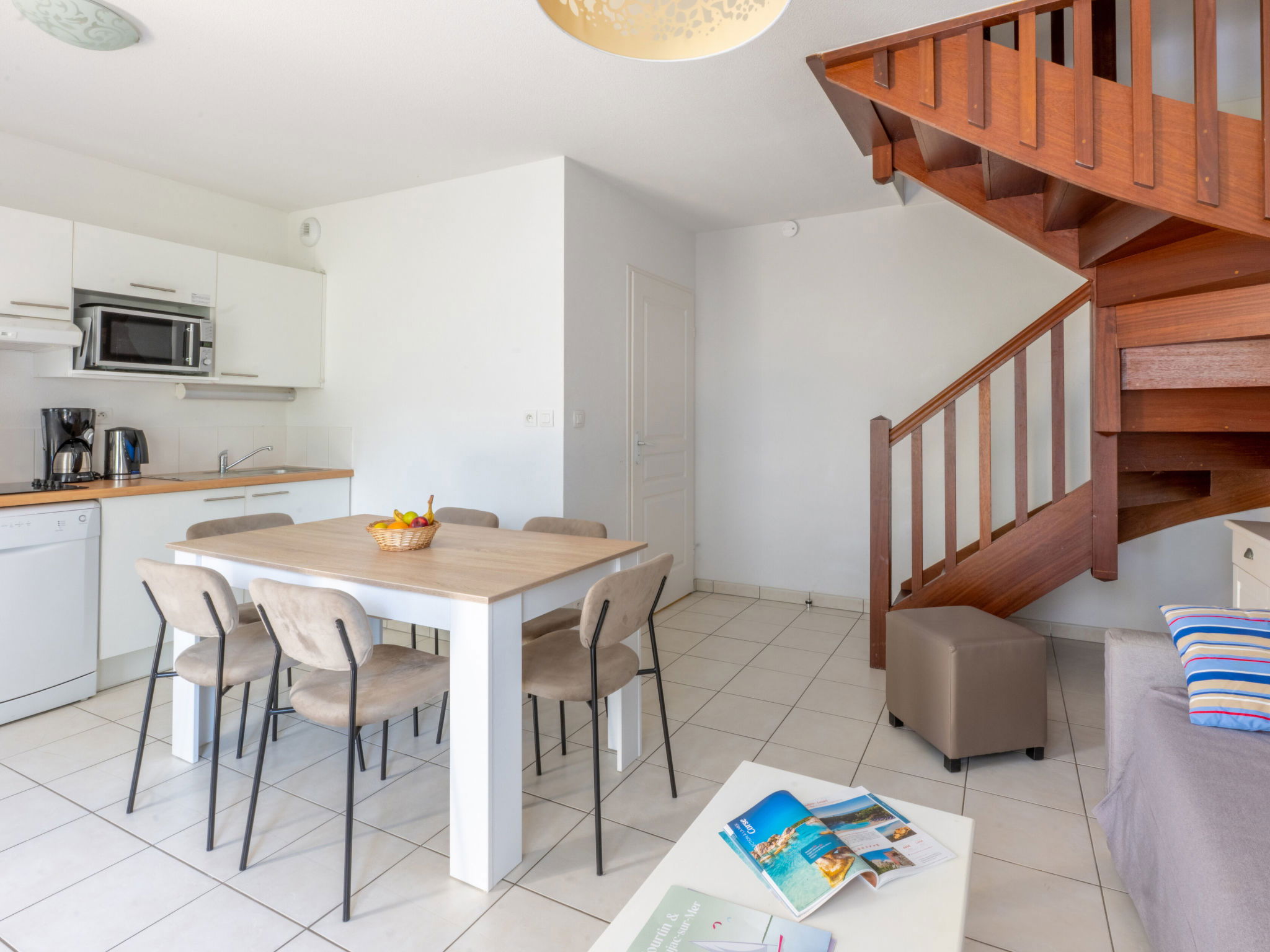 "Résidence Odalys Référence Le Petit Pont", 3-room terraced house 43 m2 on 2 levels. Practical furnishings: living/sleeping room with 1 pull-out bed (2 pers.), dining table and TV. Exit to the terrace. Small, open kitchen (dishwasher, 4 ceramic glass hob hotplates, kettle, microwave, freezer, electric coffee machine). Sep. WC. Upper floor: 1 room with 1 double bed (160 cm). 1 room with 2 beds. Shower. Electric heating. Carpet. Terrace. Terrace furniture. Facilities: children's high chair, baby cot (extra). Internet (WiFi, free). Please note: non-smoking house. Maximum 1 pet/ dog allowed. Smoke alarm.