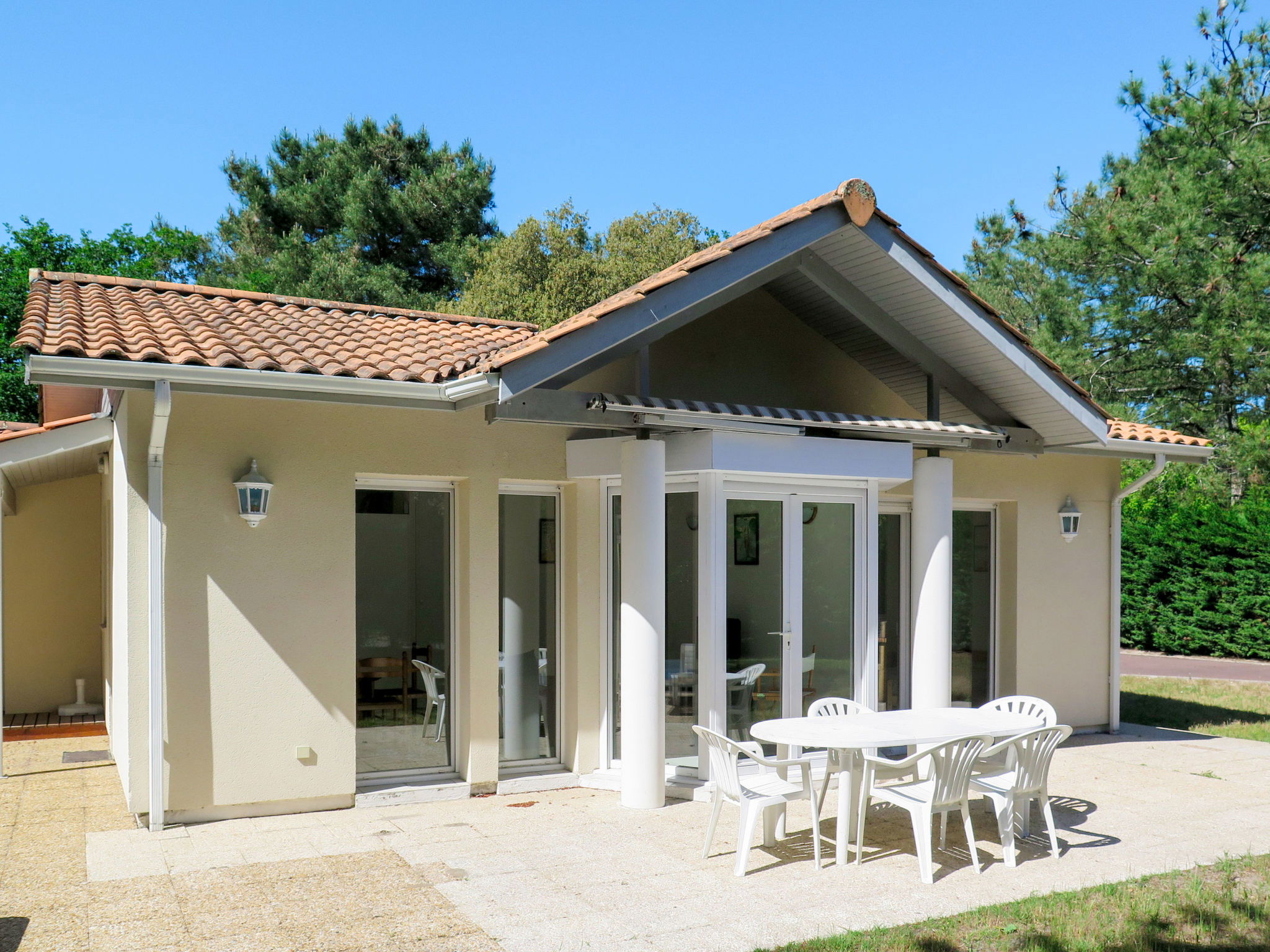 Resort "Green Parc". 40 apartments in the residence. 1.5 km from the centre of Lacanau-Océan, 10 km from the centre of Lacanau, 55 km from the centre of Bordeaux, 3 km from the sea, 2.5 km from the lake, 3 km from the beach. For shared use: property. Private: swimming pool (8 x 4 m, seasonal availability: 04.Apr. - 15.Oct.). In the complex: reception, WiFi (extra). Parking. Shop 1.5 km, bus stop "Le Huga" 1 km, sandy beach 3.5 km, lake de Lacanau 2.5 km. Golf course (18 hole) 200 m. Please note: the photograph shows a typical example. The holiday properties may differ in living space, floorplan, equipment and furnishing.