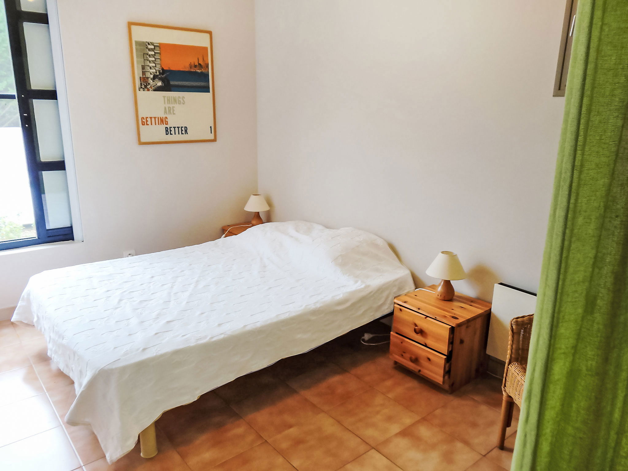 4-room house 110 m2. Living/dining room with open-hearth fireplace, TV and DVD. Exit to the terrace. 1 room with 1 french bed and shower. 1 room with 1 pull-out bed (2 pers.). 1 room with 1 french bed. Open kitchen (4 hot plates, oven, dishwasher, microwave, freezer, electric coffee machine) with bar. Bathroom, sep. WC. Electric heating. Terrace 20 m2. Terrace furniture, electric barbecue, deck chairs. Facilities: washing machine, iron, mosquito net. Internet (WiFi, free). Please note: maximum 1 pet/ dog allowed. Smoke alarm. Access to the living/dining room via 3 steps.