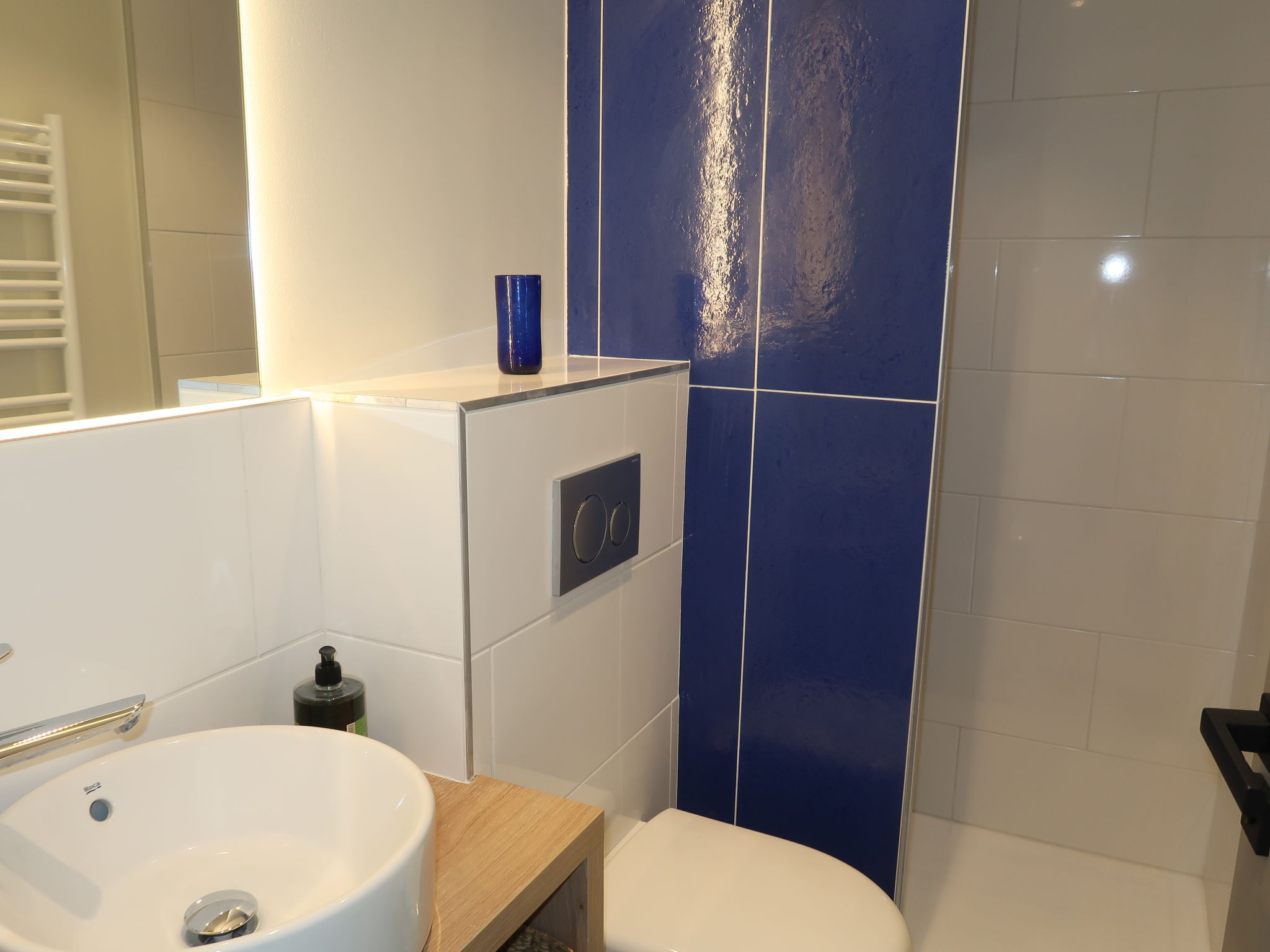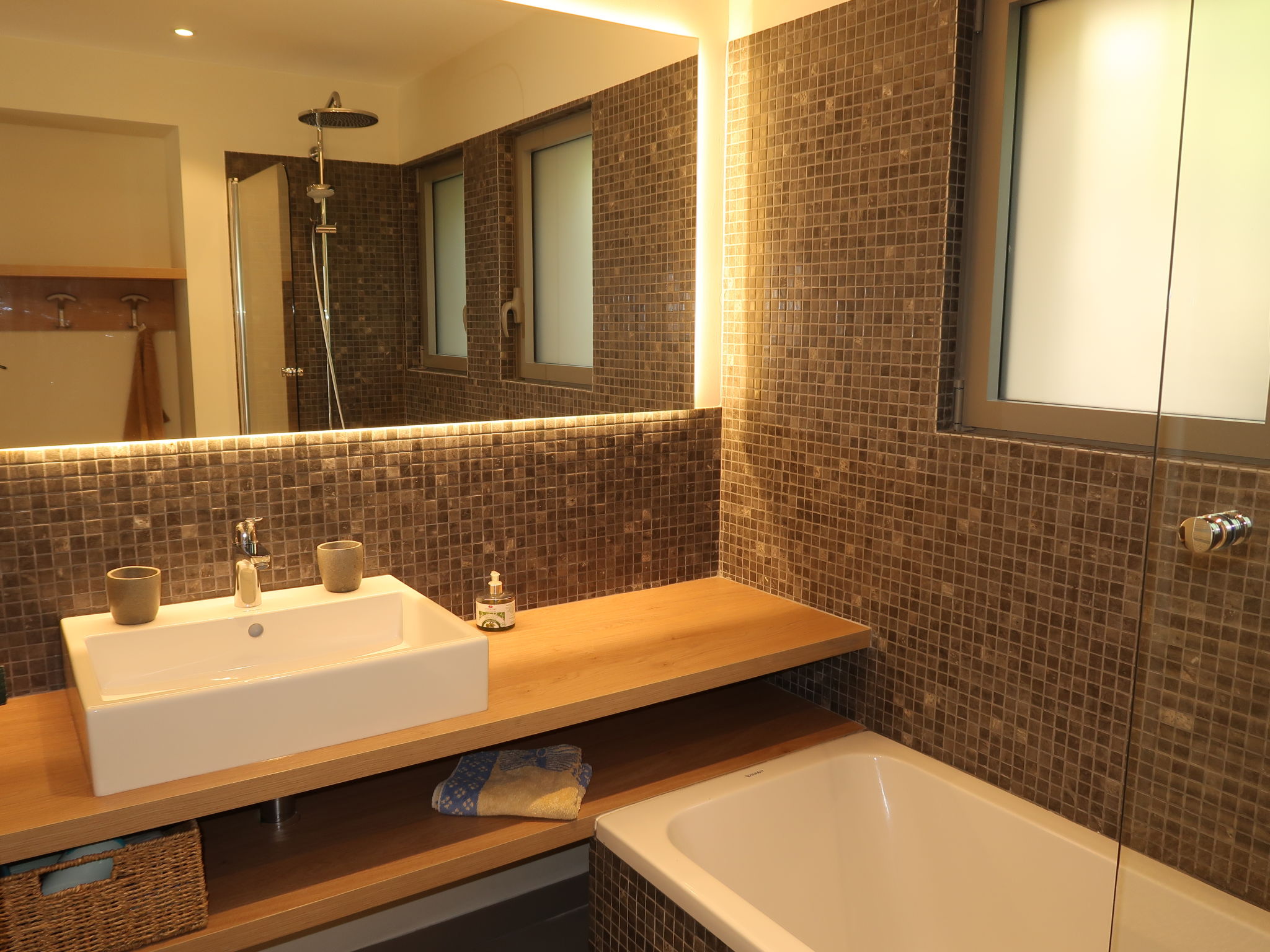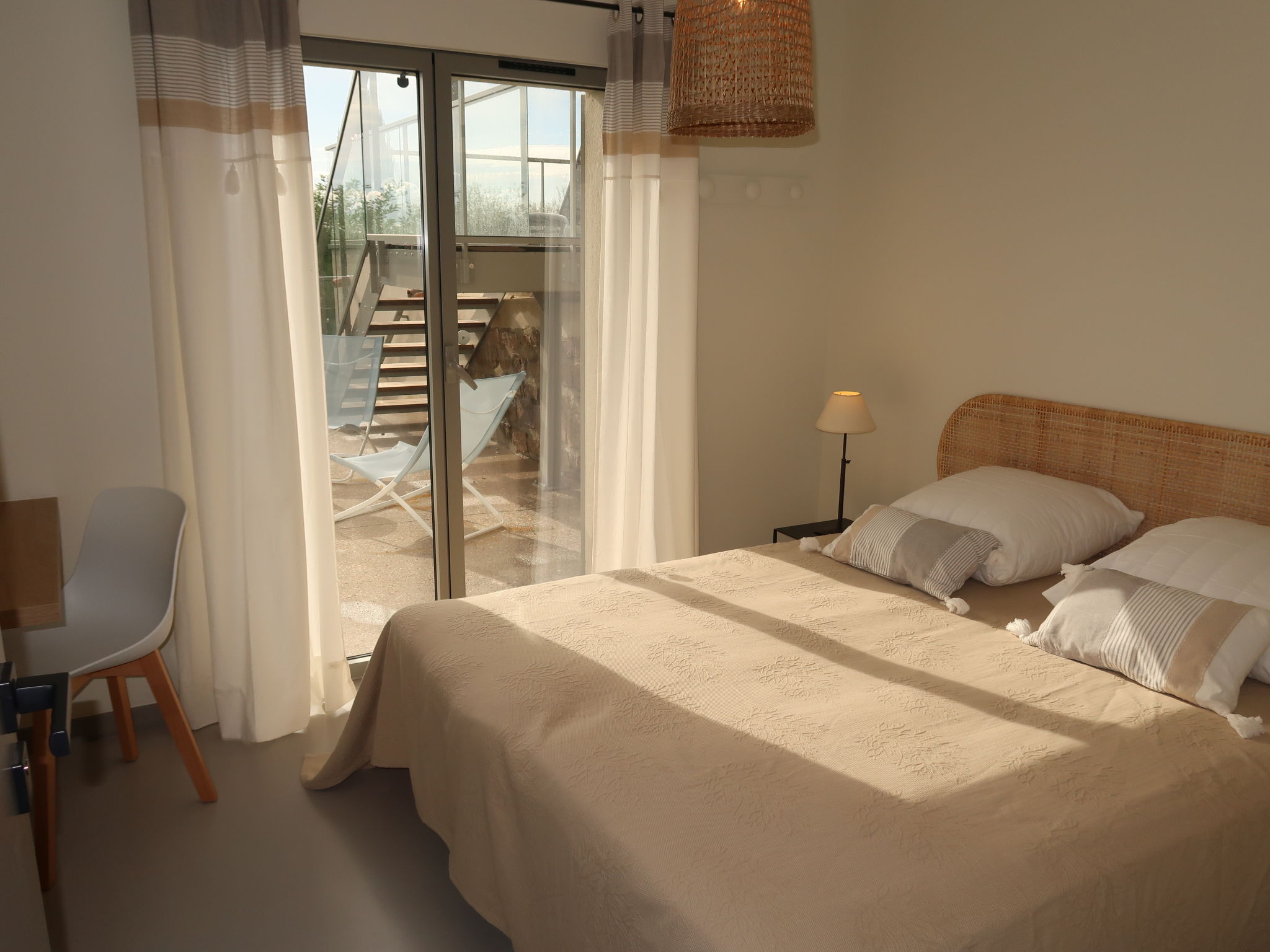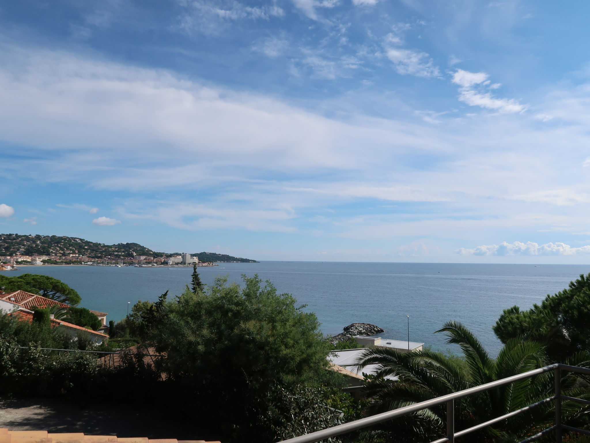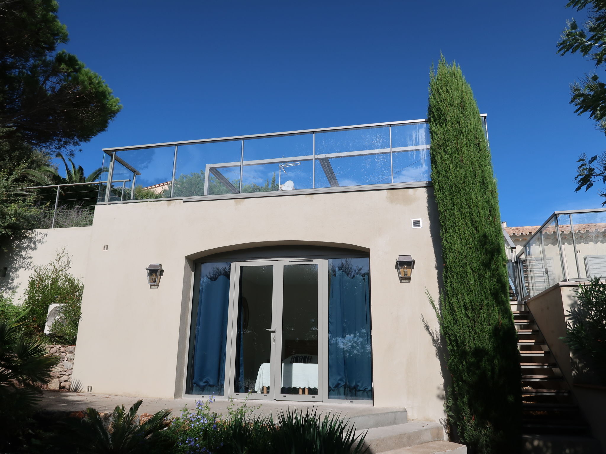 6-room house 150 m2 on 2 levels. Renovated in 2020, modern and tasteful furnishings: entrance hall. Living/dining room with dining table and TV. Exit to the terrace. Open kitchen (oven, dishwasher, 4 induction hot plates, toaster, kettle, microwave, freezer, electric coffee machine). On the lower ground floor: 2 rooms, each room with 2 beds (80 cm, length 200 cm). Exit to the terrace. 1 room with 2 beds (80 cm, length 200 cm). 1 room with 1 french bed (140 cm, length 200 cm). Studio with 2 beds (80 cm, length 200 cm), shower/WC. Bathroom, shower/WC, sep. WC. Electric heating, air-conditioning. Terrace 50 m2. Terrace furniture, deck chairs (5). Panoramic view of the sea and Saint Tropez. Facilities: washing machine, dryer. Internet (WiFi, free). Please note: non-smoking house. The studio is only accessible from outside. There is an electric plancha on the terrace. 83115003369MX