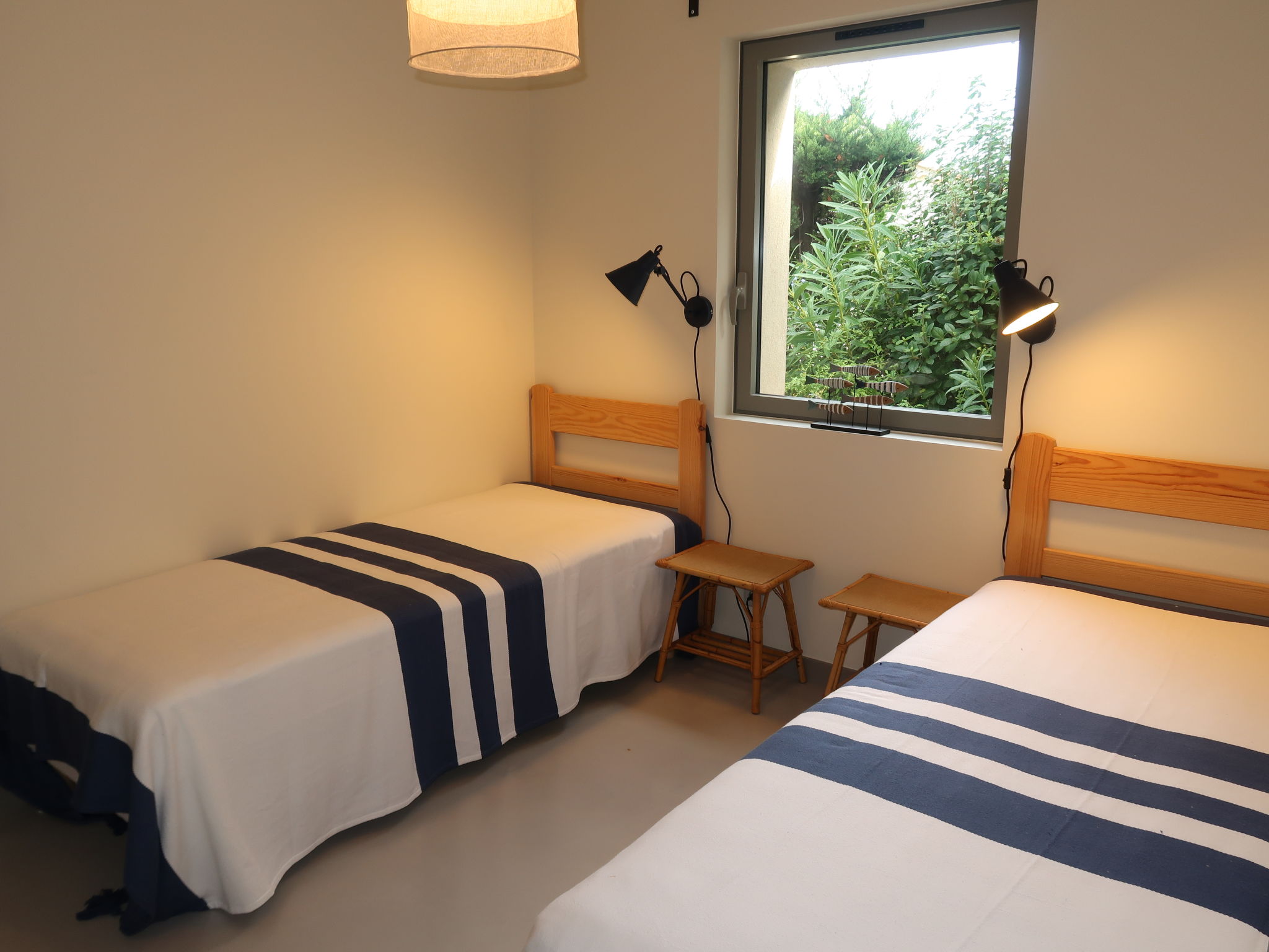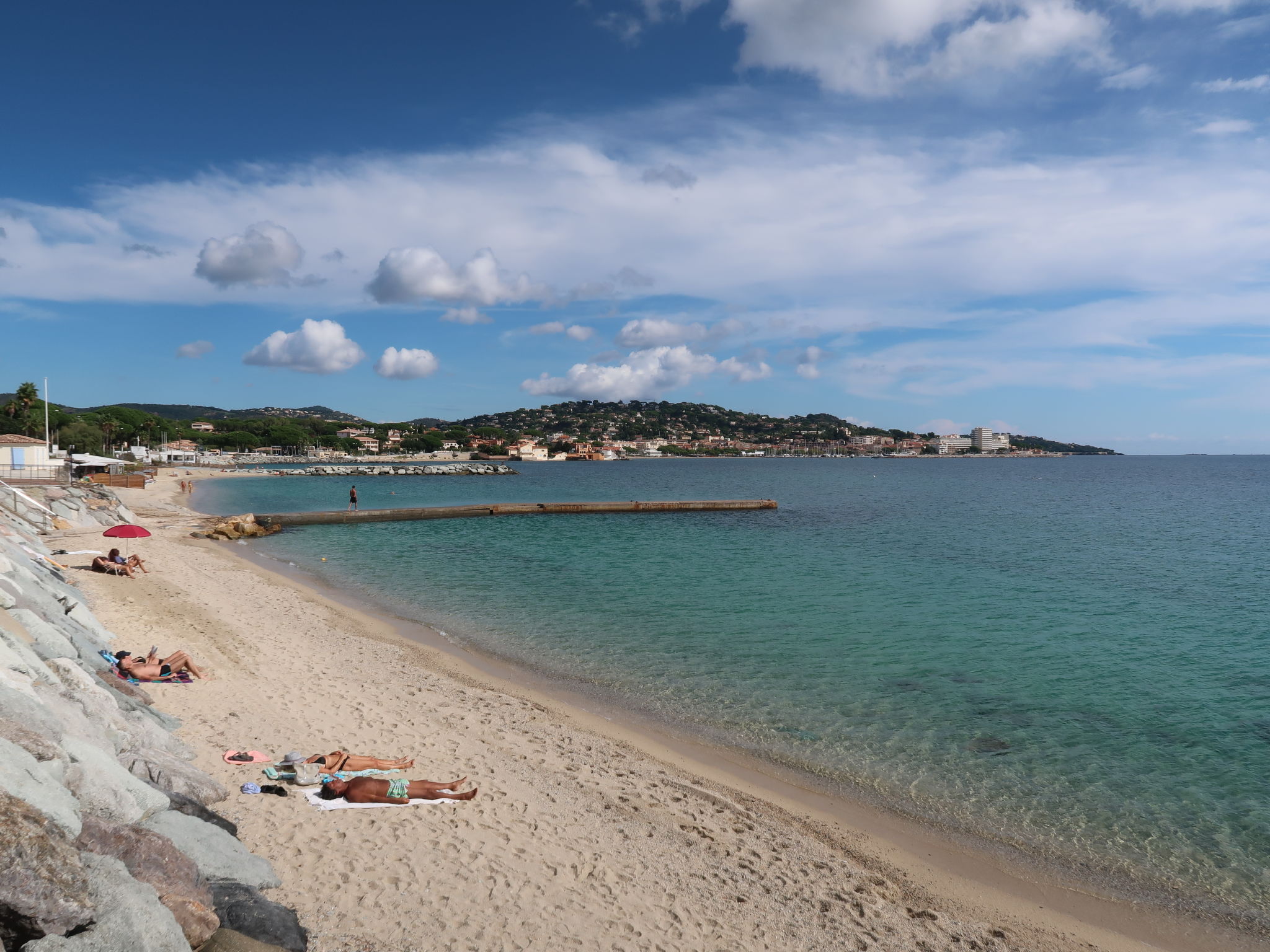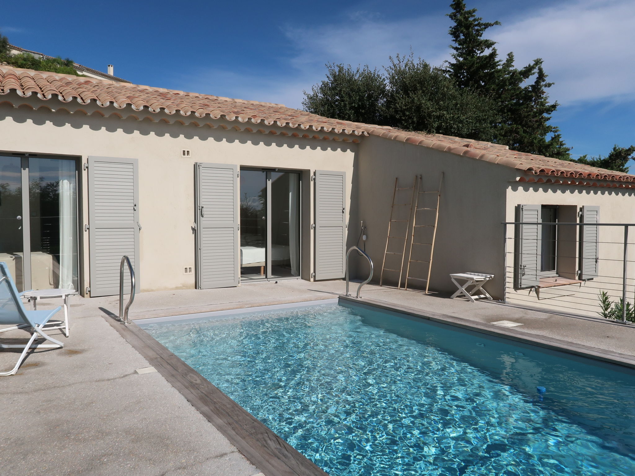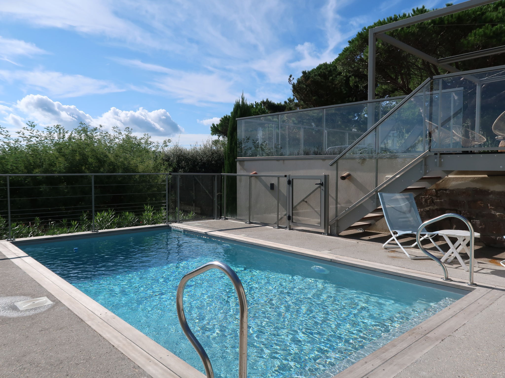 Modern, beautiful villa "Farfalla". 1.5 km from the centre of Sainte Maxime, 13 km from the centre of Saint Tropez, 25 km from the centre of Saint Raphael, residential area (villas), 200 m from the sea, 200 m from the beach. Private: well-kept terraced garden, 1'500 m2 (fenced) with wildlife garden, swimming pool fenced (6 x 3 m, depth 80 - 150 cm, seasonal availability: 01.Mar. - 31.Oct.) with salt-electrolysis pool-cleaning system. Outdoor shower, boules. Stepped path (15 steps) to the house. Parking (for 2 cars) on the premises. Shop 1.4 km, bus stop 600 m, sandy beach 200 m. Marina 2.3 km. The owner does not accept any groups.