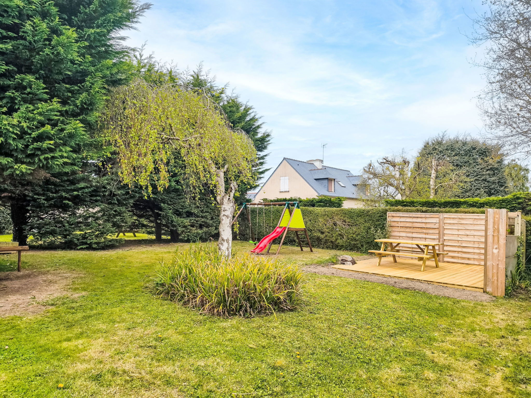 La Richardais, the small locality on the Rance river 1km south of Dinard. The residence " Le Petit Robinson" is a house divided into 8 apartments. It is located on the border of Dinard, along the coastal road that leads to Dinard. Residence "Le Petit Robinson", renovated in 2026. 8 apartments in the residence. In the resort 3 km from the centre of Dinard, 600 m from the sea, 1.4 km from the beach, on a main road. For shared use: property 850 m2 with lawn. Garden furniture, children's playground (slide, swing), parking. Shop 1.5 km, grocery, restaurant 50 m, bus stop "La Bodinais" 210 m, railway station "SCNF Saint-Malo" 9 km, ferry "gare maritime du Naye" 8.2 km, sandy beach "Le Prieuré" 1.4 km, indoor swimming pool 4 km. Sports harbour 2.5 km, sailing school 1.4 km, indoor tennis centre 2 km, minigolf 1 km, riding stable 2.3 km, sports centre 2.5 km, walking paths from the house 900 m. Nearby attractions: Saint-Malo 10 km, Le Grand Aquarium de Saint-Malo 6 km, Cancale 20 km, Dinan 23 km, Cap Fréhel et Fort la Latte 37 km, Le Mont Saint-Michel 60 km. Please note: no lift. The keys‘ handover takes place by the agency in Dinard, 3 km. Main road. Additional accommodations can be booked. Neighbourhood highly sensitive to noise. Quietness and good behaviour expected. Prieuré beach at 1400m, possibility of swimming only at high tide. Coastal paths within walking distance 500 meters. Busy and noisy road.