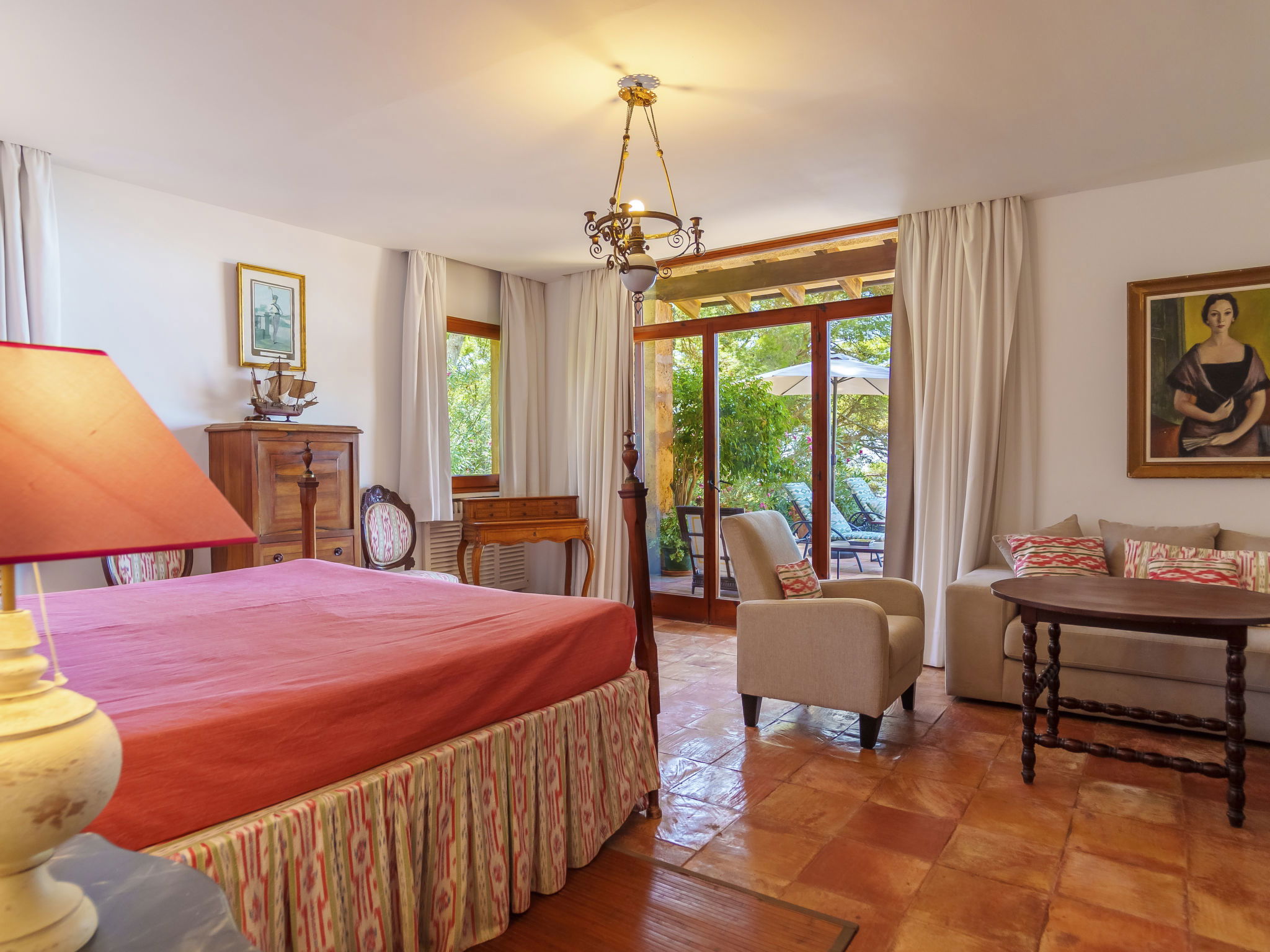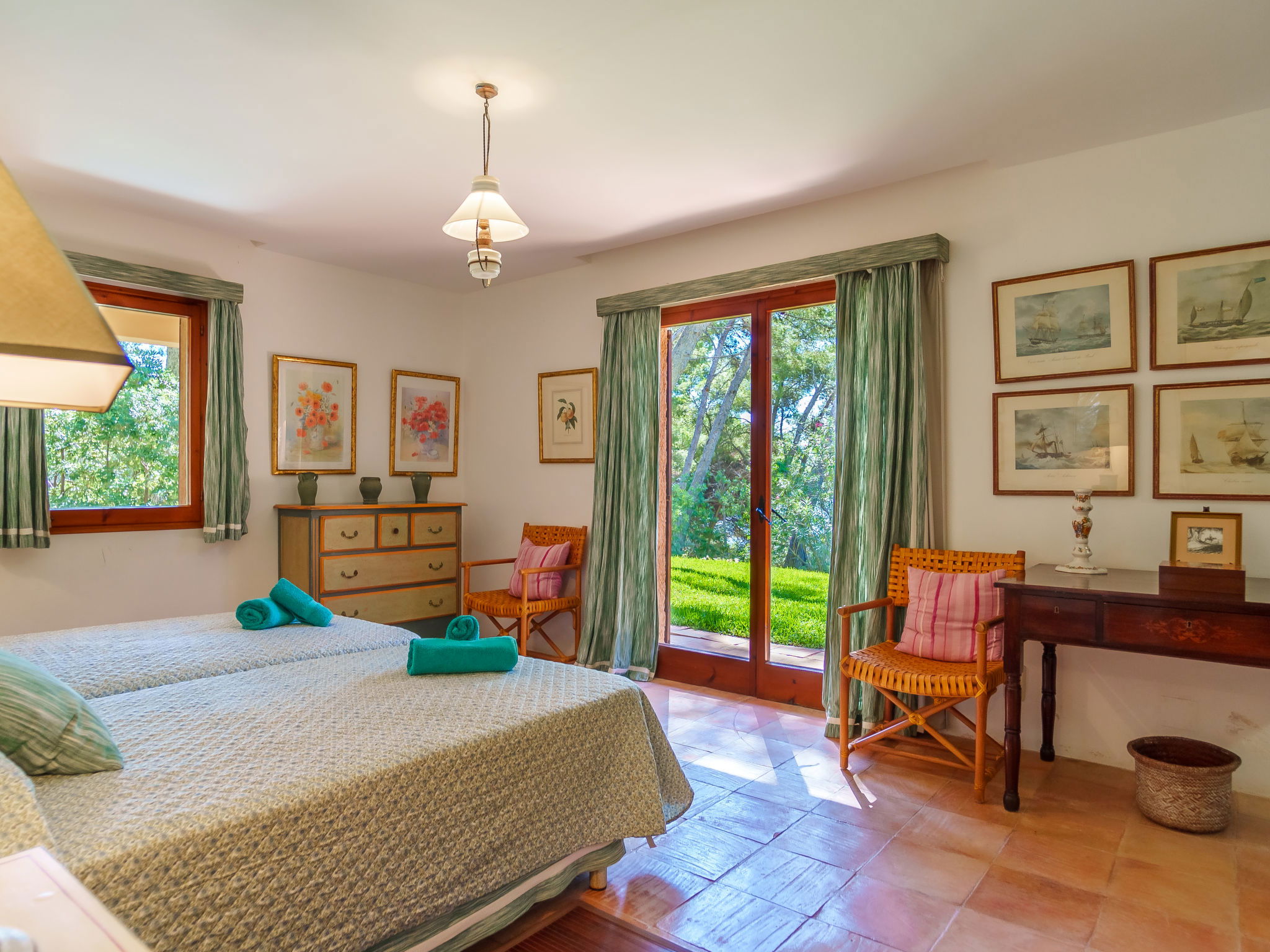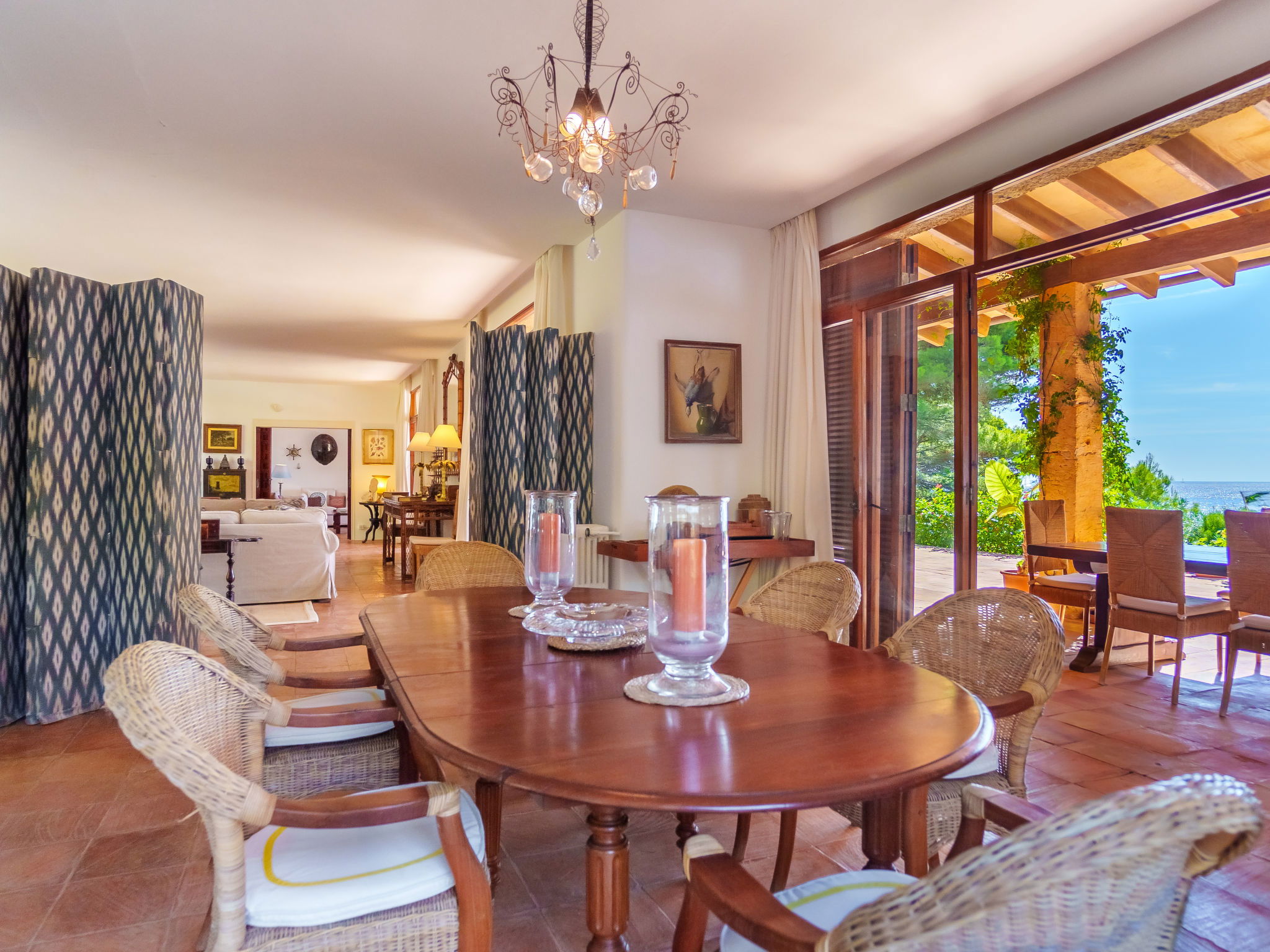 "Finca L'Embat (DLP100)", 7-room villa 360 m2. Stylish furnishings: living/dining room with open-hearth fireplace, dining table, satellite TV and DVD. Exit to the terrace. Living room with electric heater. Exit to the terrace. 1 room with 1 french bed (180 cm), bath/WC, double hand-basin and electric heater. Exit to the terrace. 1 room with 2 beds, bath/WC and double hand-basin. Exit to the terrace. 1 room with 2 beds and shower/WC. Exit to the terrace. 2 rooms, each room with 2 beds, shower/WC, air conditioning and forced-air heating. Exit to the terrace. Kitchen (oven, dishwasher, 3 ceramic glass hob hotplates, toaster, microwave, freezer, electric coffee machine). Bath/shower/WC. Heating not available in all rooms. Terrace 60 m2, terrace 200 m2 partly roofed. Terrace furniture, deck chairs. Marvellous view of the sea. Facilities: washing machine, iron, children's high chair, baby cot for up to 2 year olds. Internet (WiFi, free). Please note: non-smoking house. No internal connecting door between the separated properties. When there are less than the maximum number of guests staying at the property, not all of the bedrooms will be available for use. ETV10667