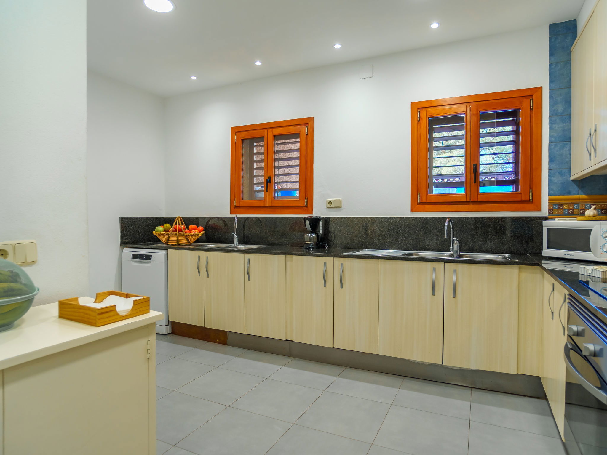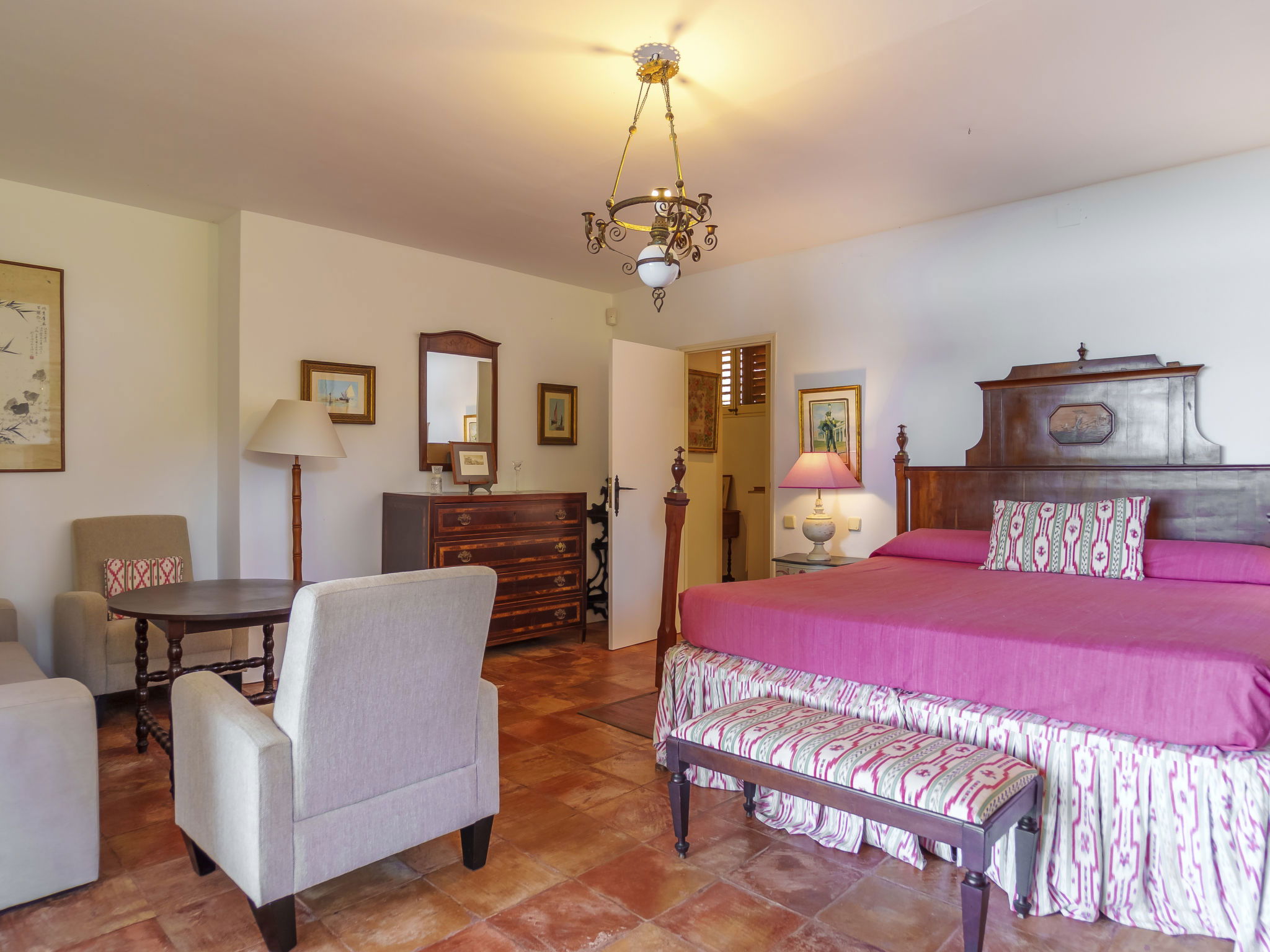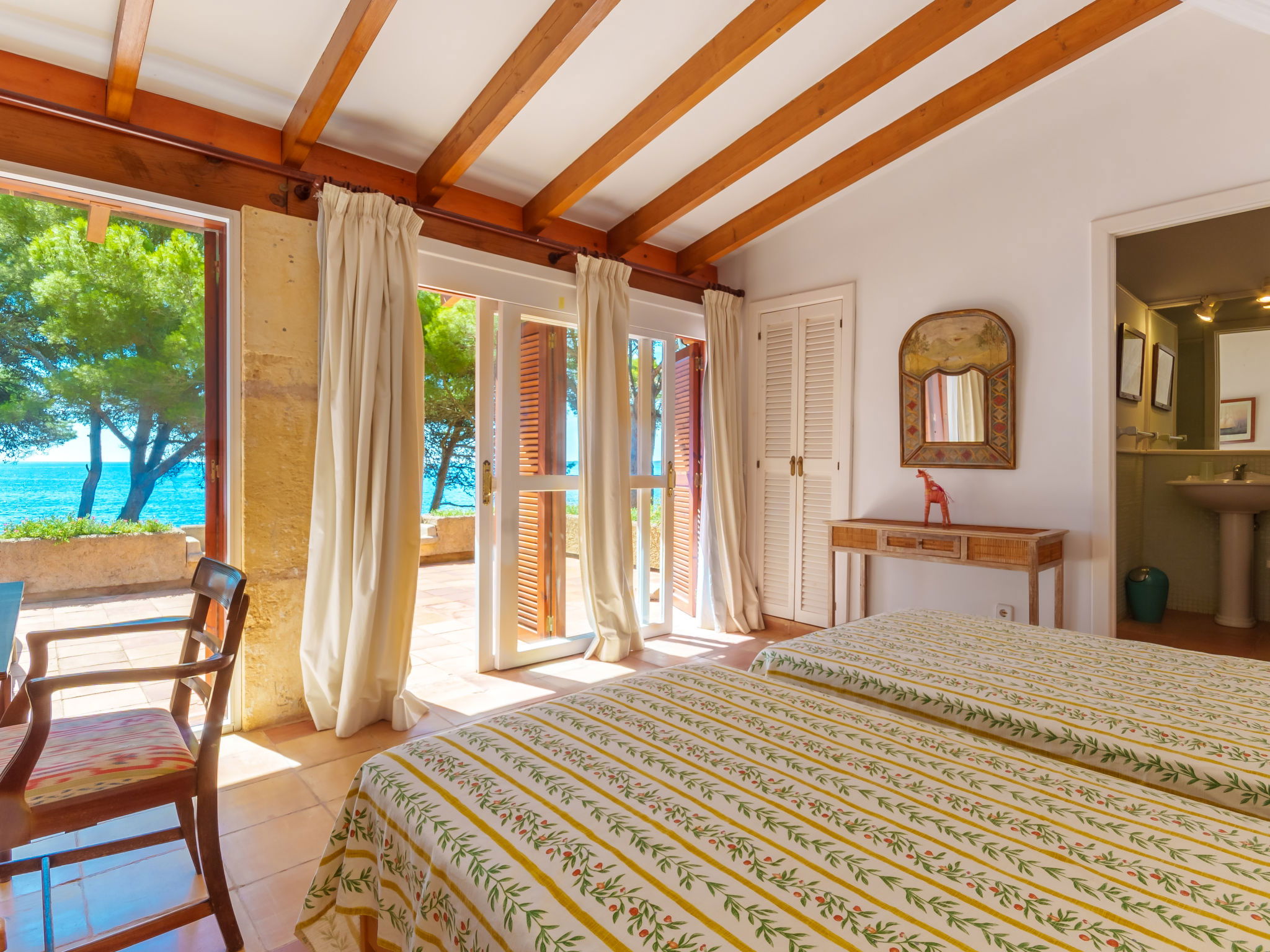 "Finca L'Embat (DLP100)", 7-room villa 360 m2. Stylish furnishings: living/dining room with open-hearth fireplace, dining table, satellite TV and DVD. Exit to the terrace. Living room with electric heater. Exit to the terrace. 1 room with 1 french bed (180 cm), bath/WC, double hand-basin and electric heater. Exit to the terrace. 1 room with 2 beds, bath/WC and double hand-basin. Exit to the terrace. 1 room with 2 beds and shower/WC. Exit to the terrace. 2 rooms, each room with 2 beds, shower/WC, air conditioning and forced-air heating. Exit to the terrace. Kitchen (oven, dishwasher, 3 ceramic glass hob hotplates, toaster, microwave, freezer, electric coffee machine). Bath/shower/WC. Heating not available in all rooms. Terrace 60 m2, terrace 200 m2 partly roofed. Terrace furniture, deck chairs. Marvellous view of the sea. Facilities: washing machine, iron, children's high chair, baby cot for up to 2 year olds. Internet (WiFi, free). Please note: non-smoking house. No internal connecting door between the separated properties. When there are less than the maximum number of guests staying at the property, not all of the bedrooms will be available for use. ETV10667