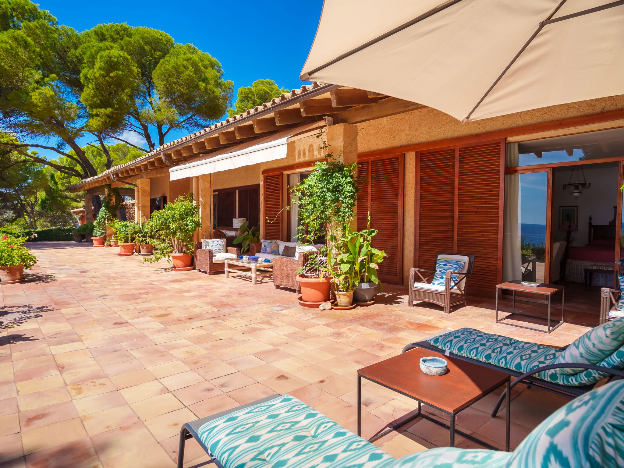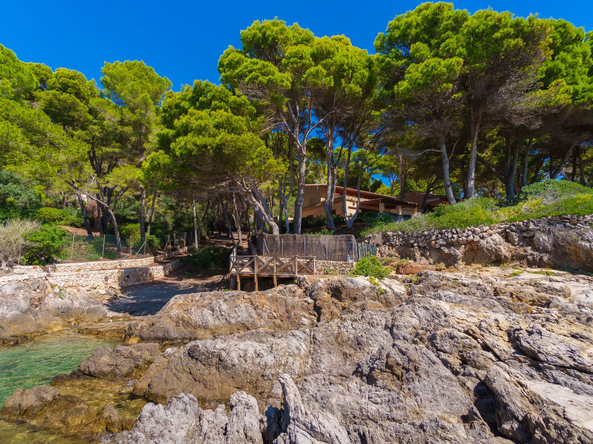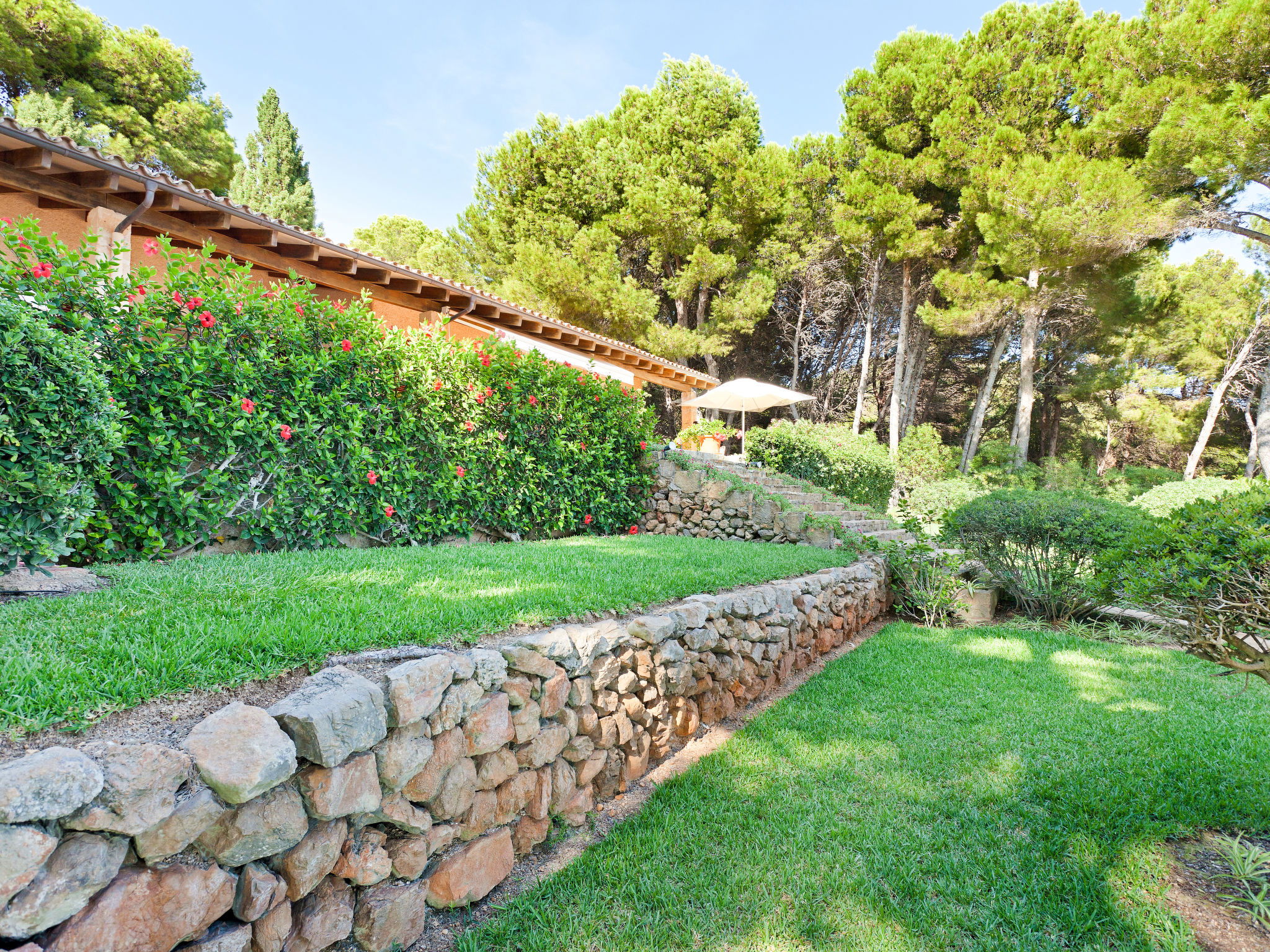 Costa de los Pinos 7 km from Son Servera: Large villa "Finca L'Embat (DLP100)". Property composed of main house and outbuilding 1.2 km from the centre of Costa de los Pinos, 6.5 km from the centre of Cala Millor, 23 km from the centre of Manacor, on a slope, residential area (villas), at the seaside, direct access to the beach. Private: property 6'500 m2, well-kept terraced garden with lawn and trees, roofed, parking on the premises. Shop 1.2 km, restaurant 1.2 km, sandy beach 2 km, rocky beach 50 m. Golf course 2 km. Please note: car recommended.