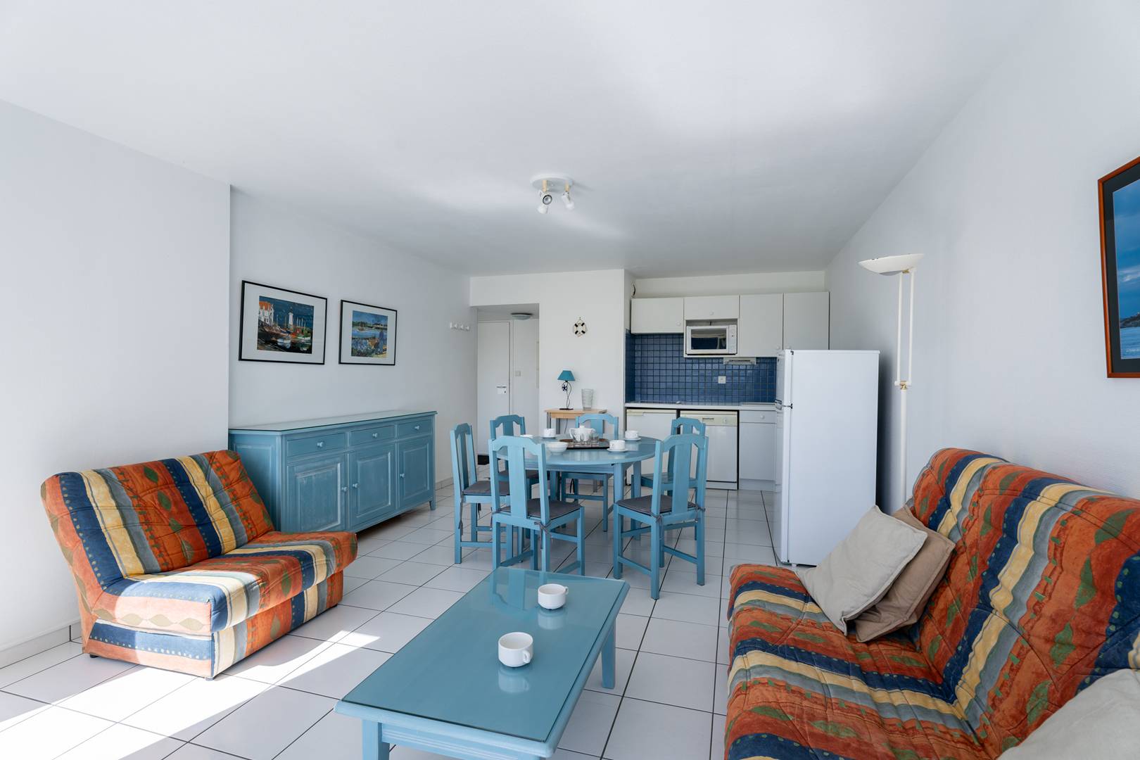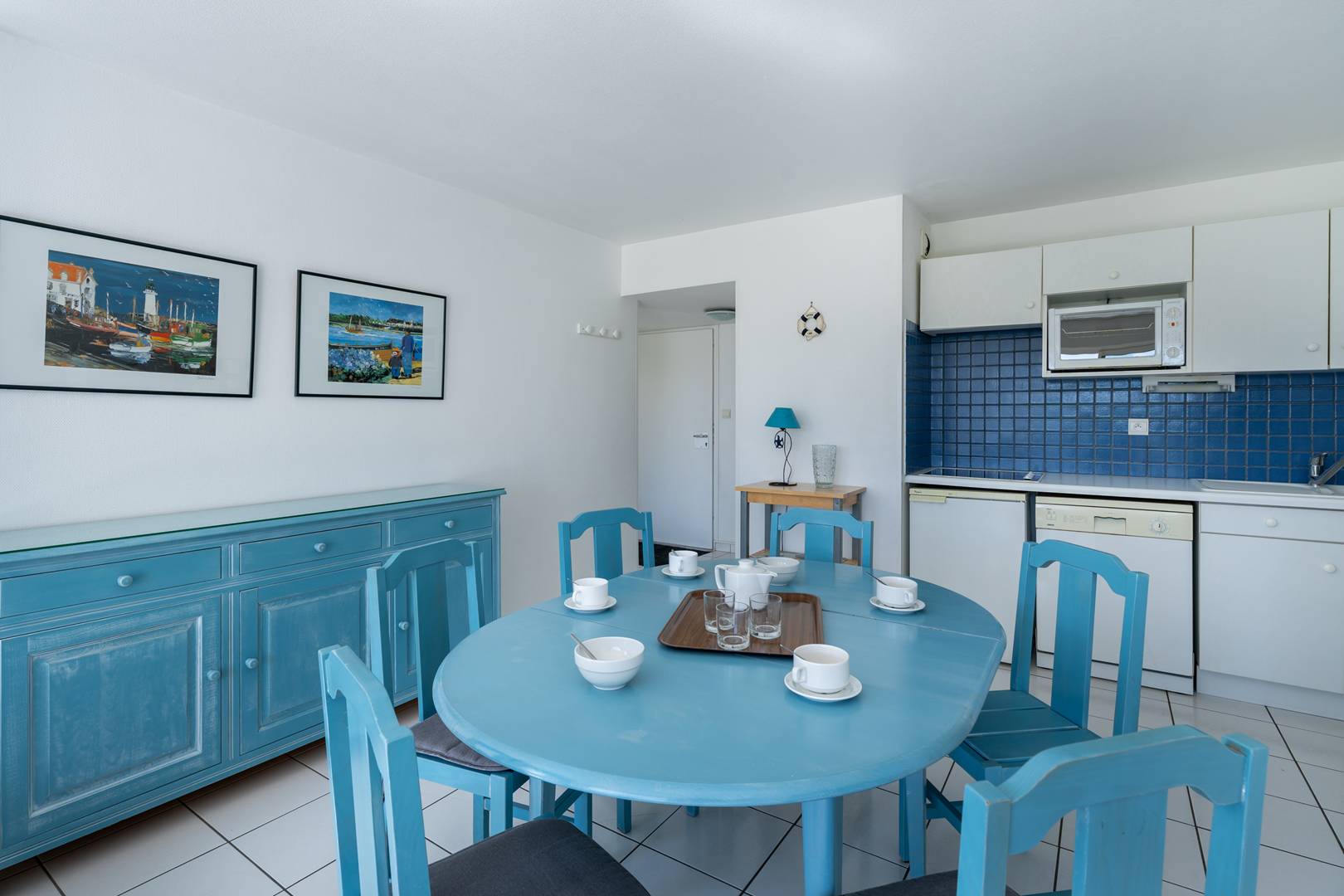 - Equipped kitchen area (4-ring ceramic hob, mini-oven, refrigerator, dishwasher, microwave)