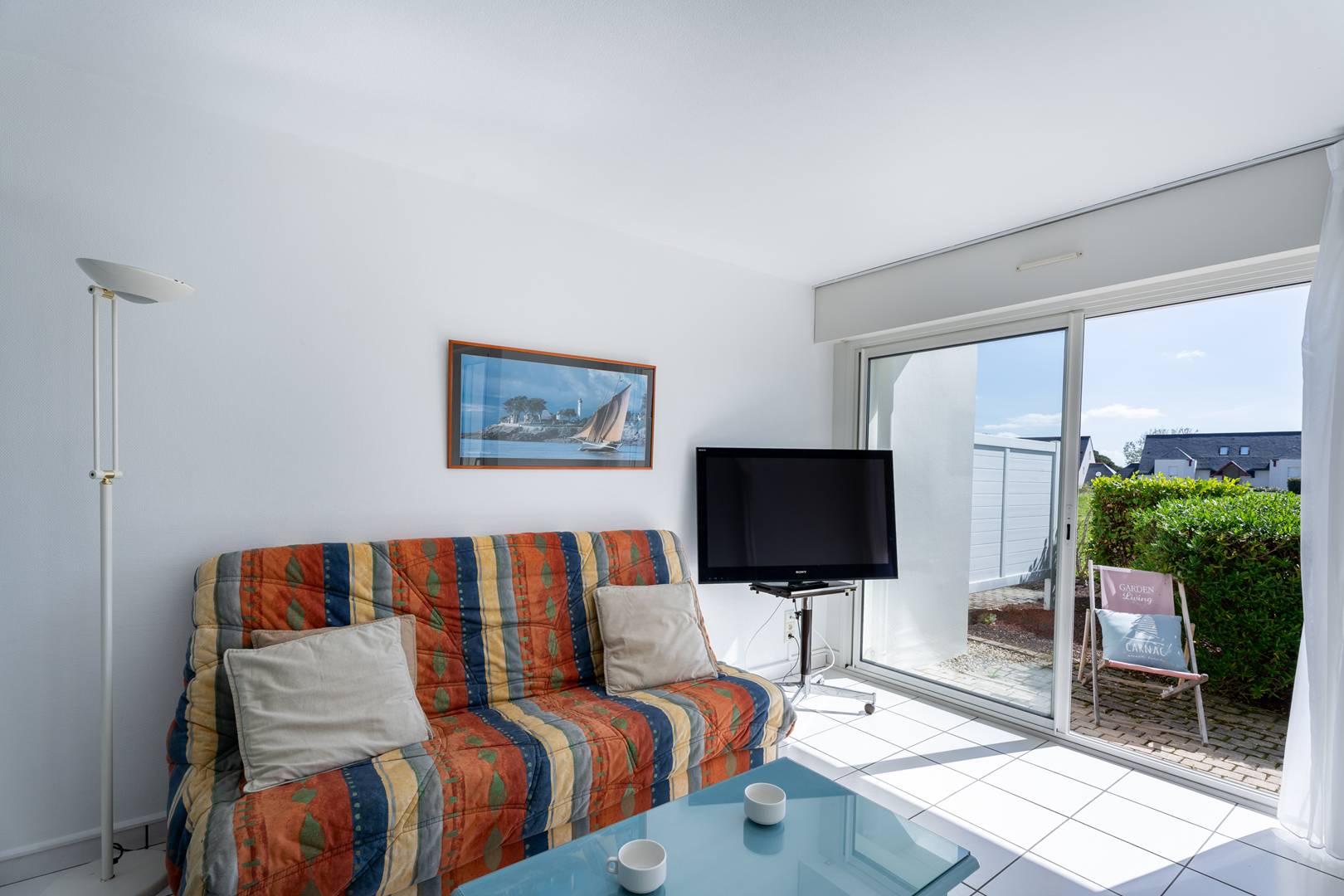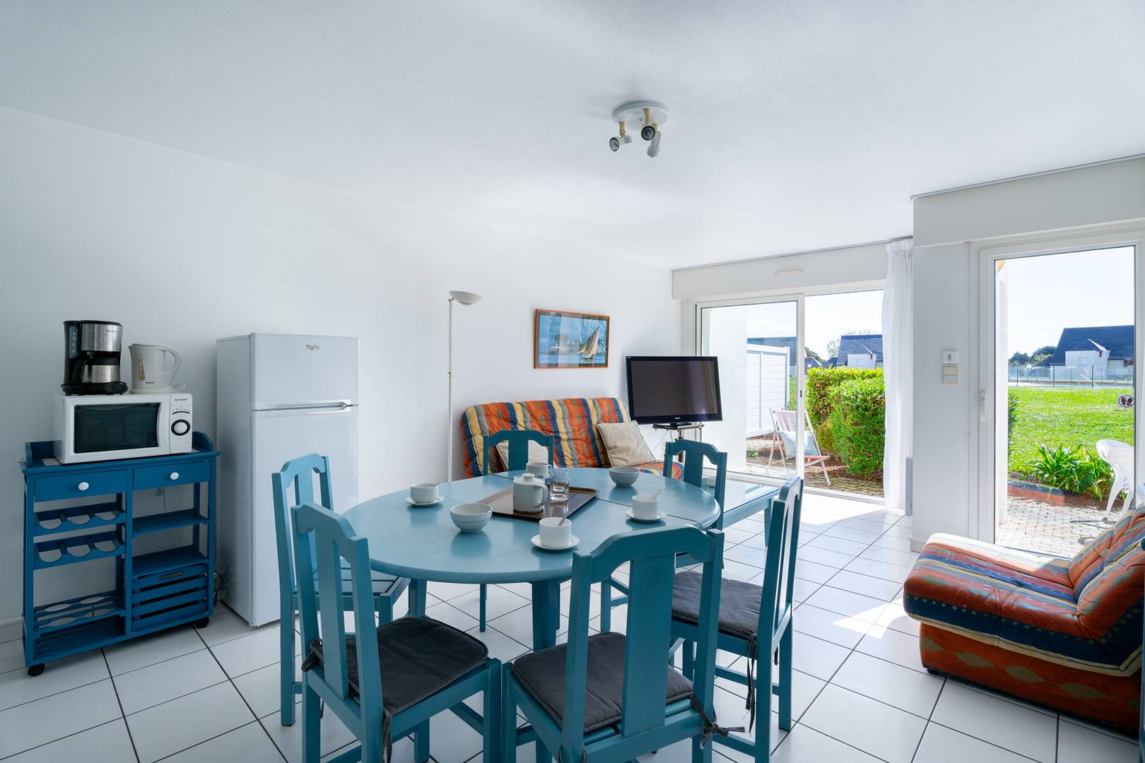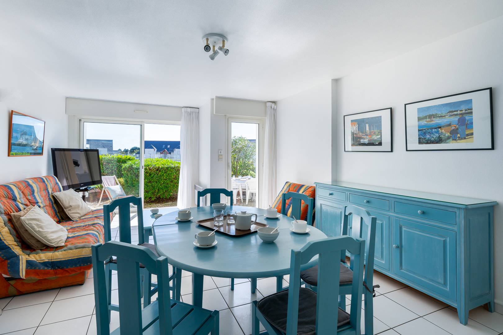 - Beautiful living room with dining area (table and chairs) and lounge area (TV, double sofa bed : cover) opening onto the South-East facing terrace (garden furniture) and with a view of the pool and garden of the residence