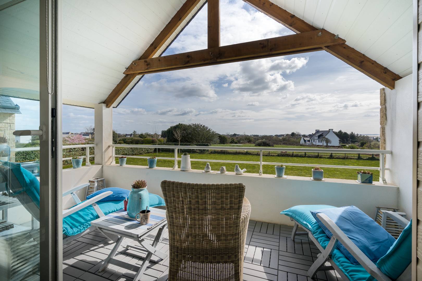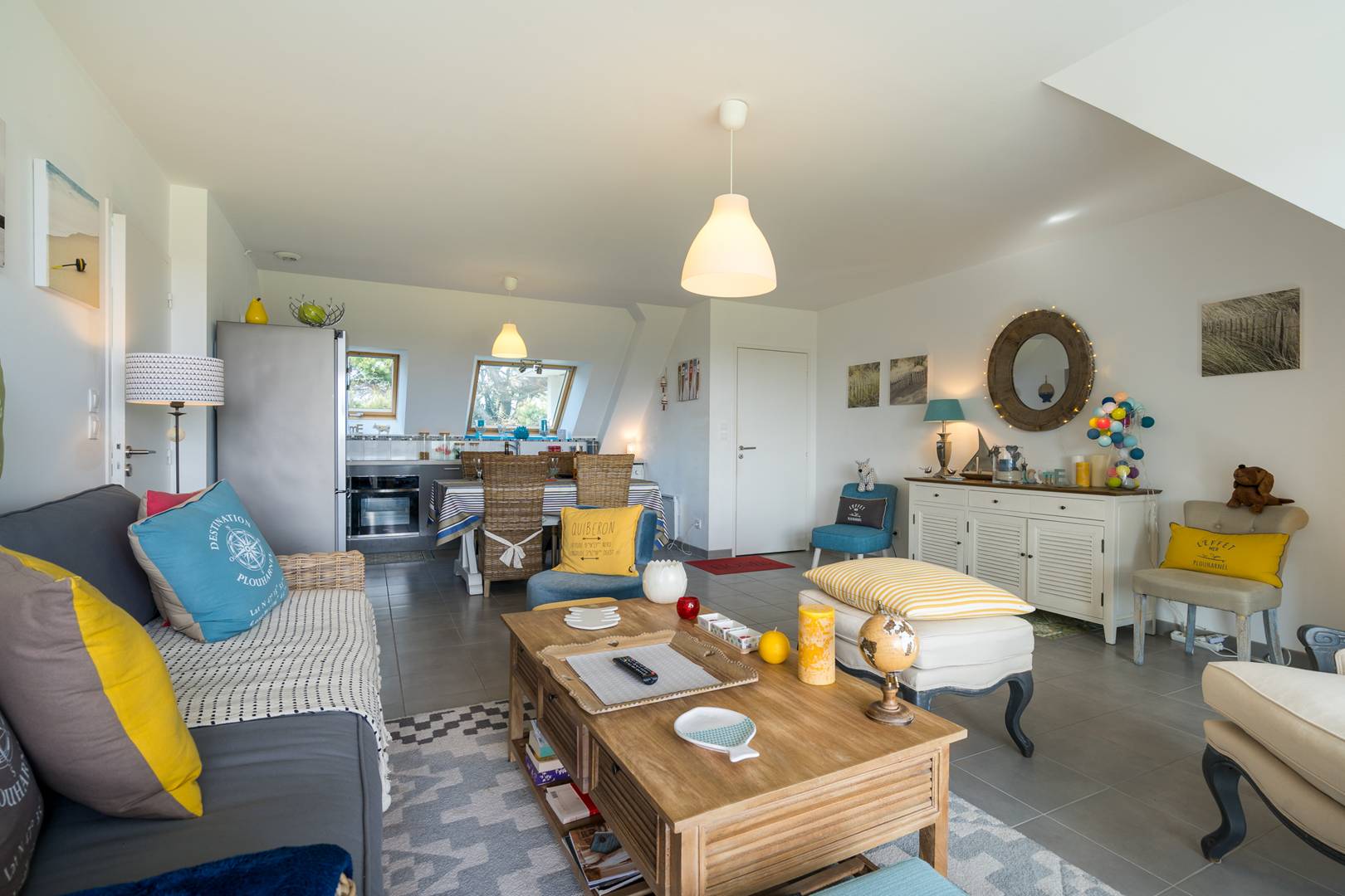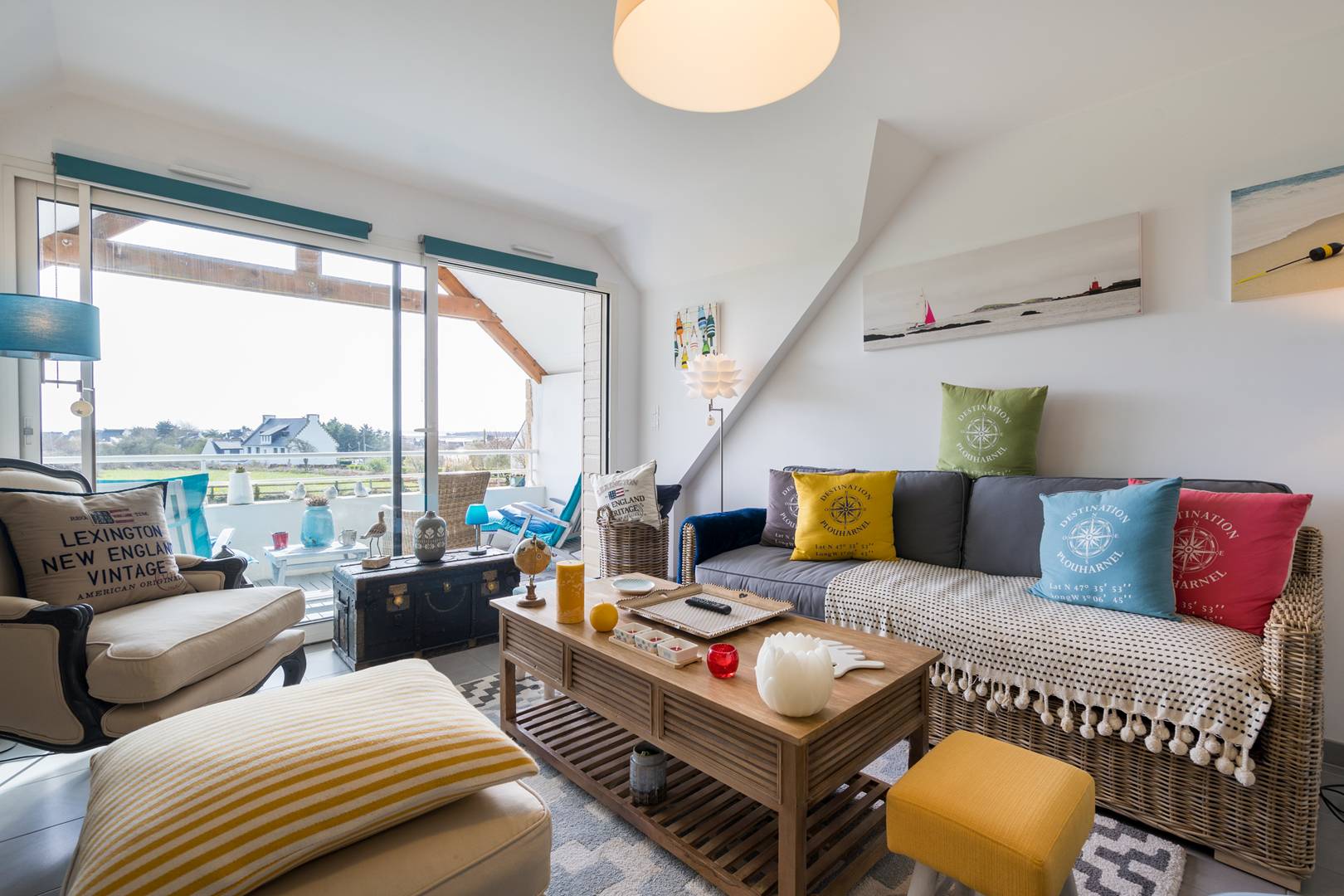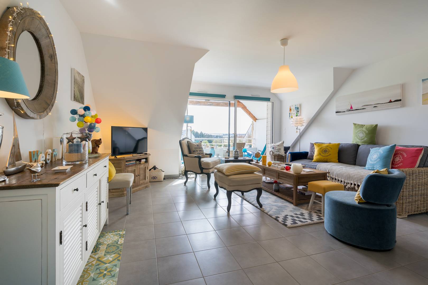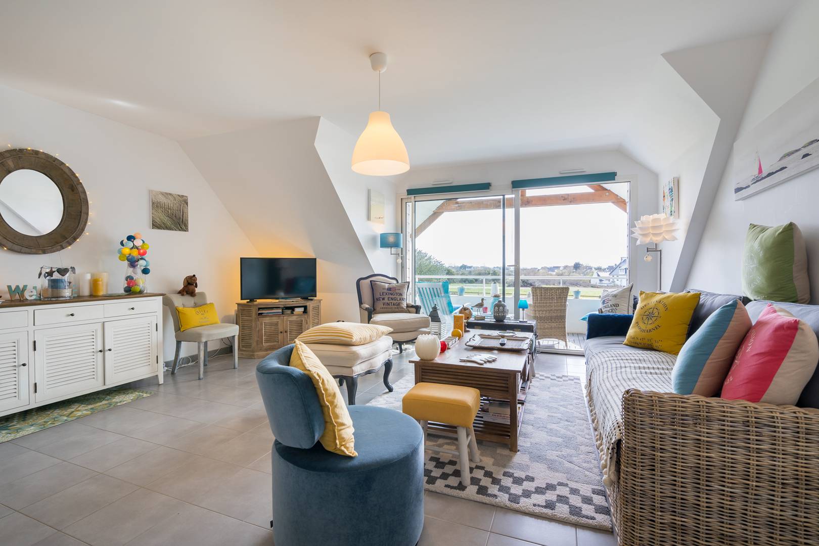 - Living room with lounge area (sofa, armchairs, TV) opening onto the South facing loggia with a beautiful view of the Bay of Plouharnel