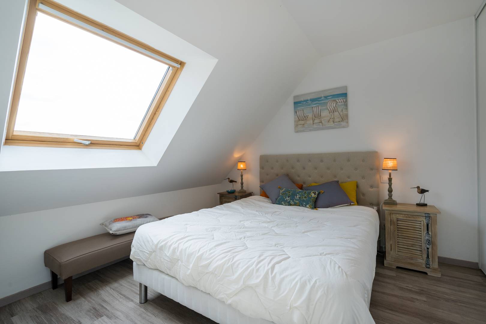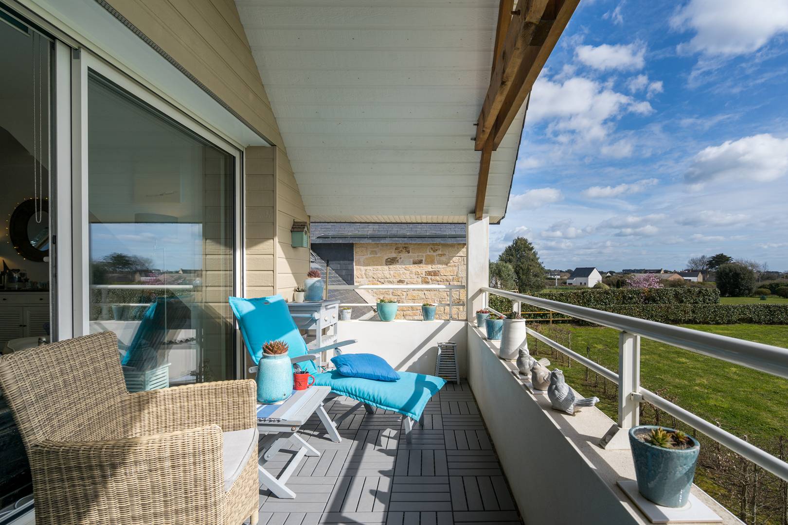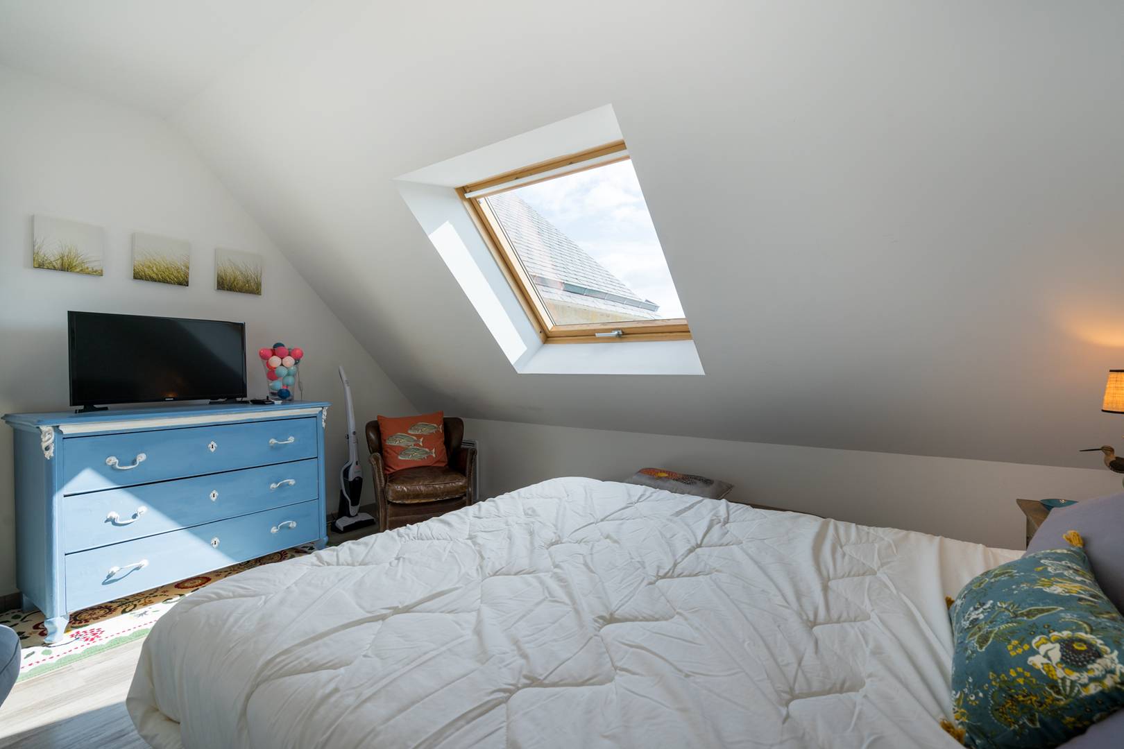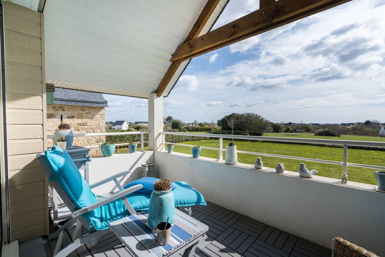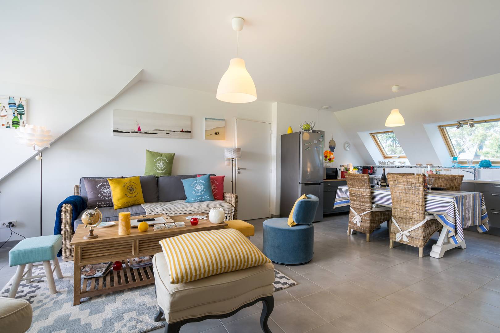- Living room with lounge area (sofa, armchairs, TV) opening onto the South facing loggia with a beautiful view of the Bay of Plouharnel