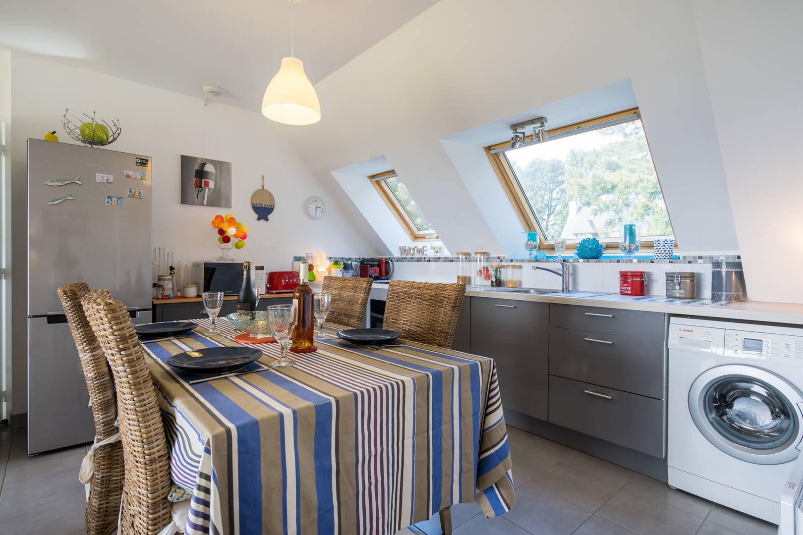 - Open kitchen with dining area (table + chairs) and equipment (4-ring ceramic hob, fridge with freezer, oven, microwave, dishwasher, washing machine, Nespresso coffee machine)
