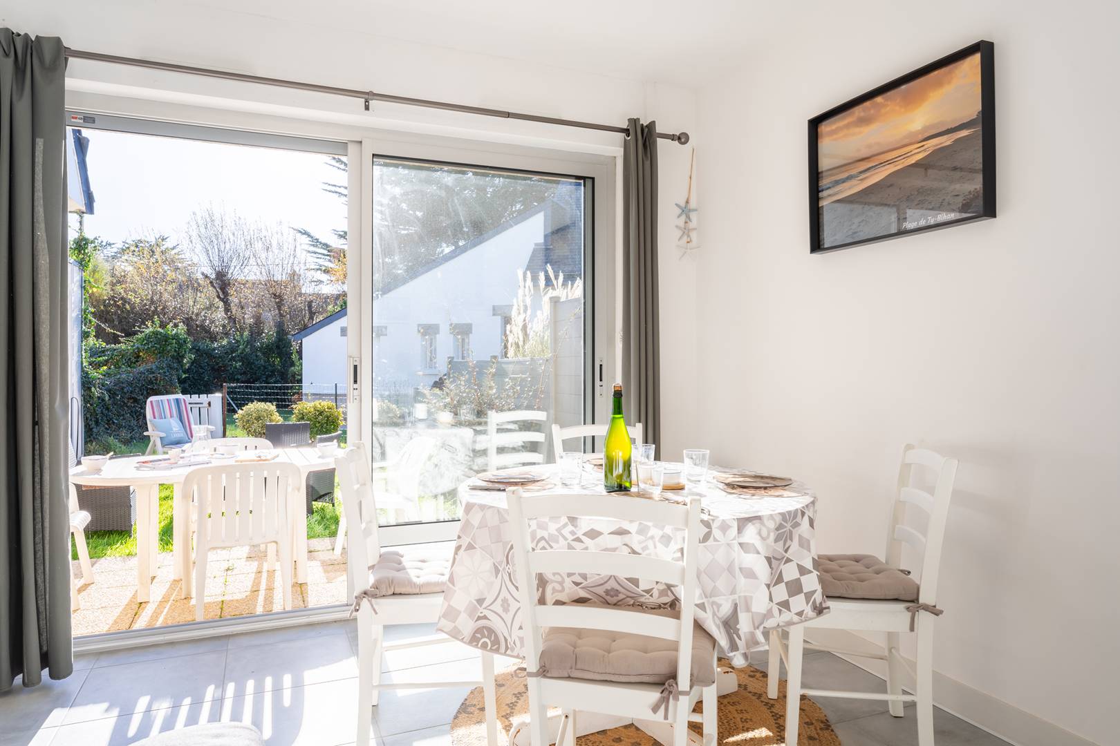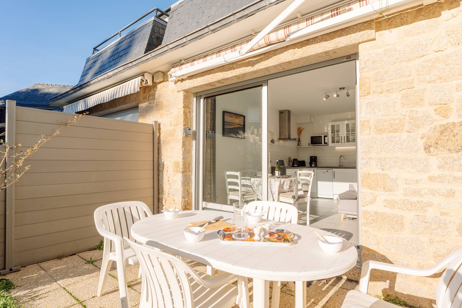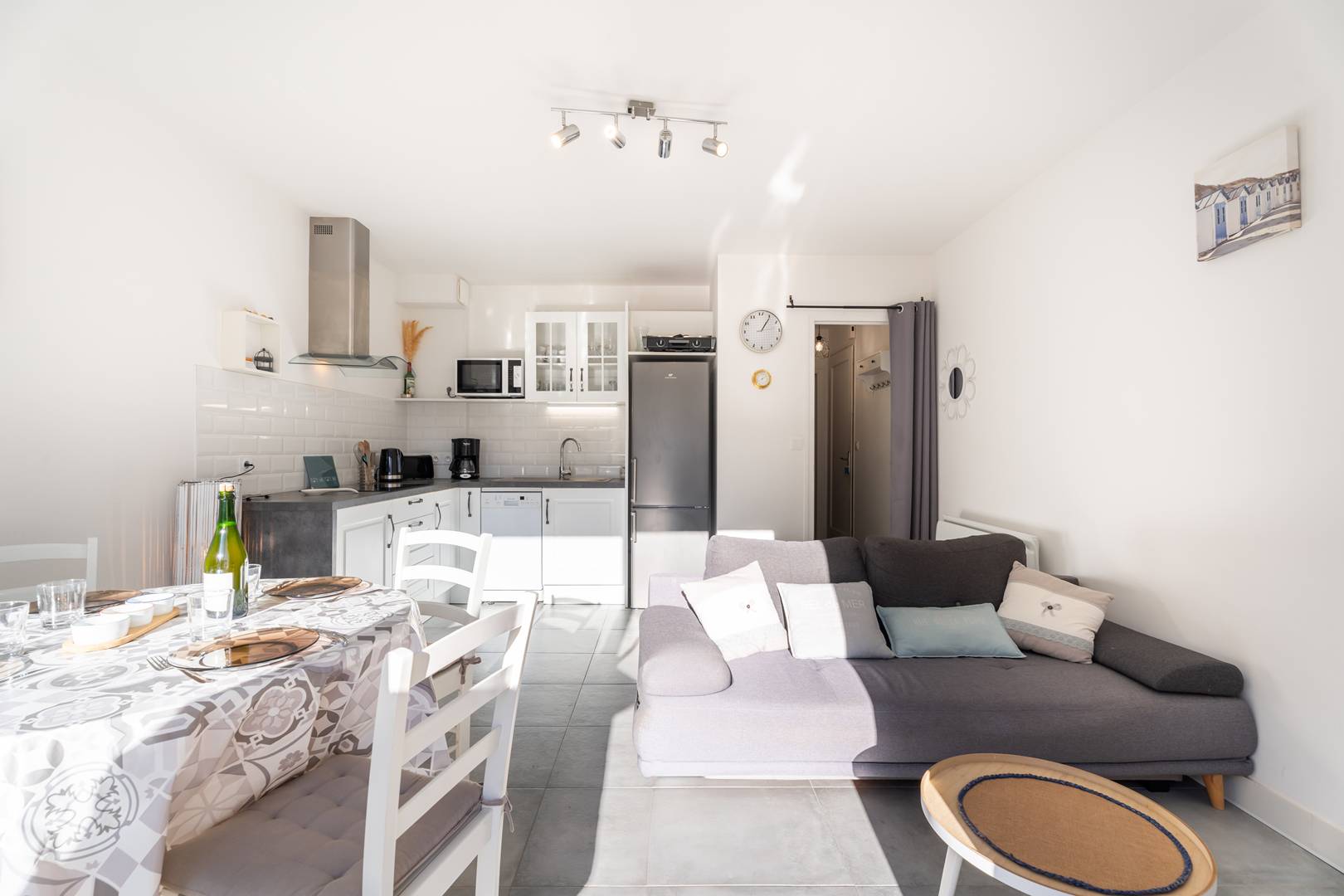 - Living room with dining area (table and chairs) and lounge area (TV, sofa bed: 2-person sleeping, 140 cm, duvet), opening onto the south-facing terrace extended by a small enclosed private garden (garden furniture)