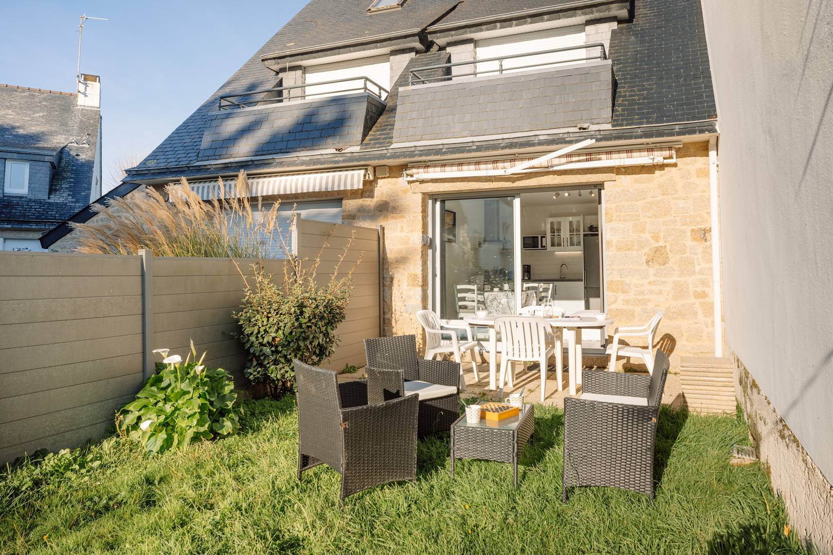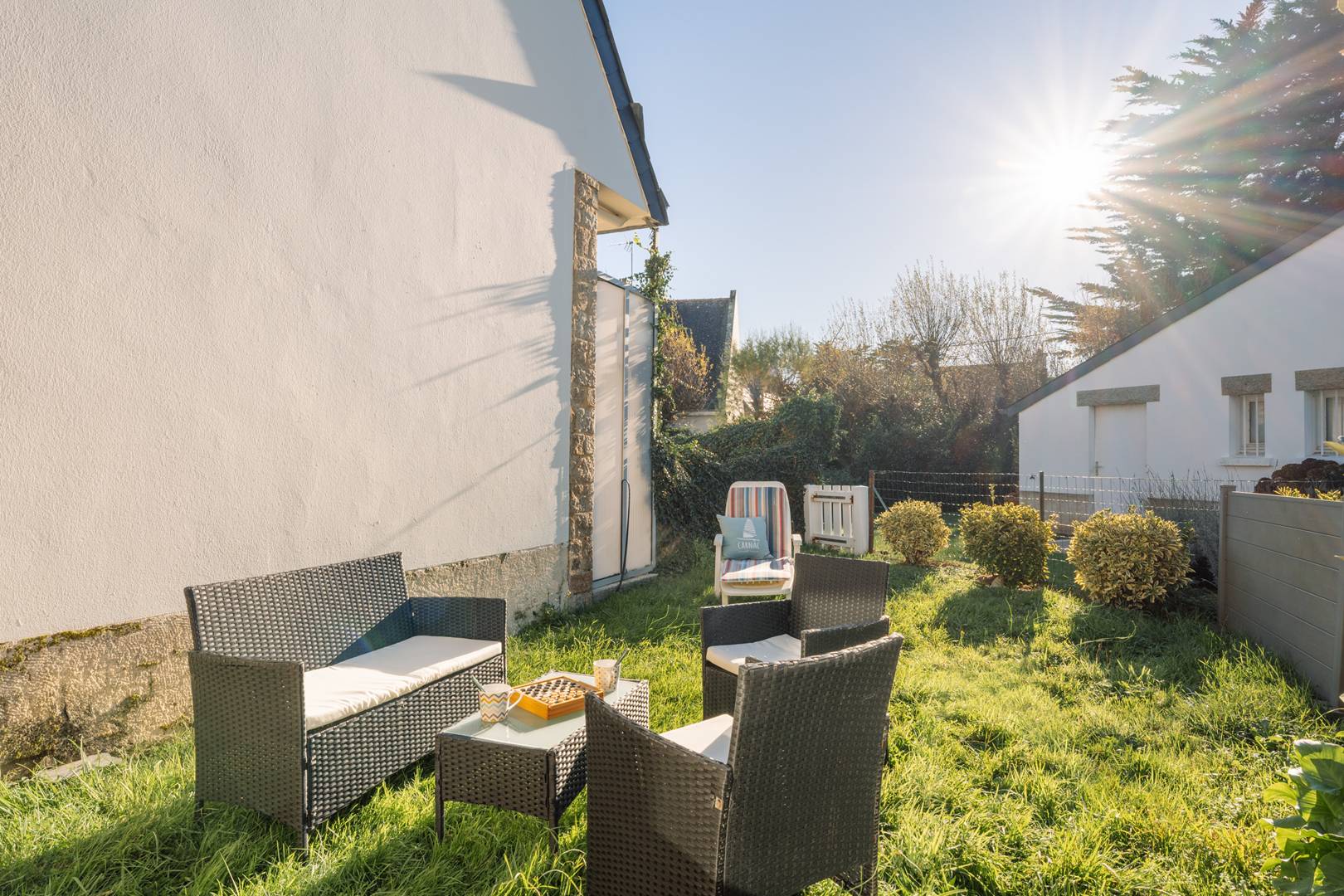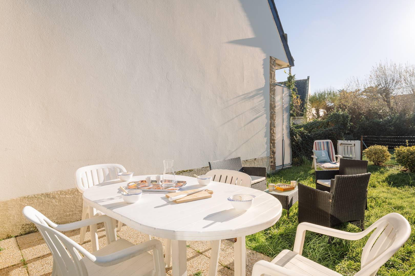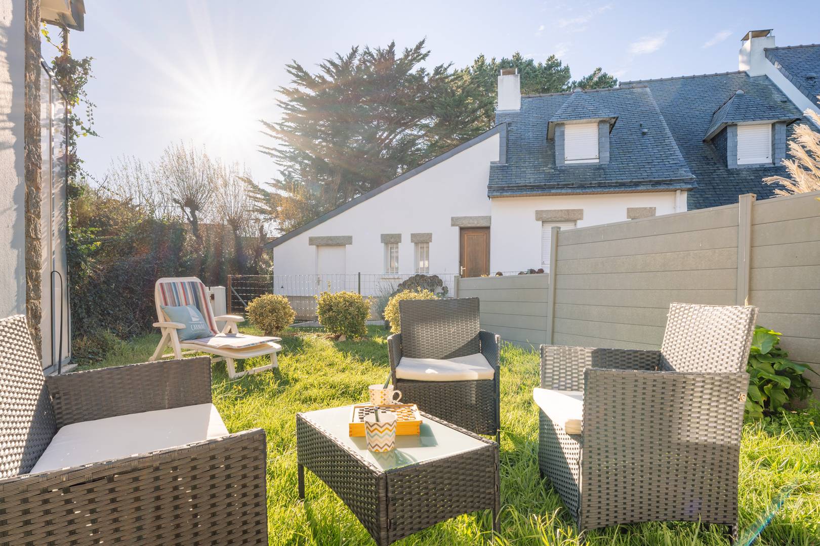 - Living room with dining area (table and chairs) and lounge area (TV, sofa bed: 2-person sleeping, 140 cm, duvet), opening onto the south-facing terrace extended by a small enclosed private garden (garden furniture)