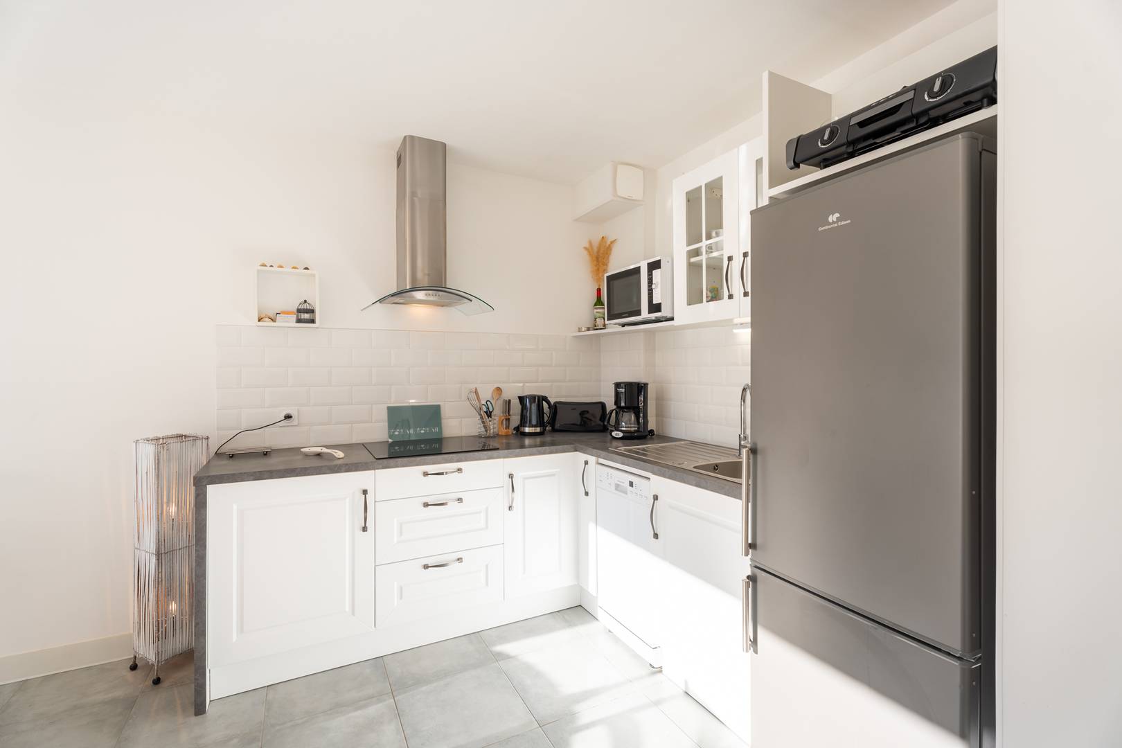 - Open-plan and equipped kitchen (fridge/freezer, dishwasher, 4-ring induction hob, microwave)