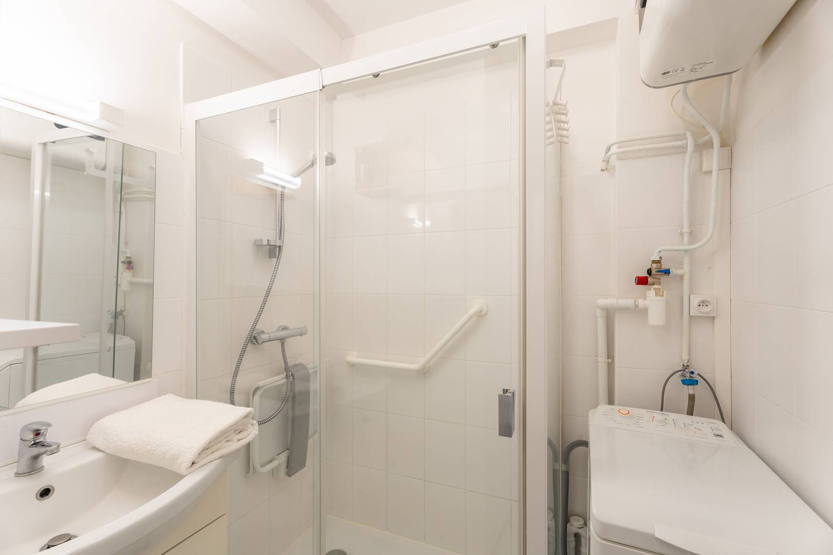 - Shower room with large walk-in shower (shower seat) and washing machine