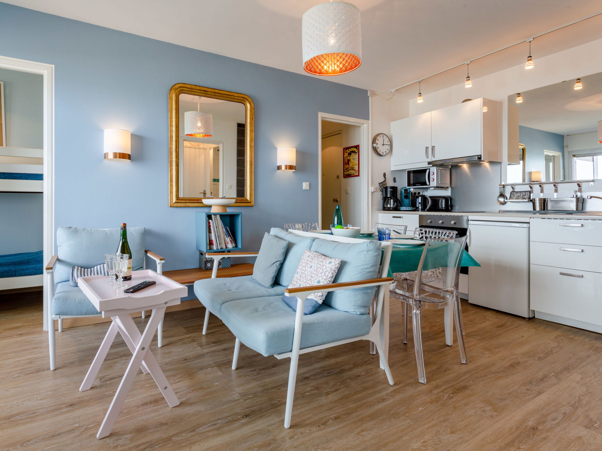 Residence "La Bizontine", 5 storeys. In the resort 2 km from the centre of Cabourg, 50 m from the sea, 50 m from the beach, direct access to the beach. In the complex: central heating system. Public parking on the road. Shop 2 km, supermarket 800 m, restaurant 2 km, bus stop "Thalasso" 400 m, thermal baths "Thalazur" 1 km. Golf course (18 hole) 1.1 km. Please note: lift to 4th floor. Additional accommodations can be booked.