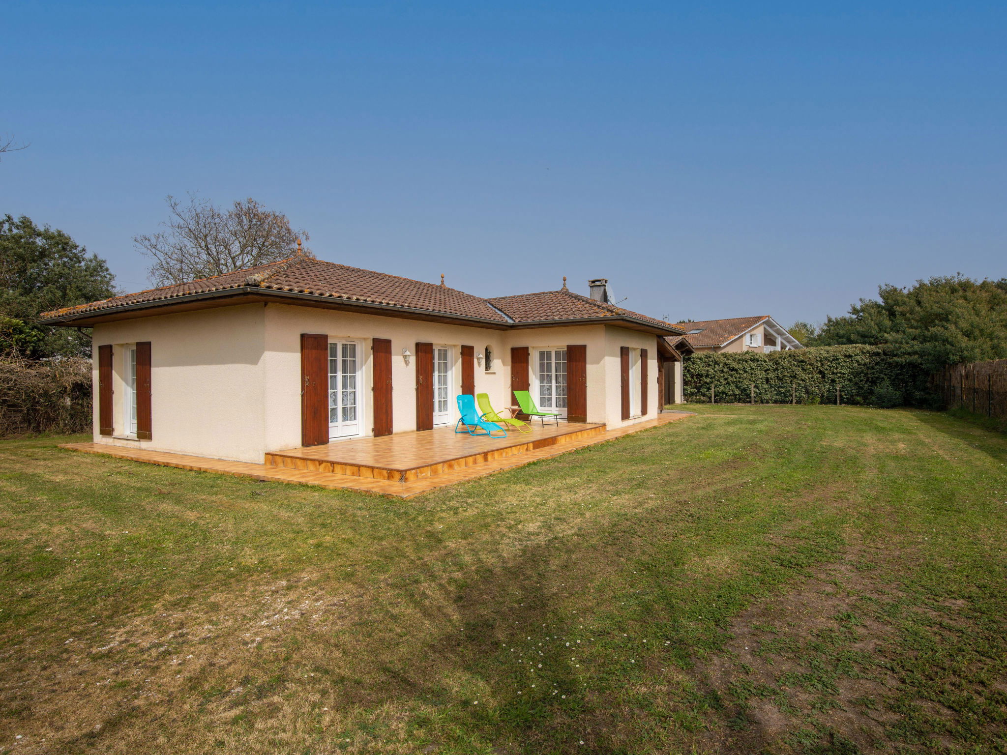 Gujan Mestras 10 km from Arcachon: Single-family house "L'Albizia". 2.3 km from the sea, 2.3 km from the beach. Private: property 1'000 m2 (fenced), parking on the premises. Supermarket 2.6 km, restaurant, bakery 450 m, bus stop "La Prairie" 600 m, railway station "Gujan/La Hume" 2.3 km, sandy beach "la Hume" 2.3 km. Golf course (18 hole) 7.1 km, cycle lane 300 m. Nearby attractions: Eratopia 3.6 km, Arca Jet Marine 7.3 km, Dune du Pyla 12.1 km, Navette maritime pour le Cap Ferret 9 km, Casino 8 km, Réserve Ornithologique du Teich 7.1 km. Well-known lakes can easily be reached: Lac de la Magdeleine 5.1 km, Lac de Cazaux 16.7 km.