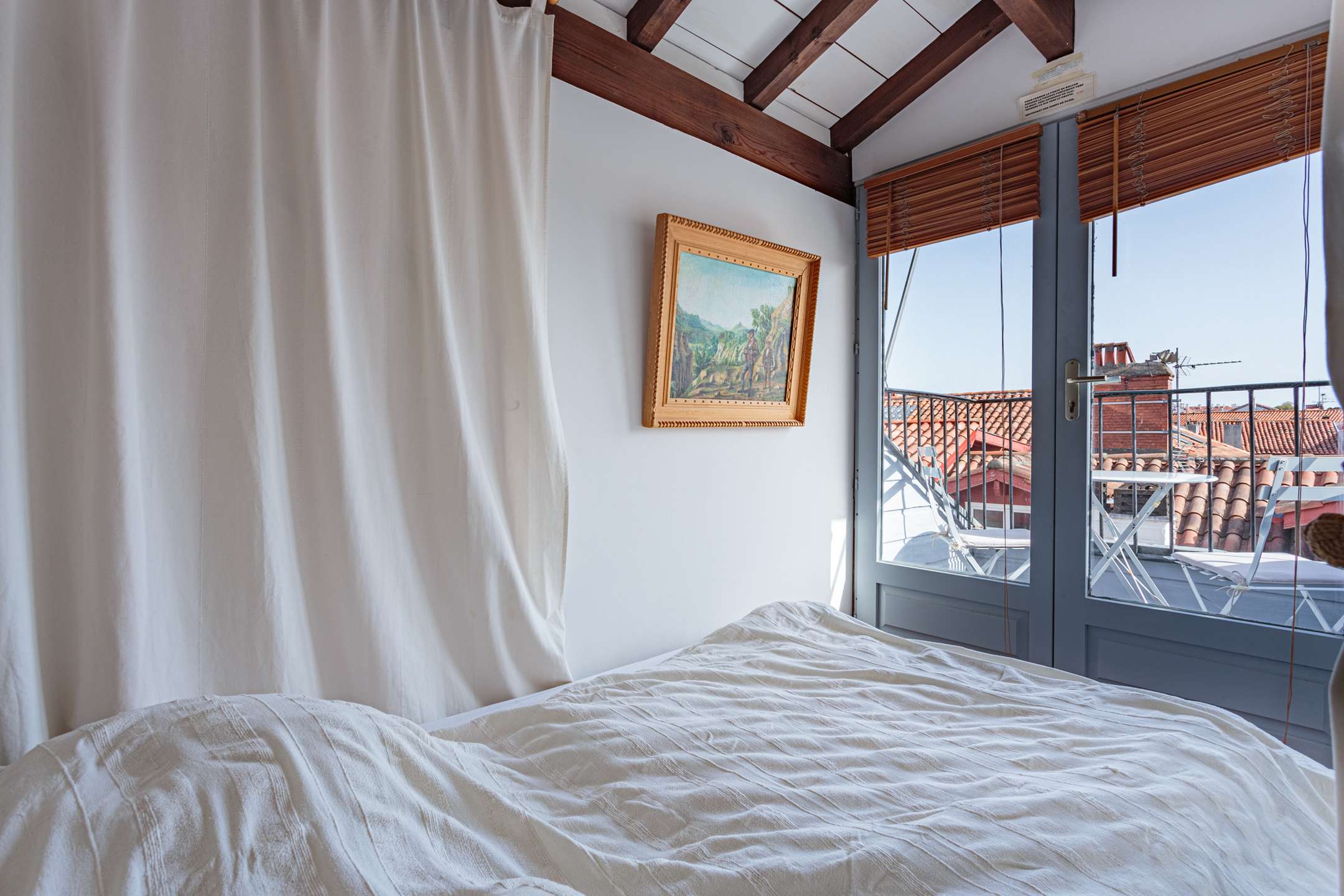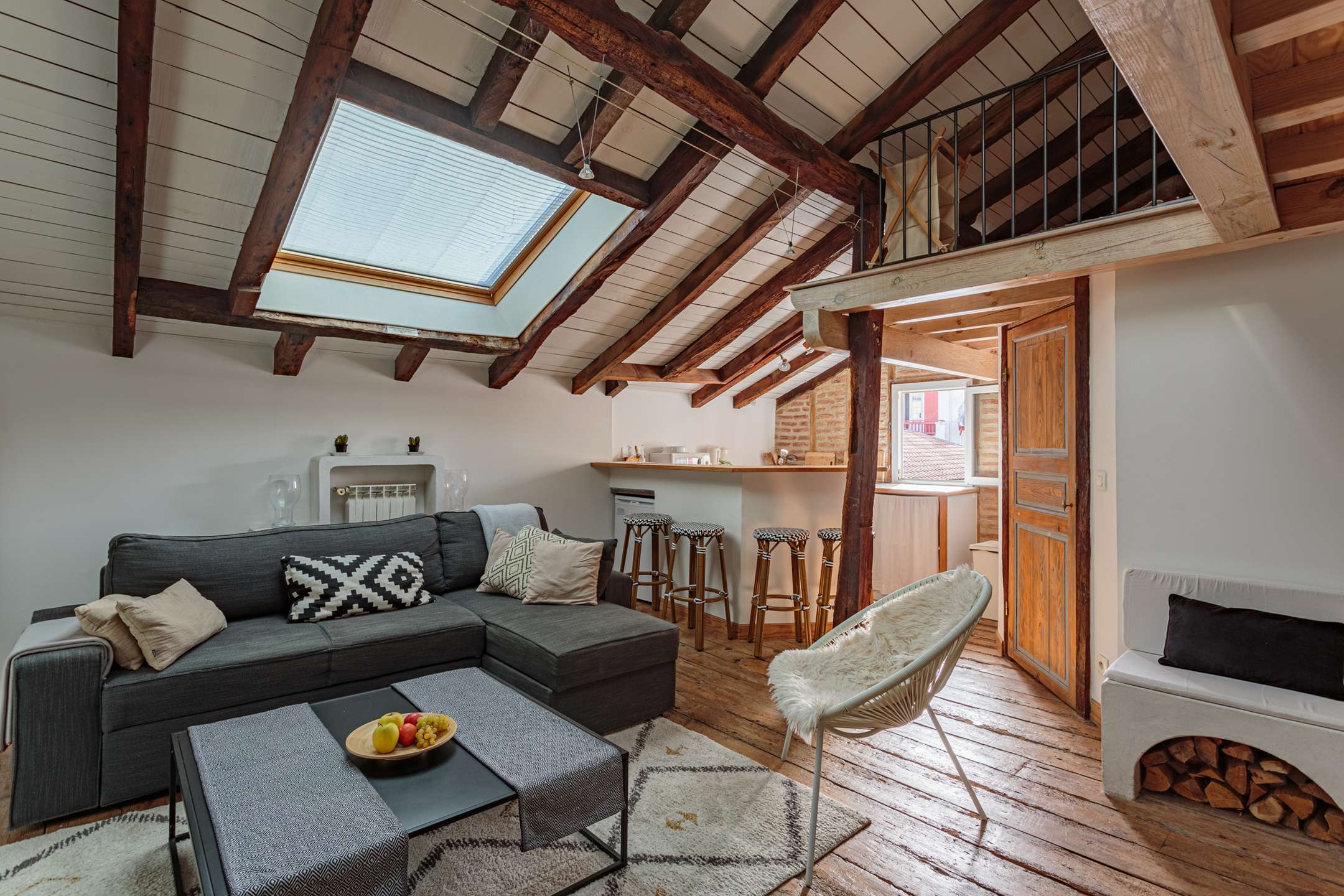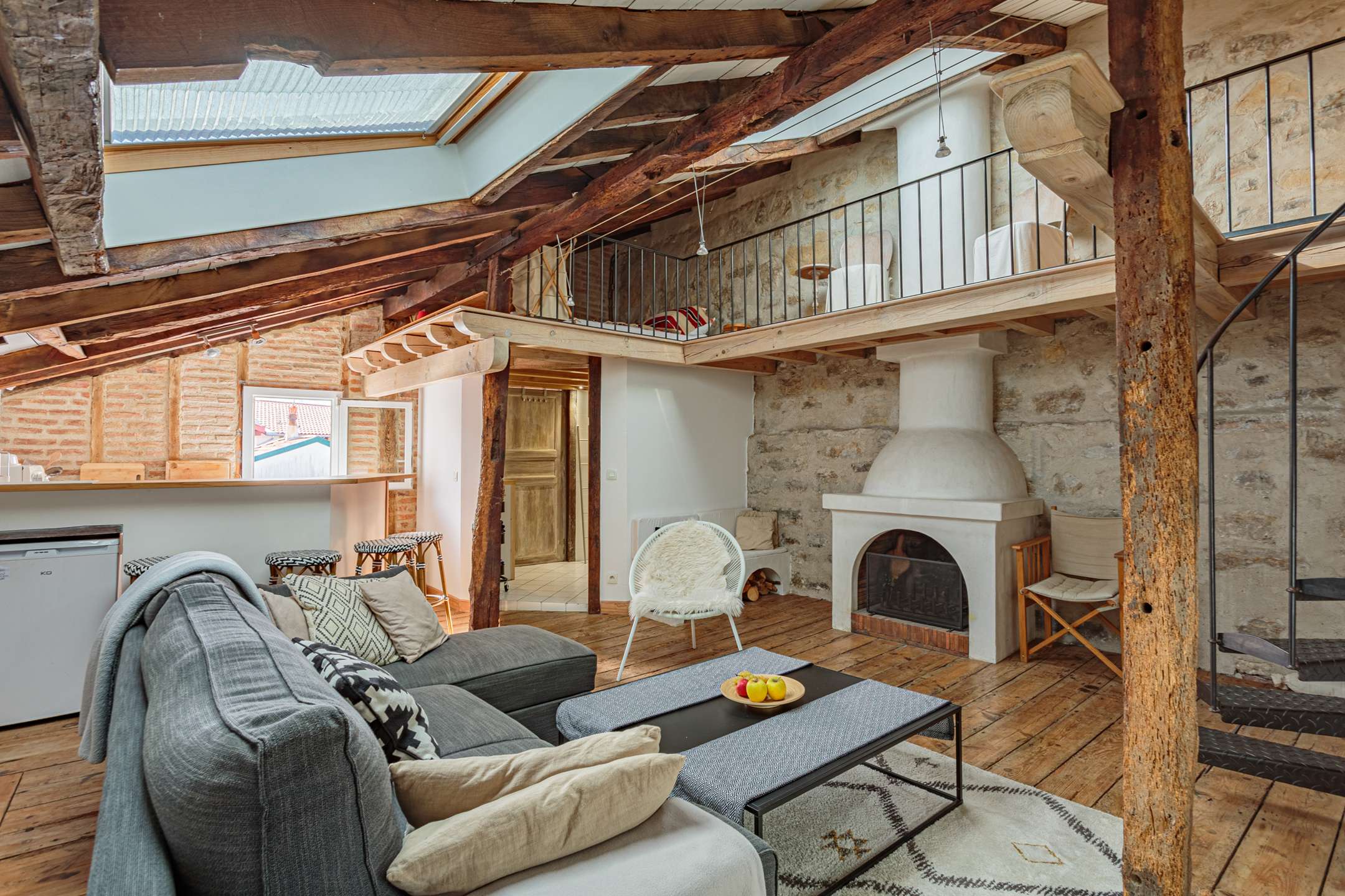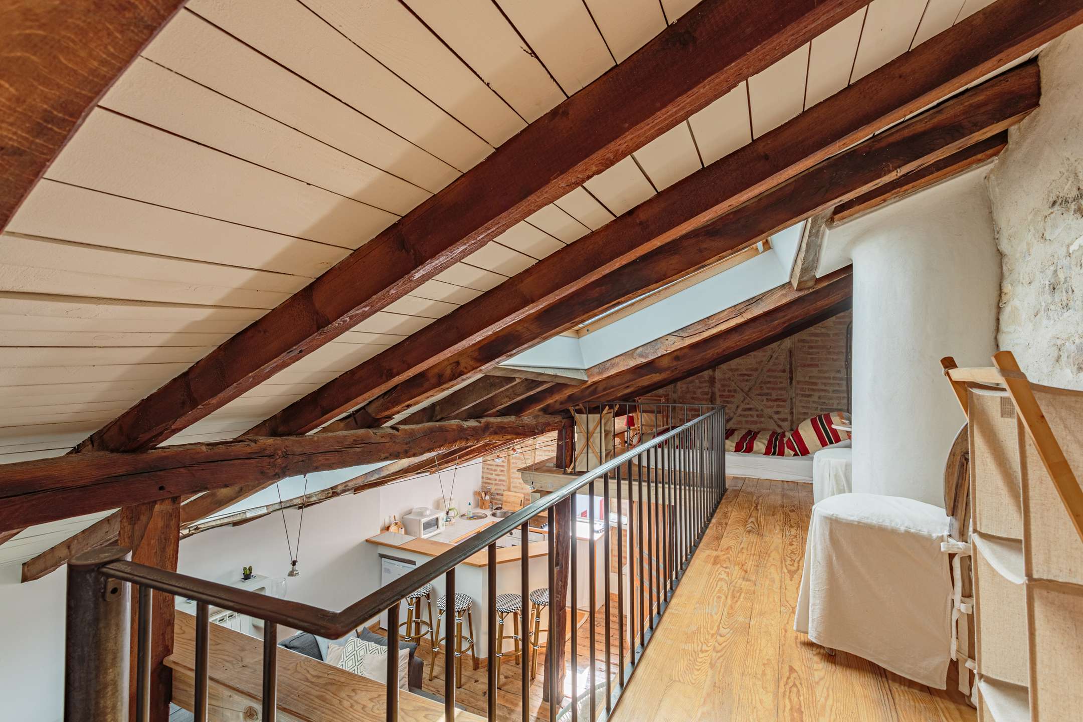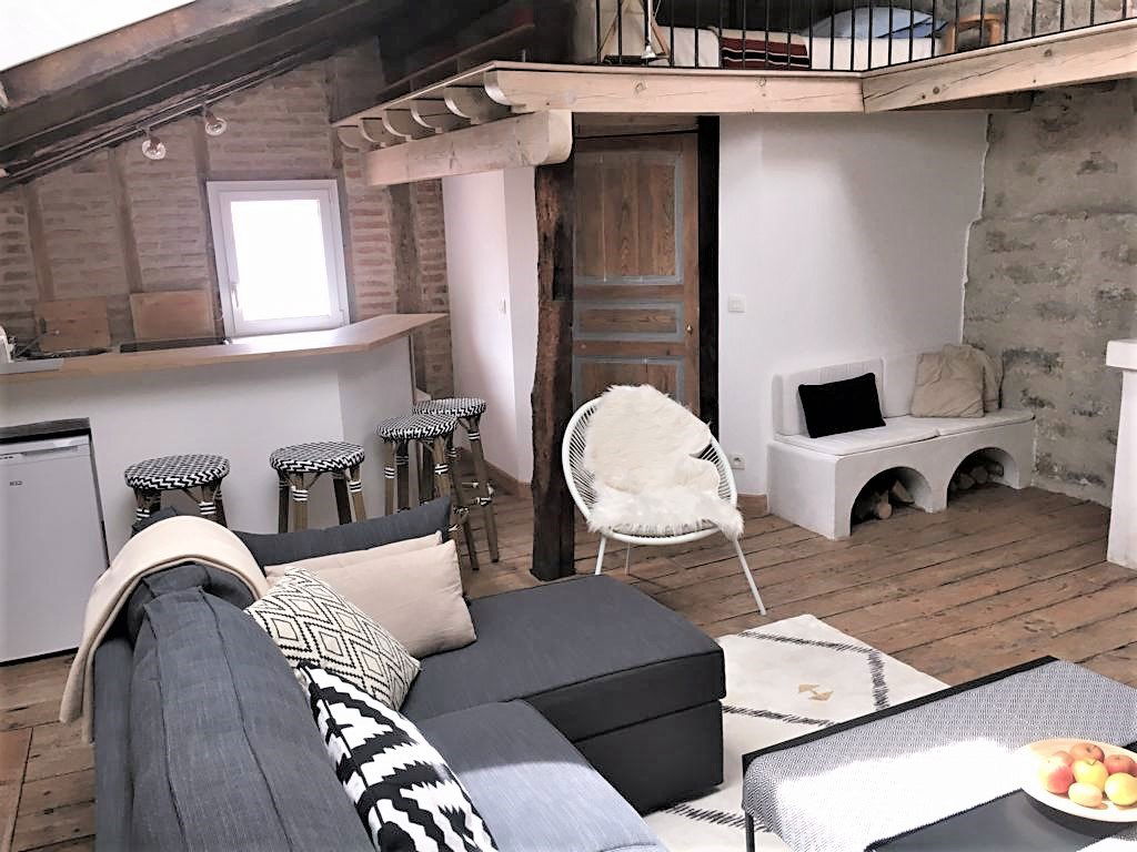 Studio located on 3th floor, without elevator, with comfortable furnishings. Living room with sitting area. Basic open kitchen with 3 hotplates. 1 mezzanine bedroom with 1 double bed (160cm) and 1 double folding bed (140cm). Bedroom with terrase.