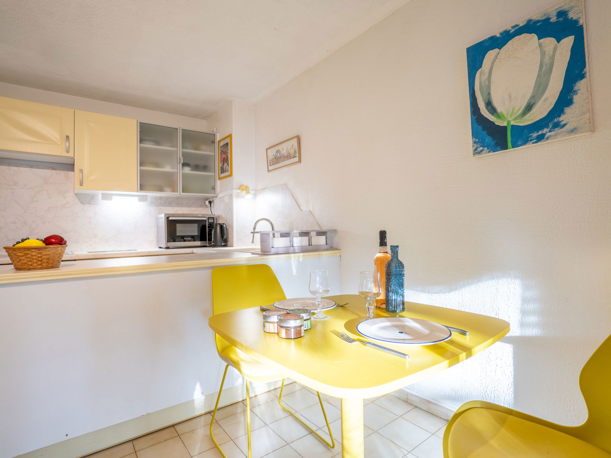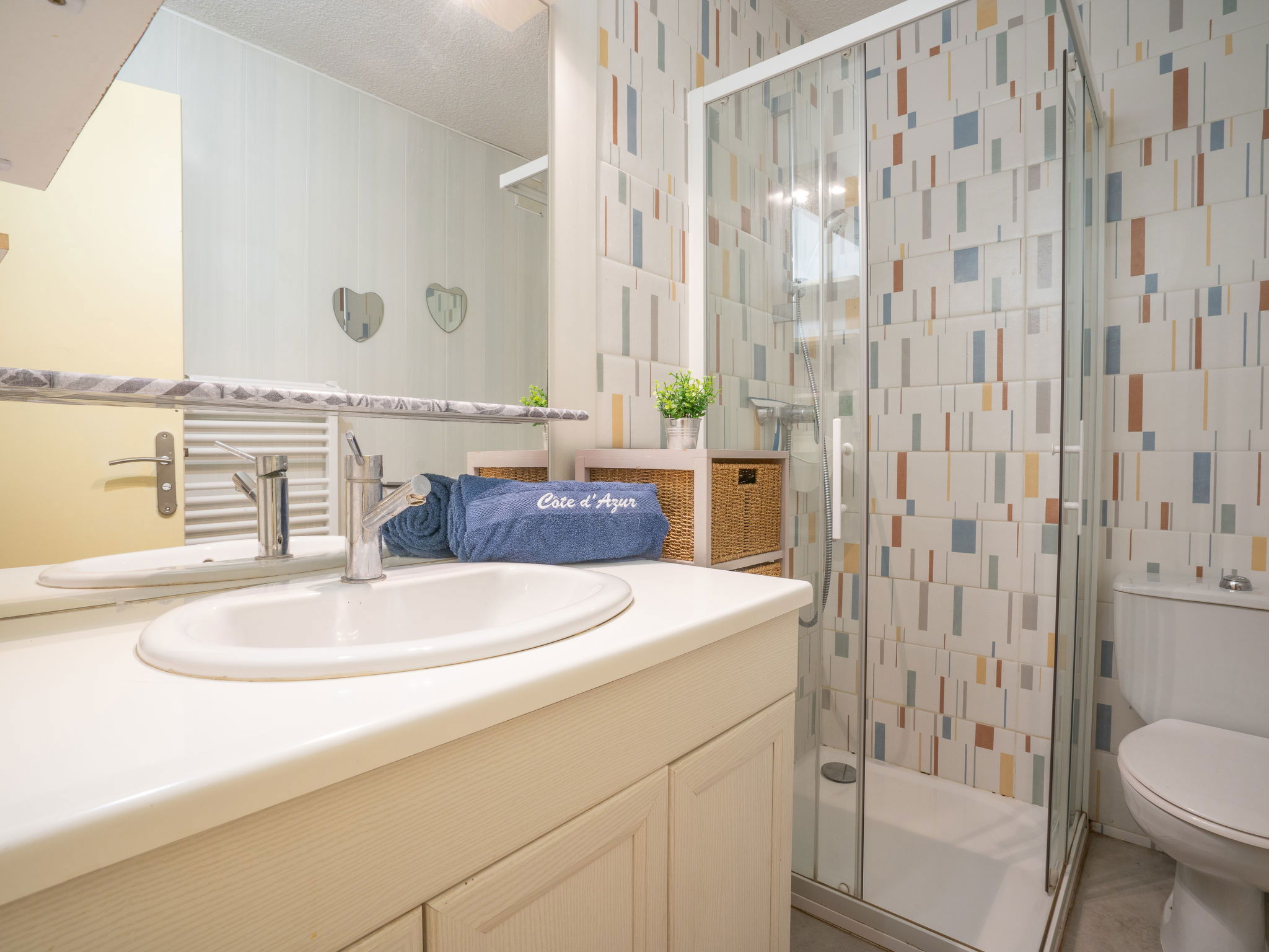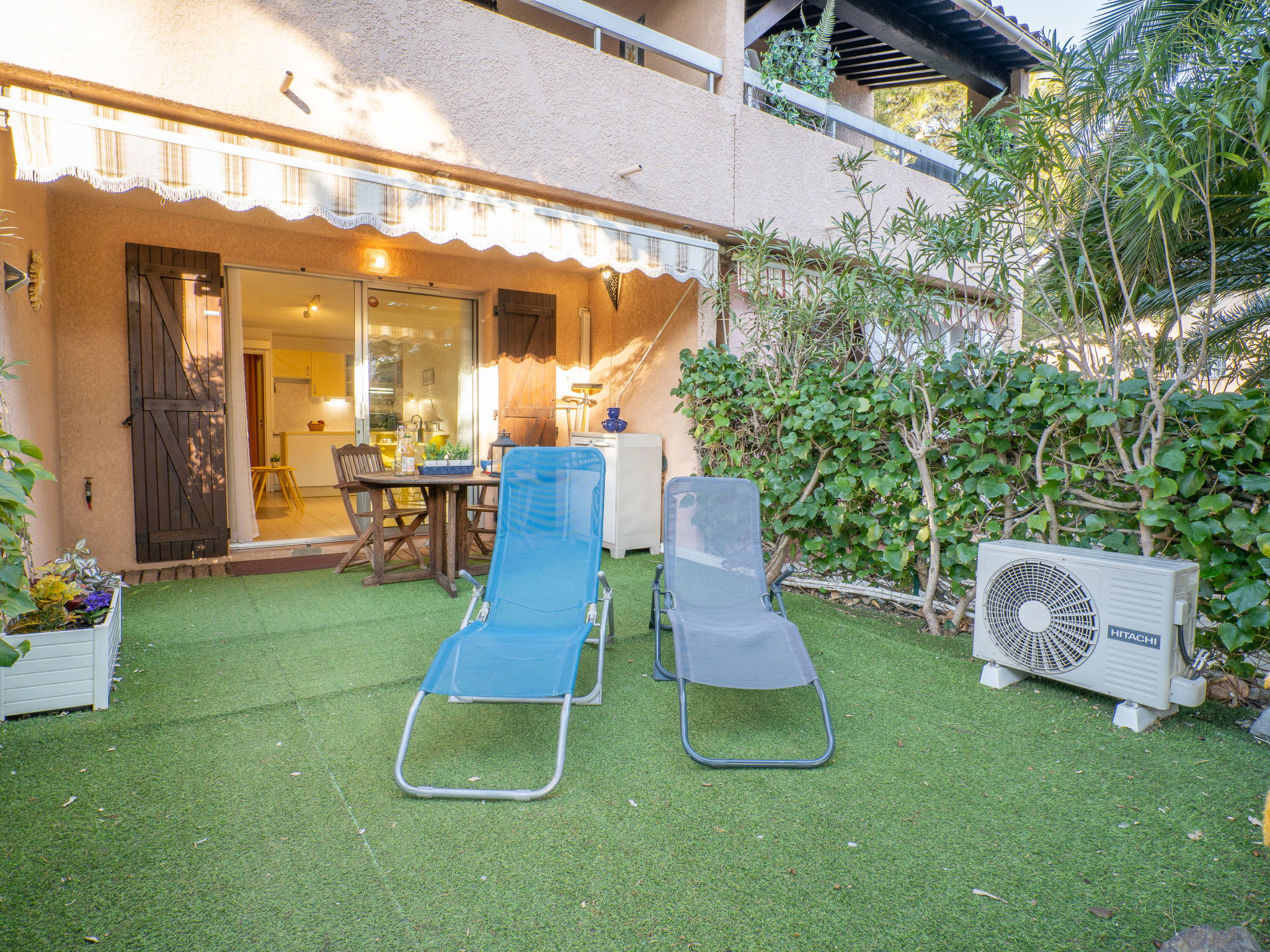 1-room studio 30 m2, on the ground floor, south facing position. Object suitable for 2 adults. Comfortable and beautiful furnishings: living/dining room with panoramic window Dressing room with 1 double sofabed (1 x 160 cm, length 200 cm), TV (flat screen), air conditioning. Exit to the garden, to the terrace. Kitchenette (oven, dishwasher, 4 ceramic glass hob hotplates, toaster, kettle, microwave, freezer, electric coffee machine). Shower/WC. Heating. Terrace 10 m2, patio 40 m2. Terrace furniture, deck chairs (2). Facilities: washing machine, iron, hair dryer. Internet (WiFi, free). Parking space n 102 (fenced 1 car). Please note: smoke alarm. FJS877HT
