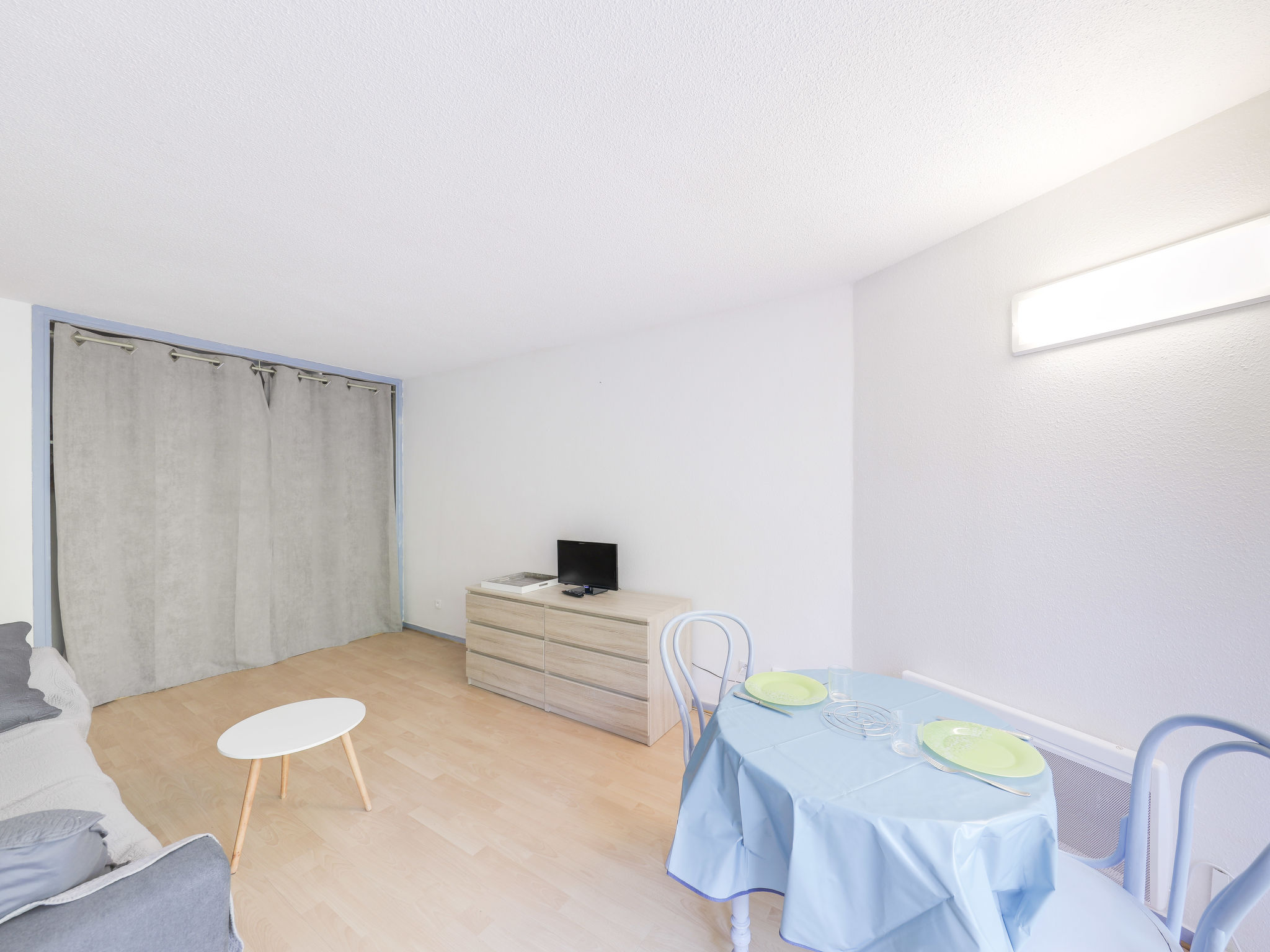 1-room studio 30 m2, on the ground floor, south-west facing position. Simple and comfortable furnishings: living/dining room with panoramic window with 1 double sofabed (1 x 160 cm, length 200 cm), TV (flat screen), electric heater and fan. Exit to the terrace. Small kitchen (oven, 2 induction hot plates, toaster, kettle, microwave, freezer, electric coffee machine, Capsules for coffee machine (Senseo) extra). Bath/WC. Terrace 7 m2. Terrace furniture. Facilities: washing machine, iron, hair dryer. Internet (WiFi, extra). Parking space n 137 (1 car). Please note: maximum 1 small pet/ dog allowed. TV only FR. Smoke alarm. FJS1150HT