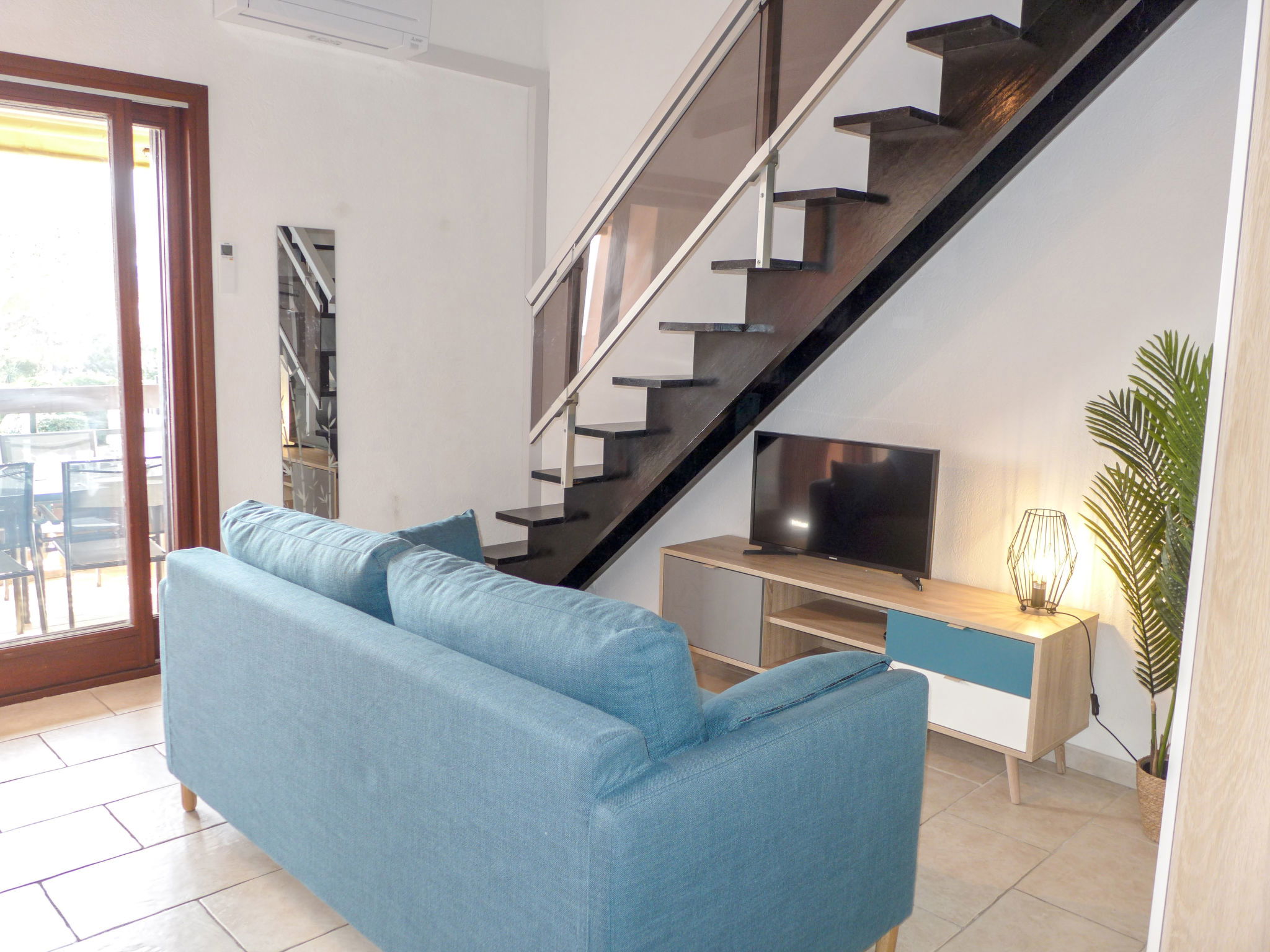 1-room studio 38 m2 on 2 levels on 2nd floor, south facing position. Object suitable for 2 adults + 2 children. Partly with sloping ceilings, simple and beautiful furnishings: living/dining room with 1 double sofabed (1 x 140 cm, length 190 cm), TV (flat screen), air conditioning. Exit to the terrace. Kitchenette (oven, 2 ceramic glass hob hotplates, toaster, kettle, freezer, electric coffee machine, combination microwave). Shower/WC. Heating. Upper floor: (steep stair) gallery with sloping ceilings, ceiling height 80 - 180 cm with 1 french bed (1 x 160 cm, length 200 cm). Terrace 10 m2, roofed. Terrace furniture. Facilities: washing machine, iron, hair dryer. Internet (WiFi, free). Parking space n 30 (fenced 1 car). Please note: apartment street side. TV only FR. Smoke alarm, no lift. Partial view of the sea and the swimming pool from the terrace. Small freezer. Instead of an enclosed bedroom, some sleeping areas are located in an open-plan area (gallery, alcove, etc.). FJS1143HT